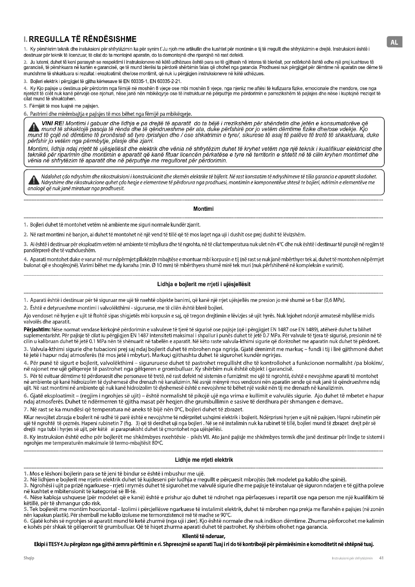 VINI RE! Montimi i gabuar dhe lidhja e pa drejtë të aparatit do ta bëjë i rrezikshëm për shëndetin dhe jetën e konsumatorëve që mund të shkaktojë pasoja të rënda dhe të qëndrueshme për ata, duke përfshirë por jo vetëm dëmtime zike dhe/ose vdekje. Kjo mund të çojë në dëmtime të pronësisë së tyre /prishjen dhe / ose shkatrimin e tyre/, sikurese të asaj të palëve të tretë të shkaktuara, duke përfshir jo vetëm nga përmbytje, plasje dhe zjarri. Montimi, lidhja ndaj rrjetit të ujësjellësit dhe elektrik dhe vënia në shfrytëzim duhet të kryhet vetëm nga një teknik i kualikuar elektricist dhe teknikë për riparimin dhe montimin e aparatit që kanë tuar licencën përkatëse e tyre në territorin e shtetit në të cilin kryhen montimet dhe vënia në shfrytëzim të aparatit dhe në përputhje me rregulloret për përdorimin. Ndalohet çdo ndryshim dhe rikostruksioni i konstrukcionit dhe skemën elektrike të bijlerit. Në rast konstatim të ndryshimeve të tilla garancia e aparatit skadohet. Ndryshime dhe rikostrukcione quhet çdo heqje e elementeve të përdorura nga prodhuesi, montimin e komponentëve shtesë te bojleri, ndrimin e elementëve me analogë që nuk janë miratuar nga prodhuesit.