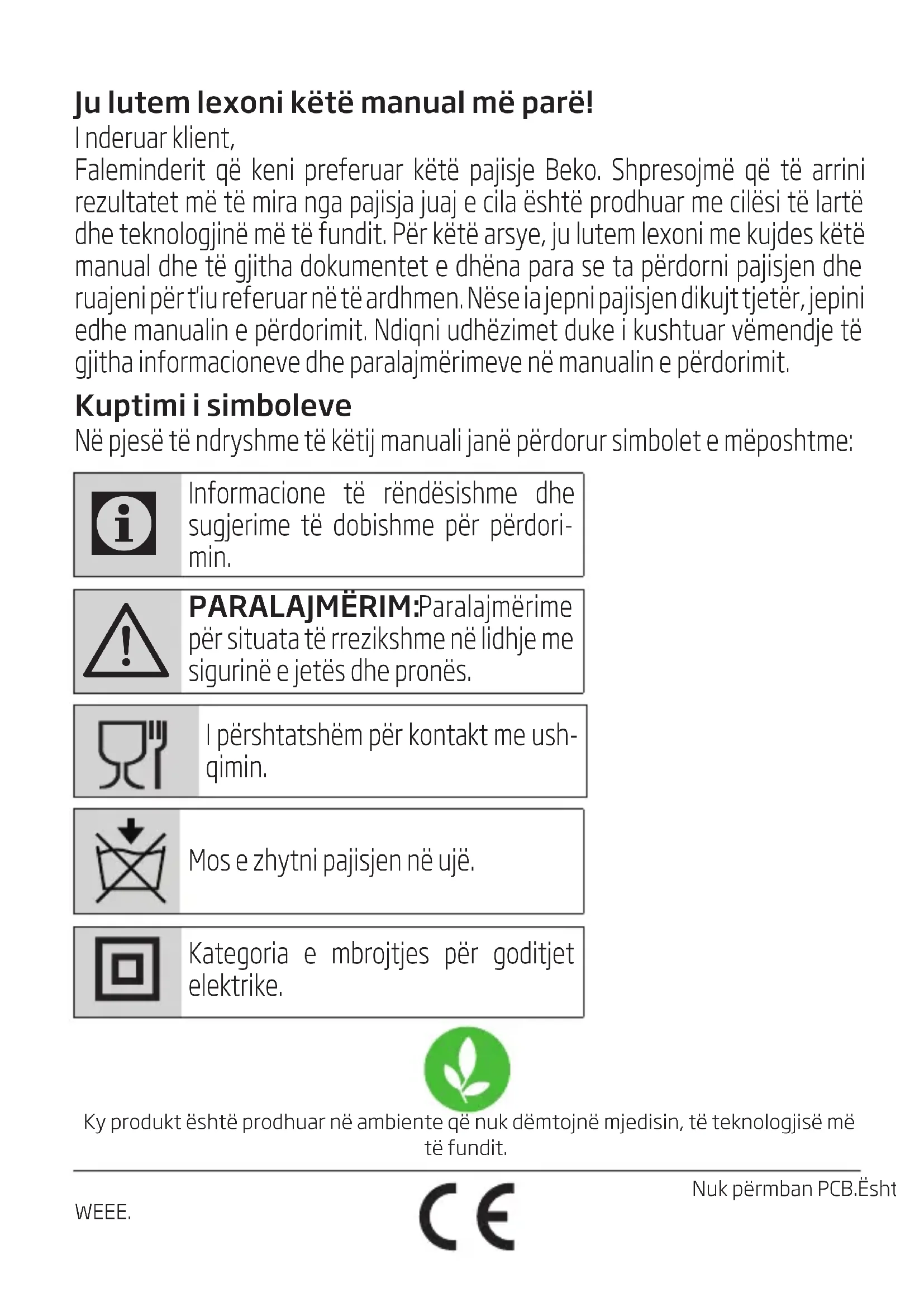 Чистење и одржувањеJu lutem lexoni këtë manual më parë! I nderuar klient, Faleminderit që keni preferuar këtë pajisje Beko. Shpresojmë që të arrini rezultatet më të mira nga pajisja juaj e cila është prodhuar me cilësi të lartë dhe teknologjinë më të fundit. Për këtë arsye, ju lutem lexoni me kujdes këtë manual dhe të gjitha dokumentet e dhëna para se ta përdorni pajisjen dhe ruajeni për t'iu referuar në të ardhmen. Nëse ia jepni pajisjen dikujt tjetër, jepini edhe manualin e përdorimit. Ndiqni udhëzimet duke i kushtuar vëmendje të gjitha informacioneve dhe paralajmërimeve në manualin e përdorimit. Kuptimi i simboleve Në pjesë të ndryshme të këtij manuali janë përdorur simbolet e mëposhtme: