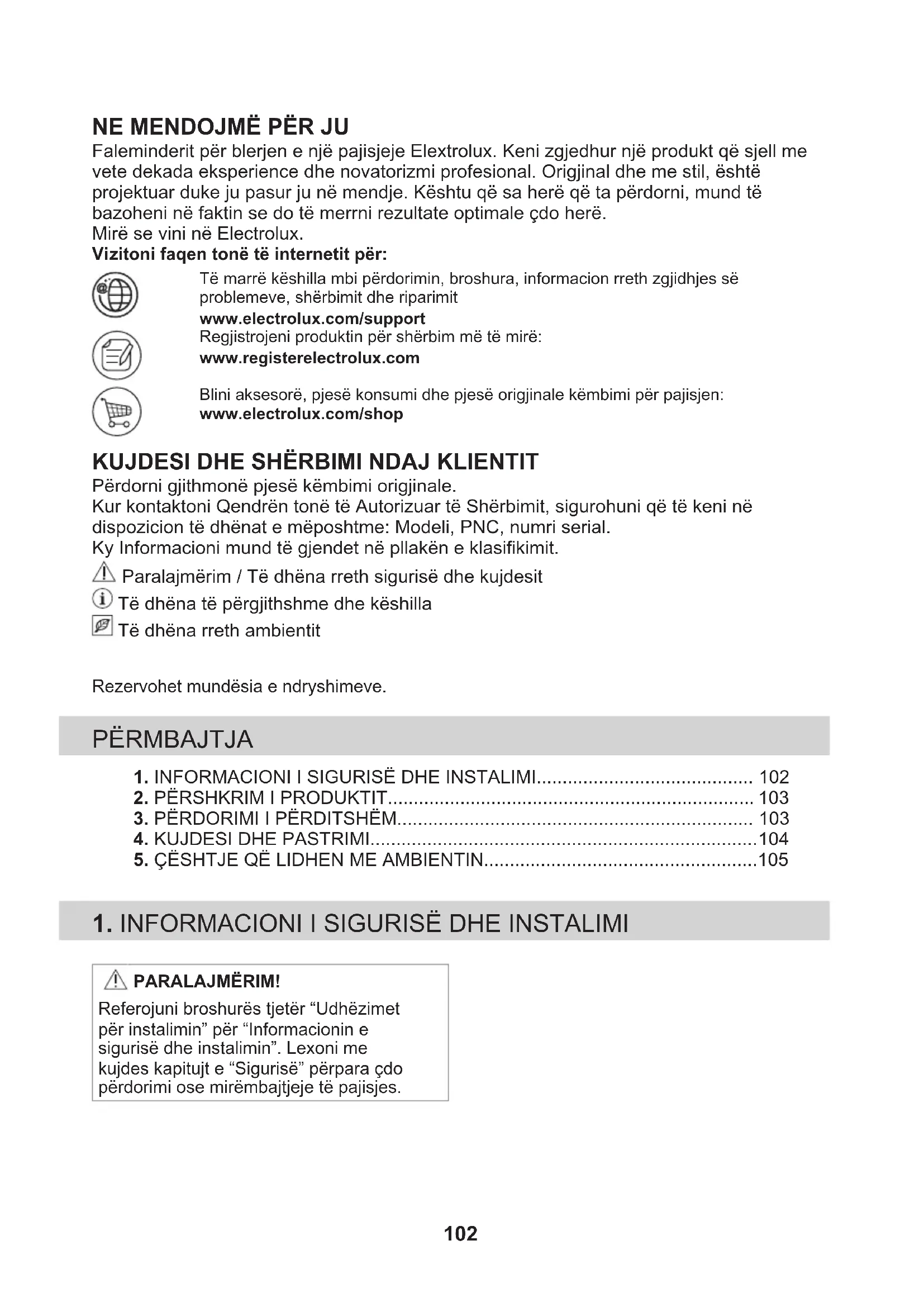 Faleminderit për blerjen e një pajisjeje Elextrolux. Keni zgjedhur një produkt që sjell me vete dekada eksperience dhe novatorizmi profesional. Origjinal dhe me stil, është projektuar duke ju pasur ju në mendje. Kështu që sa herë që ta përdorni, mund të bazoheni në faktin se do të merrni rezultate optimale çdo herë. Mirë se vini në Electrolux. Vizitoni faqen tonë të internetit për: Të marrë këshilla mbi përdorimin, broshura, informacion rreth zgjidhjes sëproblemeve, shërbimit dhe riparimitwww.electrolux.com/supportRegjistrojeni produktin për shërbim më të mirë:www.registerelectrolux.comBlini aksesorë, pjesë konsumi dhe pjesë origjinale këmbimi për pajisjen:www.electrolux.com/shop