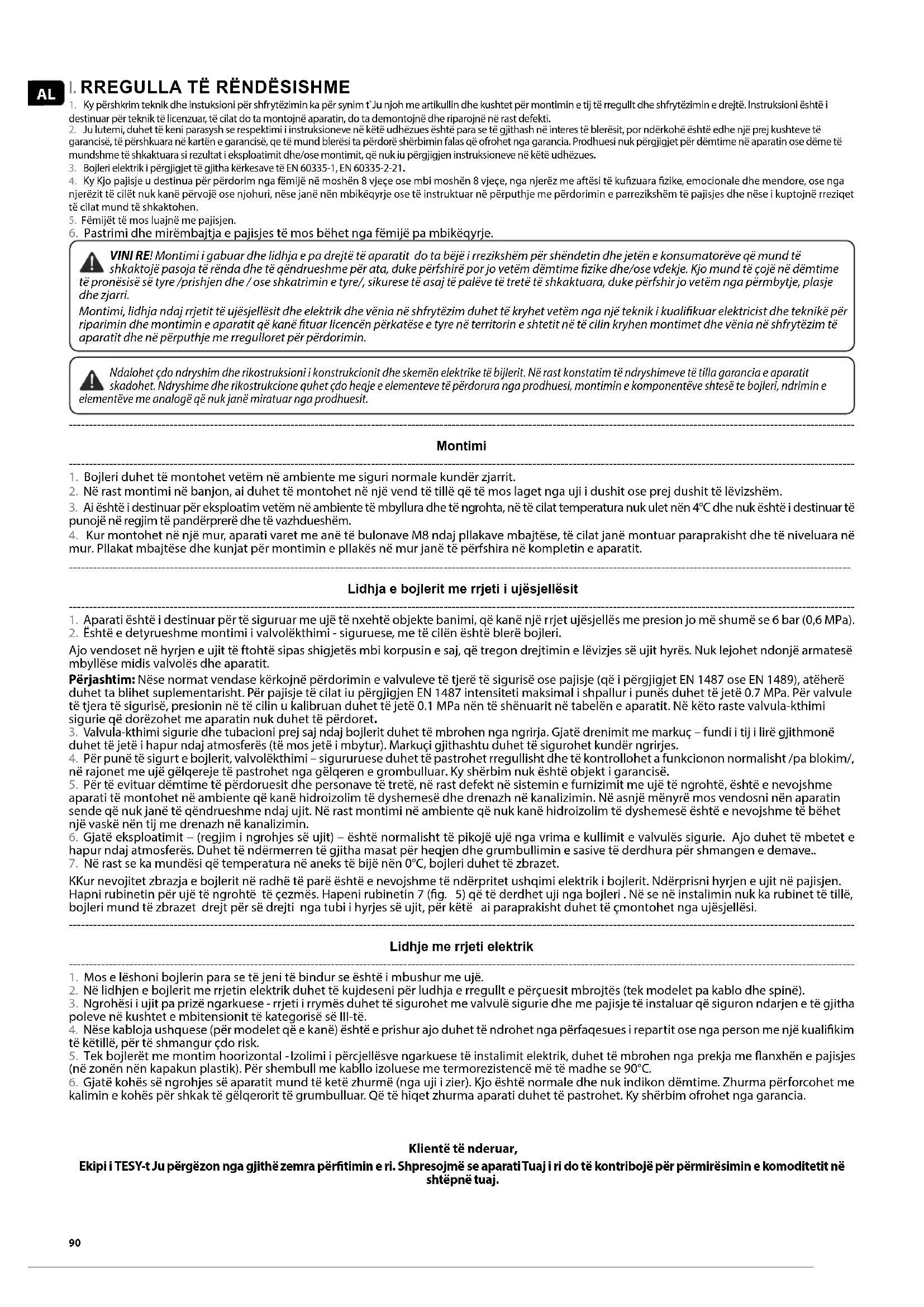 VINI RE! Montimi i gabuar dhe lidhja e pa drejtë të aparatit do ta bëjë i rrezikshëm për shëndetin dhe jetën e konsumatorëve që mund të shkaktojë pasoja të rënda dhe të qëndrueshme për ata, duke përfshirë por jo vetëm dëmtime zike dhe/ose vdekje. Kjo mund të çojë në dëmtime të pronësisë së tyre /prishjen dhe / ose shkatrimin e tyre/, sikurese të asaj të palëve të tretë të shkaktuara, duke përfshir jo vetëm nga përmbytje, plasje dhe zjarri. Montimi, lidhja ndaj rrjetit të ujësjellësit dhe elektrik dhe vënia në shfrytëzim duhet të kryhet vetëm nga një teknik i kualikuar elektricist dhe teknikë për riparimin dhe montimin e aparatit që kanë tuar licencën përkatëse e tyre në territorin e shtetit në të cilin kryhen montimet dhe vënia në shfrytëzim të aparatit dhe në përputhje me rregulloret për përdorimin. Ndalohet çdo ndryshim dhe rikostruksioni i konstrukcionit dhe skemën elektrike të bijlerit. Në rast konstatim të ndryshimeve të tilla garancia e aparatit skadohet. Ndryshime dhe rikostrukcione quhet çdo heqje e elementeve të përdorura nga prodhuesi, montimin e komponentëve shtesë te bojleri, ndrimin e elementëve me analogë që nuk janë miratuar nga prodhuesit.