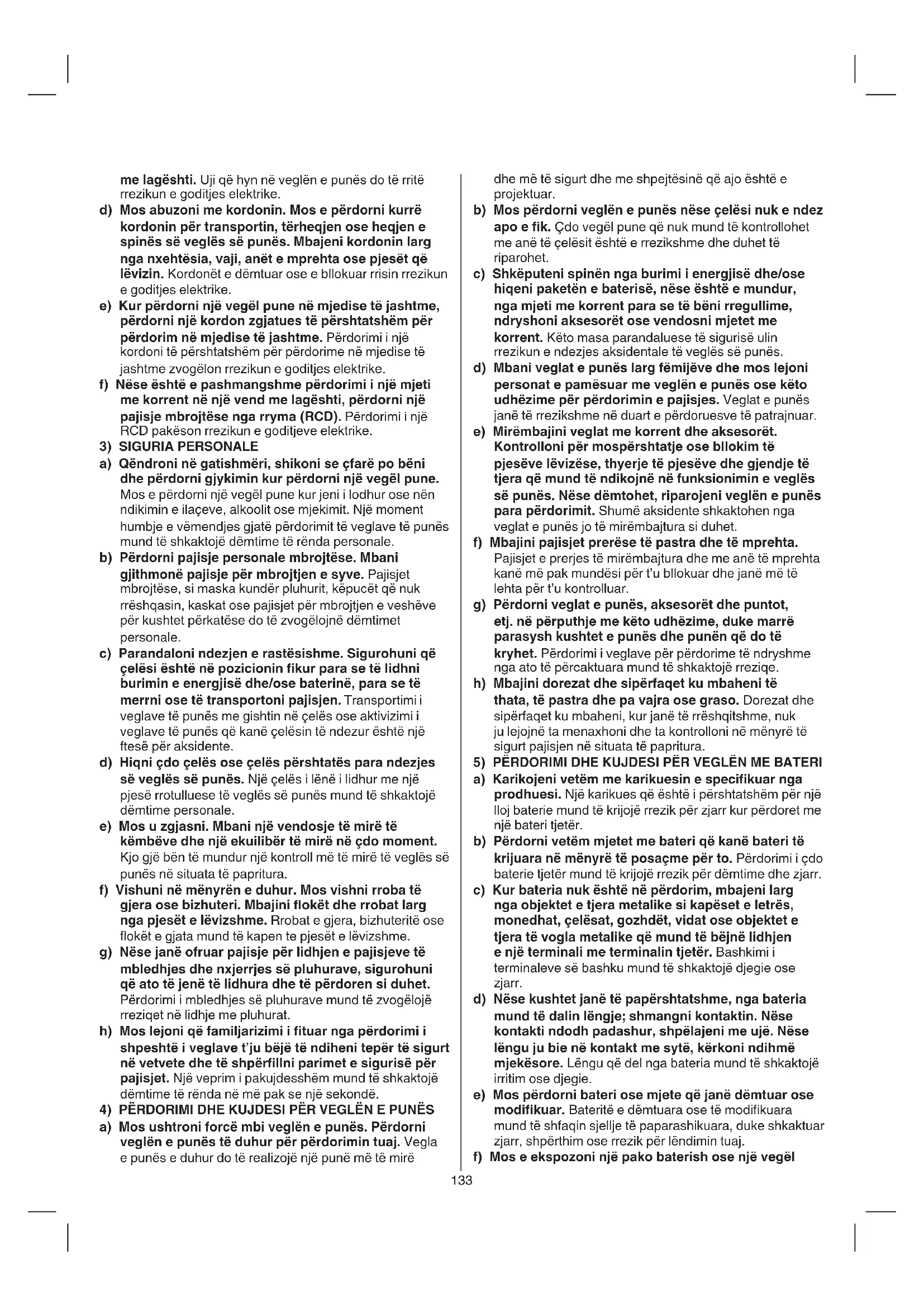 a) Karikojeni vetëm me karikuesin e specikuar nga prodhuesi. Një karikues që është i përshtatshëm për një lloj baterie mund të krijojë rrezik për zjarr kur përdoret me një bateri tjetër. b) Përdorni vetëm mjetet me bateri që kanë bateri të krijuara në mënyrë të posaçme për to. Përdorimi i çdo baterie tjetër mund të krijojë rrezik për dëmtime dhe zjarr. c) Kur bateria nuk është në përdorim, mbajeni larg nga objektet e tjera metalike si kapëset e letrës, monedhat, çelësat, gozhdët, vidat ose objektet e tjera të vogla metalike që mund të bëjnë lidhjen e një terminali me terminalin tjetër. Bashkimi i terminaleve së bashku mund të shkaktojë djegie ose zjarr. d) Nëse kushtet janë të papërshtatshme, nga bateria mund të dalin lëngje; shmangni kontaktin. Nëse kontakti ndodh padashur, shpëlajeni me ujë. Nëse lëngu ju bie në kontakt me sytë, kërkoni ndihmë mjekësore. Lëngu që del nga bateria mund të shkaktojë irritim ose djegie. e) Mos përdorni bateri ose mjete që janë dëmtuar ose modikuar. Bateritë e dëmtuara ose të modikuara mund të shfaqin sjellje të paparashikuara, duke shkaktuar zjarr, shpërthim ose rrezik për lëndimin tuaj. f) Mos e ekspozoni një pako baterish ose një vegël me lagështi. Uji që hyn në veglën e punës do të rritë rrezikun e goditjes elektrike. d) Mos abuzoni me kordonin. Mos e përdorni kurrë kordonin për transportin, tërheqjen ose heqjen e spinës së veglës së punës. Mbajeni kordonin larg nga nxehtësia, vaji, anët e mprehta ose pjesët që lëvizin. Kordonët e dëmtuar ose e bllokuar rrisin rrezikun e goditjes elektrike. e) Kur përdorni një vegël pune në mjedise të jashtme, përdorni një kordon zgjatues të përshtatshëm për përdorim në mjedise të jashtme. Përdorimi i një kordoni të përshtatshëm për përdorime në mjedise të jashtme zvogëlon rrezikun e goditjes elektrike. f) Nëse është e pashmangshme përdorimi i një mjeti me korrent në një vend me lagështi, përdorni një pajisje mbrojtëse nga rryma (RCD). Përdorimi i një RCD pakëson rrezikun e goditjeve elektrike.