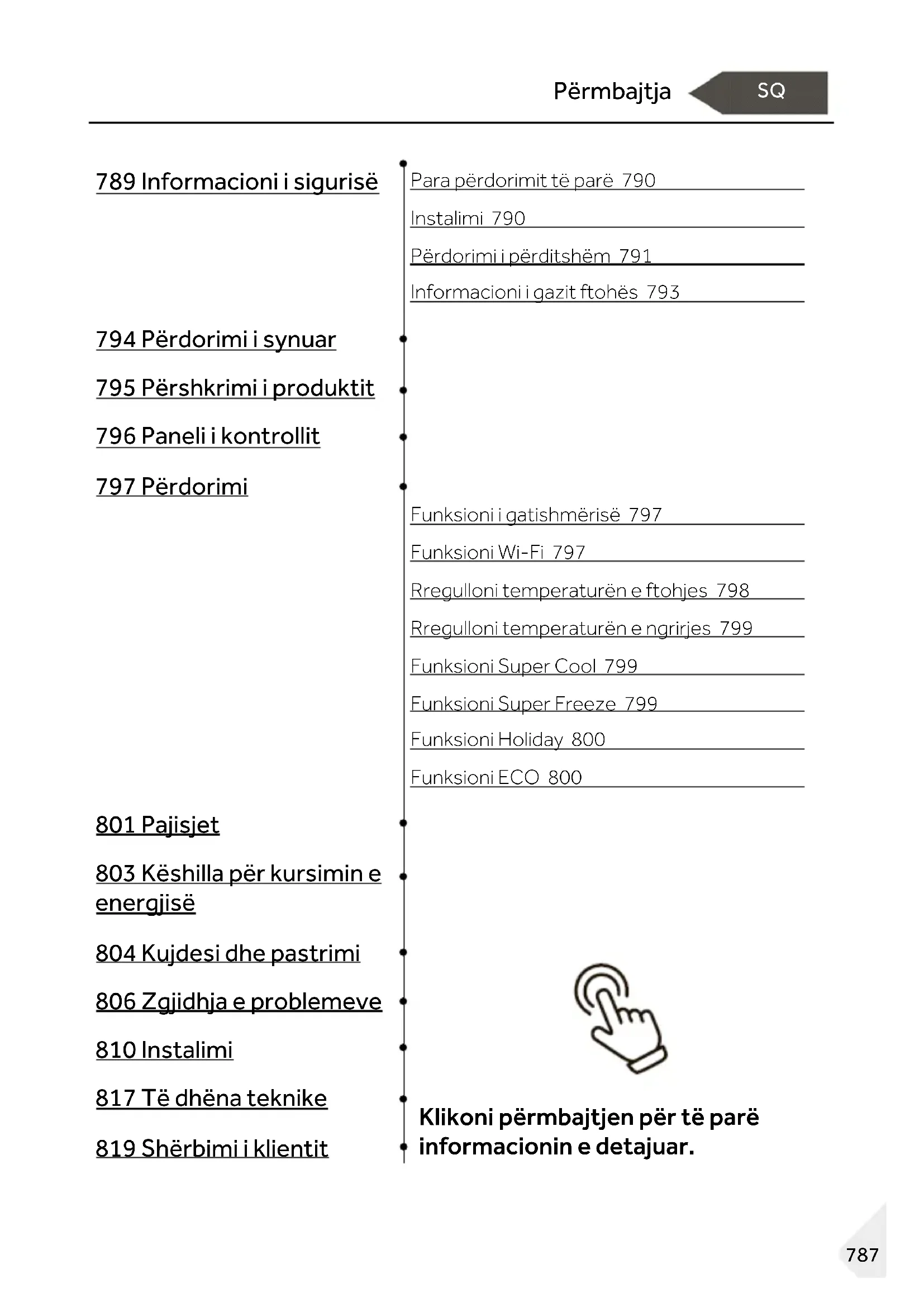 803 Këshilla për kursimin e energjisë 804 Kujdesi dhe pastrimi 806 Zgjidhja e problemeve 810 Instalimi 817 Të dhëna teknike Klikoni përmbajtjen për të parë informacionin e detajuar. 819 Shërbimi i klientitFaleminderit