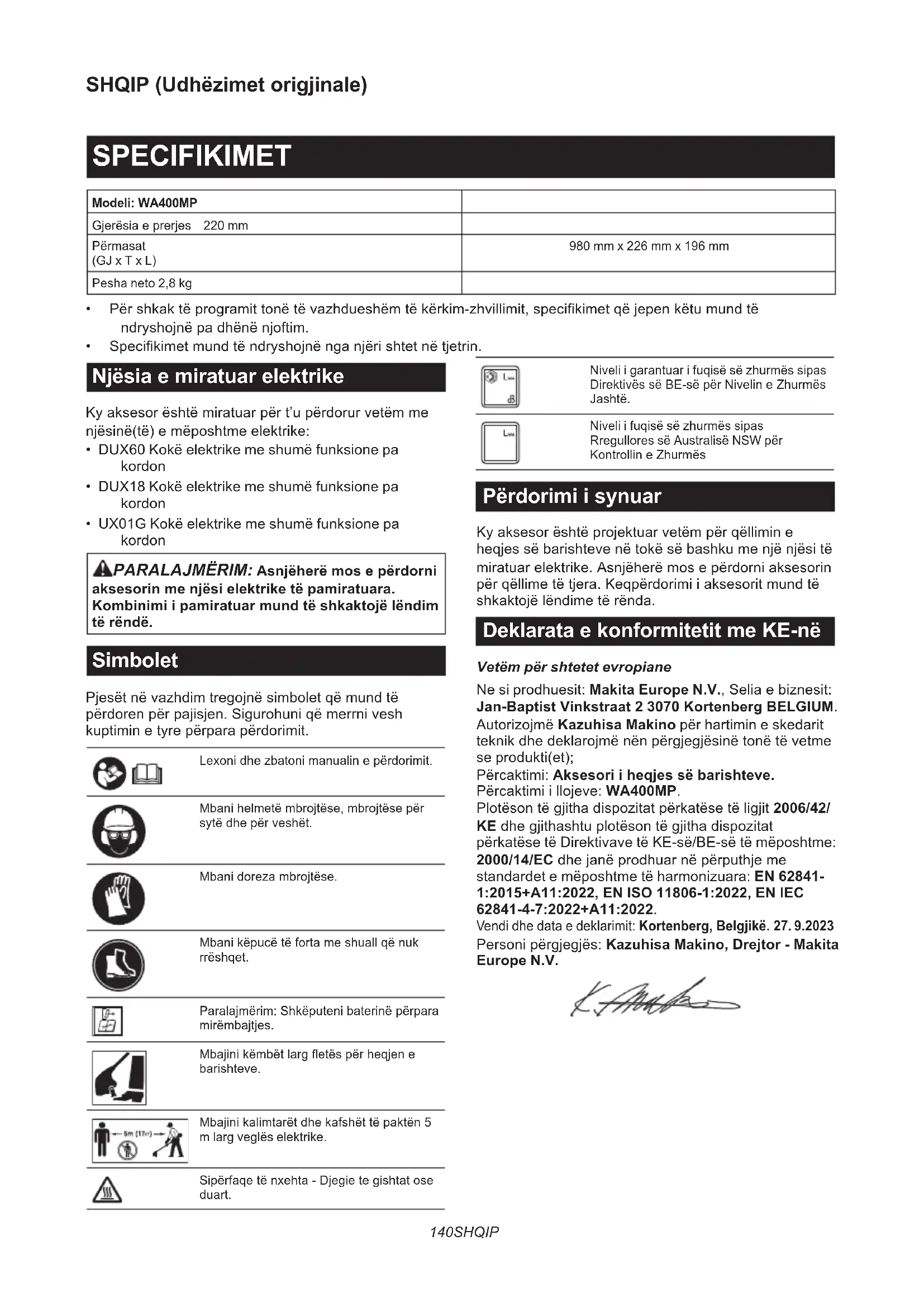 - UX01G Kokë elektrike me shumë funksione pa kordon PARALAJMËRIM: Asnjëherë mos e përdorni aksesorin me njësi elektrike të pamiratuara. Kombinimi i pamiratuar mund të shkaktojë lëndim të rëndë. Simbolet Pjesëtnëvazhdimtregojnësimboletqëmundtë përdorenpërpajisjen.Sigurohuniqëmerrnivesh kuptiminetyrepërparapërdorimit. Lexonidhezbatonimanualinepërdorimit. Mbanihelmetëmbrojtëse,mbrojtësepër sytëdhepërveshët. Mbanidorezambrojtëse. Mbanikëpucëtëfortameshuallqënuk rrëshqet. Paralajmërim:Shkëputenibaterinëpërpara mirëmbajtjes. Mbajinikëmbëtlargetëspërheqjene barishteve. Mbajinikalimtarëtdhekafshëttëpaktën5 m larg veglës elektrike. Sipërfaqetënxehta-Djegietegishtatose duart. Niveli i garantuar i fuqisë së zhurmës sipas DirektivëssëBE-sëpërNivelineZhurmës Jashtë. Niveli i fuqisë së zhurmës sipas Rregullores së Australisë NSW për KontrollineZhurmës Përdorimi i synuar Kyaksesorështëprojektuarvetëmpërqëllimine heqjessëbarishtevenëtokësëbashkumenjënjësitë miratuarelektrike.Asnjëherëmosepërdorniaksesorin përqëllimetëtjera.Keqpërdorimiiaksesoritmundtë shkaktojëlëndimetërënda. Deklarata e konformitetit me KE-në Vetëm për shtetet evropiane Ne si prodhuesit: Makita Europe N.V.,Seliaebiznesit: Jan-Baptist Vinkstraat 2 3070 Kortenberg BELGIUM. AutorizojmëKazuhisa Makino për hartimin e skedarit teknikdhedeklarojmënënpërgjegjësinëtonëtëvetme se produkti(et); Përcaktimi: Aksesori i heqjes së barishteve. Përcaktimiillojeve:WA400MP. Plotësontëgjithadispozitatpërkatësetëligjit2006/42/ KEdhegjithashtuplotësontëgjithadispozitat përkatëse të Direktivave të KE-së/BE-së të mëposhtme: 2000/14/ECdhejanëprodhuarnëpërputhjeme standardet e mëposhtme të harmonizuara: EN 62841-