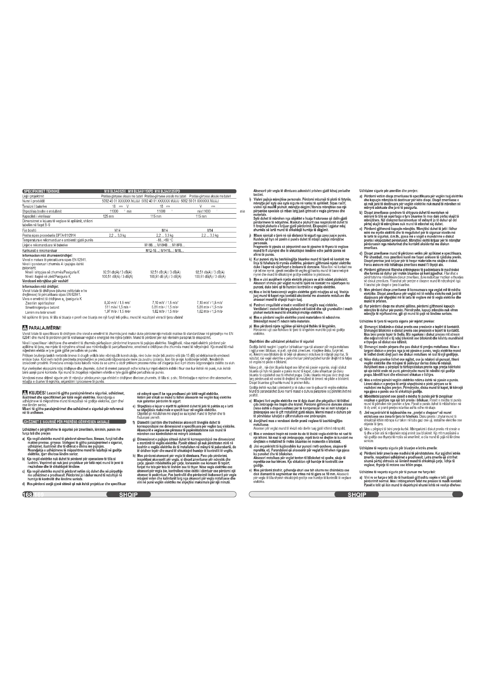 /pasiguria K Zmerilim sipërfaqësor Smerilimi/prerja e betonit Lëmim me letër smeril KUJDES! Lexoni të gjitha paralajmërimet e sigurisë, udhëzimet, ilustrimet dhe specifi kimet për këtë vegël elektrike. Mosndjekja e udhëzimeve të mëposhtme mund të rezultojë në goditje elektrike, zjarr dhe/ ose lëndim serioz. Mbani të gjitha paralajmërimet dhe udhëzimet e sigurisë për referencë në të ardhmen. UDHËZIMET E SIGURISË PËR PRERËSE-GËRRYESEN AKSIALE Udhëzimet e përgjithshme të sigurisë për zmerilimin, lëmimin, punën me furça teli dhe prerjen a) Kjo vegël elektrike mund të përdoret sizmerilues, lëmues, furçë teli dhe makinë prerëse. grryese. Vëzhgoni të gjitha paralajmërimet e sigurisë, udhëzimet, ilustrimet dhe të dhënat e dhëna me pajisjen. Mosndjekja e udhëzimeve të mëposhtme mund të rezultojë në goditje elektrike, zjarr dhe/ose lëndim serioz. b) Kjo vegël elektrike nuk duhet të përdoret për operacione të tilla si lustrimi. Veprimet që nuk janë projektuar për këtë mjet mund të jenë të rrezikshme dhe të shkaktojnë lëndime. c) Kjo vegël elektrike mund të përdoret vetëm siç duhet dhe në përputhje me udhëzimet e prodhuesit. Përdorimi jo i duhur mund të rezultojë në humbje të kontrollit dhe lëndime serioze. d) Mos përdorni asnjë pjesë shtesë që nuk është projektuar dhe specifi kuar në mënyrë specifi ke nga prodhuesi për këtë vegël elektrike. Vetëm për shkak se mund ta lidhni aksesorin me veglën tuaj elektrike nuk garanton përdorim të sigurt. e) Shpejtësia e lejuar e mjetit të aplikimit duhet të jetë të paktën aq e lartë sa shpejtësia maksimale e specifi kuar në veglën elektrike. Objektet që rrotullohen më shpejt se sa lejohet mund të thyhen dhe të fl uturojnë përreth. f) Diametri i jashtëm dhe trashësiae aksesorit tëveglës duhet të korrespondojnë me dimensionet e specifi kuara për veglën tuaj elektrike. Aksesorët e veglave me përmasa të papërshtatshme nuk mund të mbrohen ose kontrollohen në mënyrë adekuate. g) Dimensionet e pajisjes shtesë duhet të korrespondojnë me dimensionet e montimit të veglës elektrike. Pjesët shtesë që nuk përshtaten mirë në boshtin e veglës elektrike do të rrotullohen në mënyrë të pabarabartë, do të dridhen tepër dhe mund të shkaktojnë humbje të kontrollit të veglës. h) Mos përdorni aksesorë për vegla të dëmtuara. Para çdo përdorimi, inspektoni aksesorët për vegla, si disqet zmeriluese për ndryshk dhe çarje, pjesën mbështetës për çarje, konsumim ose konsum të tepërt, furçat me tela për tela të lirshëm ose të thyer. Nëse vegla elektrike ose aksesori për vegla bie, kontrolloni nëse është i dëmtuar ose përdorni një aksesor të padëmtuar. Pas kontrollit dhe përdorimit tëaksesorit për vegla mbajeni veten dhe kalimtarët larg nga aksesori për vegla rrotulluese dhe vini në punë veglën elektrike me shpejtësi maksimale për një minutë. Në aplikime të tjera, të tilla si bluarja e prerë ose bluarja me një furçë teli çeliku, mund të rezultojnë vlera të tjera vibrimi! PARALAJMËRIM! Vlerat totale të specifi kuara të dridhjeve dhe vlerat e emetimit të zhurmës janë matur duke përdorur një metodë matëse të standardizuar në përputhje me EN 62841 dhe mund të përdoren për të krahasuar veglat e energjisë me njëra-tjetrën. Mund të përdoret për një vlerësim paraprak të ekspozimit. Niveli i specifi kuar i dridhjeve dhe emetimit të zhurmës përfaqëson përdorimet kryesore të pajisjes elektrike. Megjithatë, nëse mjeti elektrik përdoret për aplikime të tjera, me mjete të ndryshme shtesë ose mirëmbajtje të pamjaftueshme, emetimet e dridhjeve dhe zhurmës mund të ndryshojnë. Kjo mund të rrisë ndjeshëm efektin e tyre gjatë gjithë periudhës së punës. Prilikom brušenja tankih metalnih limova ili drugih velikih lako vibrirajućih konstrukcija, nivo buke može biti znatno viši (do 15 dB) od deklarisanih vrednosti emisije buke. Kod ovih radnih predmeta preporučljivo je preduzeti odgovarajuće mere za zvučnu izolaciju, kao što je npr. korišćenje teških, fl eksibilnih izolacionih prostirki. Povećana emisija buke takođe mora da se uzme u obzir prilikom procene rizika od izlaganja buci i pri izboru odgovarajuće zaštite za sluh. Kur vlerësohet ekspozimi ndaj dridhjeve dhe zhurmës, duhet të merret parasysh edhe koha kur mjeti elektrik është i fi kur ose kur është në punë, nuk është bërë asnjë punë konkrete. Kjo mund të zvogëlojë ndjeshëm efektin e tyre gjatë gjithë periudhës së punës. Vendosni masa shtesë sigurie për të mbrojtur përdoruesin nga efektet e dridhjeve dhe/ose zhurmës, të tilla si: p.sh.: Mirëmbajtja e mjeteve dhe aksesorëve, mbajtja e duarve të ngrohta, organizimi i proceseve të punës. Prerëse-gërryese aksiale me bateri Prerëse-gërryese aksiale me bateri Prerëse-gërryese aksiale me bateri170 171SHQIP SHQIP lëkurë të hollë. b) Nëse rekomandohet një kapuç mbrojtës, parandaloni prekjen e kapuçit mbrojtës dhe furçës së telit. Furçat e diskut dhe fi lxhanit mund të rrisin diametrin e tyre për shkak të presionit të kontaktit dhe forcave centrifugale. INSTRUKSIONE SHTESË PËR SIGURINË DHE PUNËN Gjatë zmerilimit të metaleve, shkëndijat fl uturojnë. Sigurohuni që askush të mos jetë i rrezikuar. Për shkak të rrezikut të zjarrit, nuk duhet të ketë materiale të ndezshme në zonën ku fl uturojnë shkëndijat. Mos përdorni nxjerrjen e pluhurit. Shmangni shkëndijat fl uturuese dhe pluhurin bluar që godet trupin tuaj. Mos u shtrini në zonën e rrezikshme gjatë kohës që makineria punon. Fikeni pajisjen menjëherë nëse ndodhin dridhje të konsiderueshme ose zbulohen defekte të tjera. Kontrolloni makinën për të përcaktuar shkakun. Në kushte ekstreme të funksionimit (p.sh. kur lëmoni metalet me pjesës mbështetëse dhe disqet e zmerilimit së fi brave 