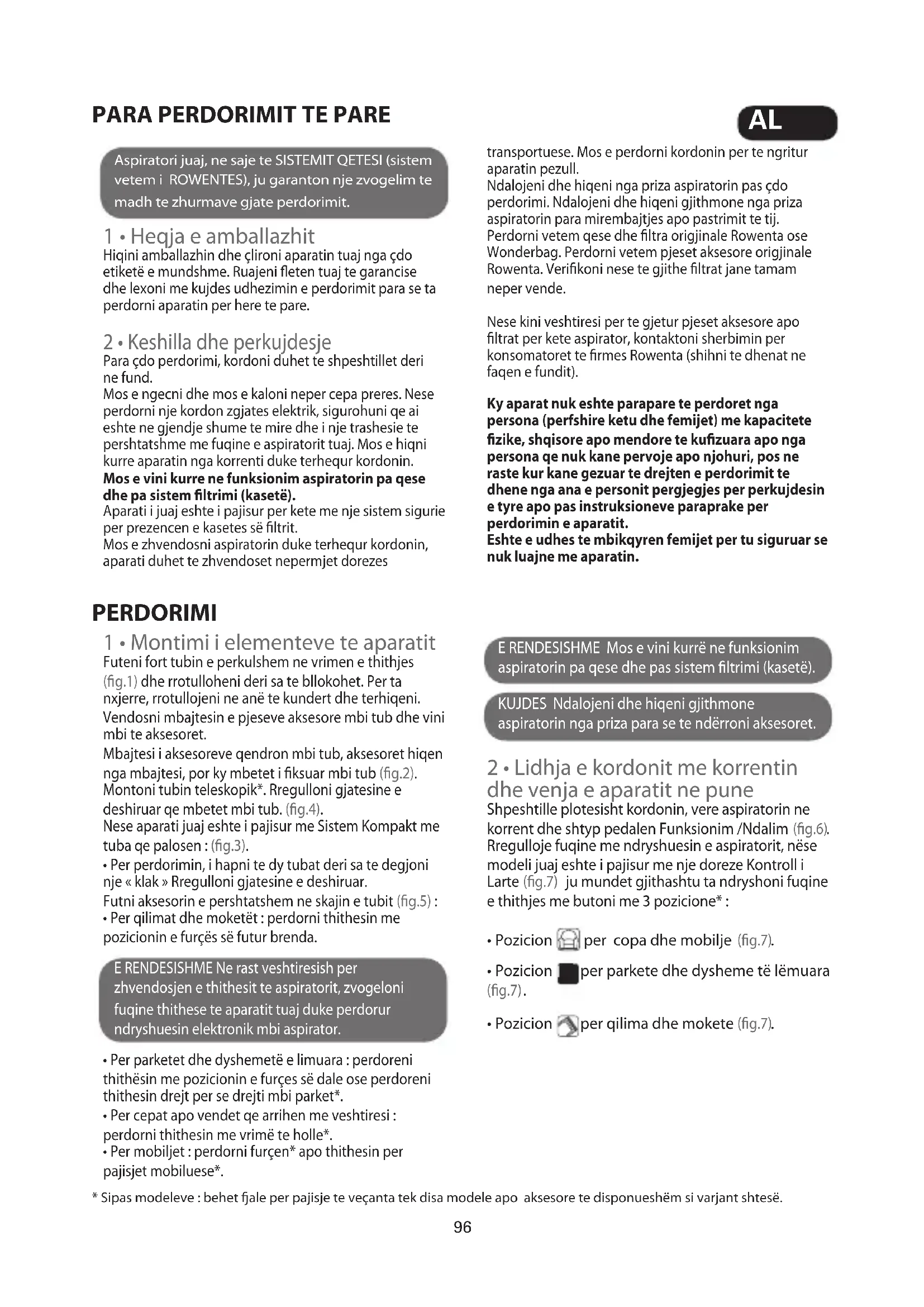 - Sipas modeleve : behet ale per pajisje te veçanta tek disa modele apo aksesore te disponueshëm si varjant shtesë. AL96 1 • Heqja e amballazhit Hiqini amballazhin dhe çlironi aparatin tuaj nga çdo etiketë e mundshme. Ruajeni eten tuaj te garancise dhe lexoni me kujdes udhezimin e perdorimit para se ta perdorni aparatin per here te pare. 2 • Keshilla dhe perkujdesje Para çdo perdorimi, kordoni duhet te shpeshtillet deri ne fund. Mos e ngecni dhe mos e kaloni neper cepa preres. Nese perdorni nje kordon zgjates elektrik, sigurohuni qe ai eshte ne gjendje shume te mire dhe i nje trashesie te pershtatshme me fuqine e aspiratorit tuaj. Mos e hiqni kurre aparatin nga korrenti duke terhequr kordonin. Mos e vini kurre ne funksionim aspiratorin pa qese dhe pa sistem ltrimi (kasetë). Aparati i juaj eshte i pajisur per kete me nje sistem sigurie per prezencen e kasetes së ltrit. Mos e zhvendosni aspiratorin duke terhequr kordonin, aparati duhet te zhvendoset nepermjet dorezes transportuese. Mos e perdorni kordonin per te ngritur aparatin pezull. Ndalojeni dhe hiqeni nga priza aspiratorin pas çdo perdorimi. Ndalojeni dhe hiqeni gjithmone nga priza aspiratorin para mirembajtjes apo pastrimit te tij. Perdorni vetem qese dhe ltra origjinale Rowenta ose Wonderbag. Perdorni vetem pjeset aksesore origjinale Rowenta. Verikoni nese te gjithe ltrat jane tamam neper vende. Nese kini veshtiresi per te gjetur pjeset aksesore apo ltrat per kete aspirator, kontaktoni sherbimin per konsomatoret te rmes Rowenta (shihni te dhenat ne faqen e fundit). Ky aparat nuk eshte parapare te perdoret nga persona (perfshire ketu dhe femijet) me kapacitete zike, shqisore apo mendore te kuzuara apo nga persona qe nuk kane pervoje apo njohuri, pos ne raste kur kane gezuar te drejten e perdorimit te dhene nga ana e personit pergjegjes per perkujdesin e tyre apo pas instruksioneve paraprake per perdorimin e aparatit. Eshte e udhes te mbikqyren femijet per tu siguruar se nuk luajne me aparatin.