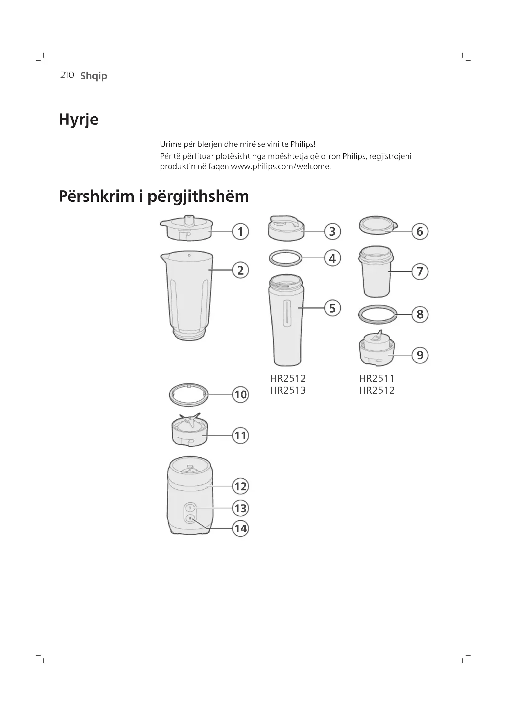 Bluarësja (vetëm HR2511/HR2512) 6 Kapaku i bluarëses 7 Ena e bluarëses 8 Guarnicioni i bluarëses 9 Njësia e teheve të grirëses