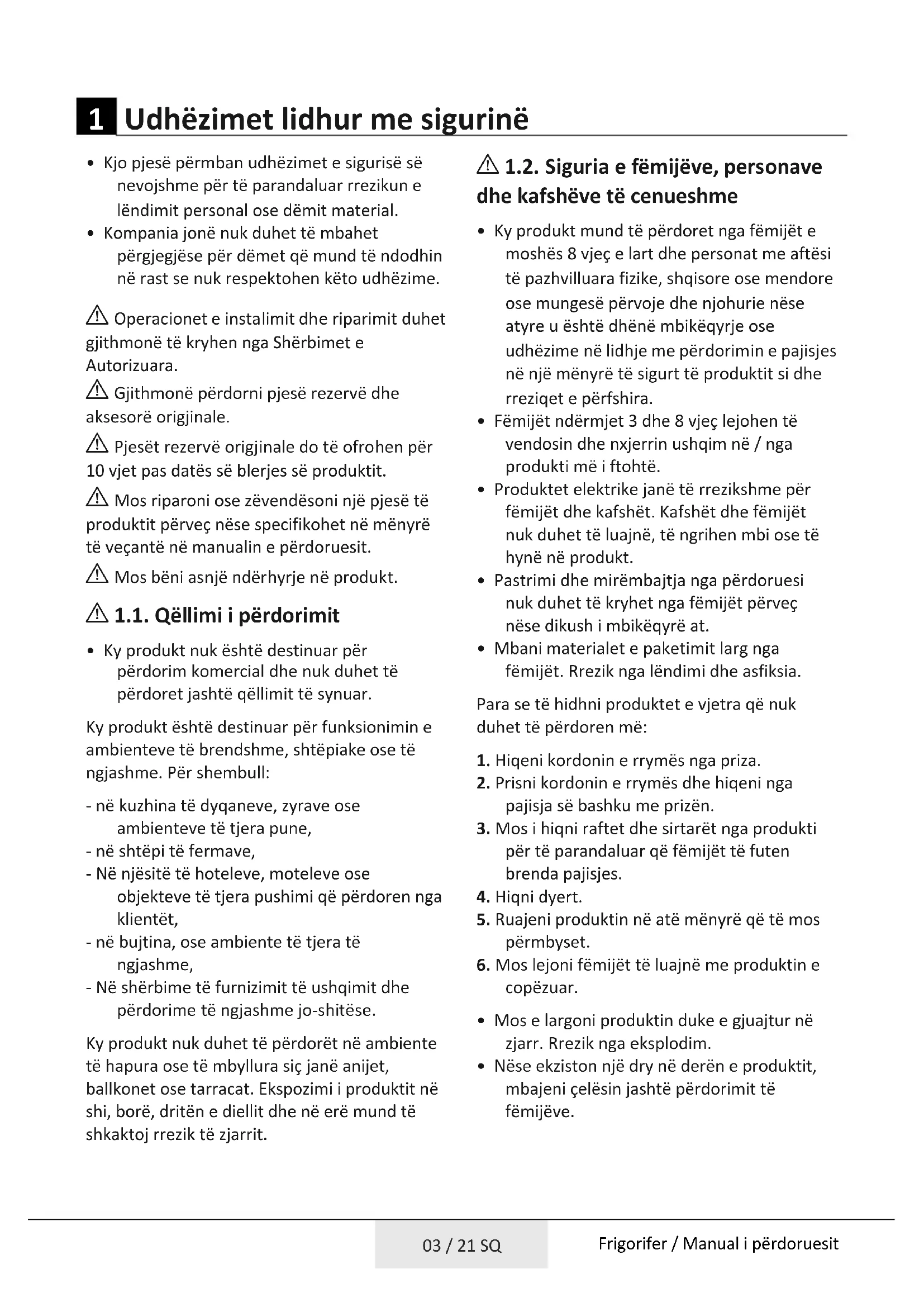 - Nëse ekziston një dry në derën e produktit, mbajeni çelësin jashtë përdorimit të fëmijëve. 03 / 21 SQ Frigorifer / Manual i përdoruesitA 1.3. Siguria elektrike