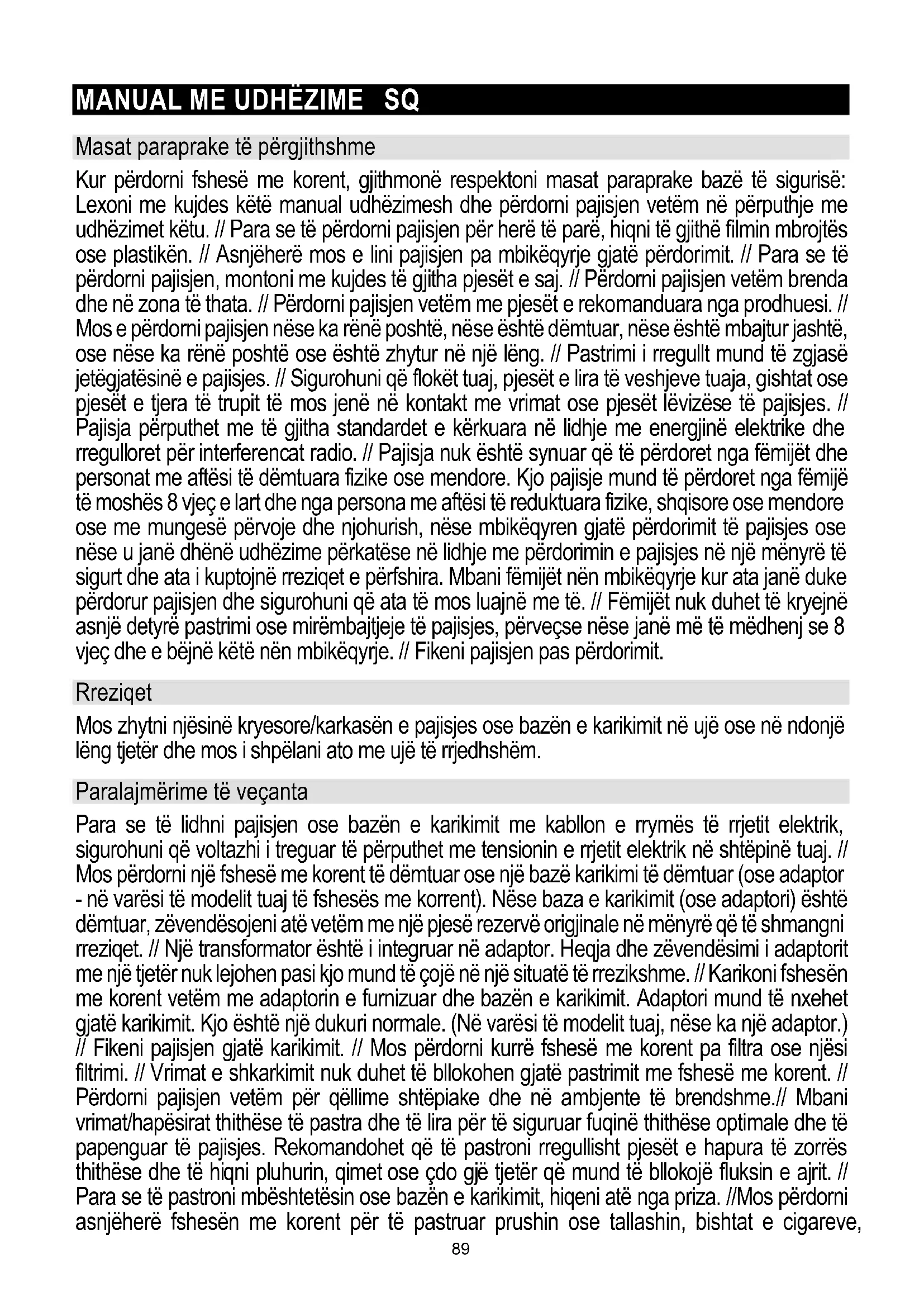 Masat paraprake të përgjithshme Kur përdorni fshesë me korent, gjithmonë respektoni masat paraprake bazë të sigurisë: Lexoni me kujdes këtë manual udhëzimesh dhe përdorni pajisjen vetëm në përputhje me udhëzimet këtu. // Para se të përdorni pajisjen për herë të parë, hiqni të gjithë filmin mbrojtës ose plastikën. // Asnjëherë mos e lini pajisjen pa mbikëqyrje gjatë përdorimit. // Para se të përdorni pajisjen, montoni me kujdes të gjitha pjesët e saj. // Përdorni pajisjen vetëm brenda dhe në zona të thata. // Përdorni pajisjen vetëm me pjesët e rekomanduara nga prodhuesi. // Mos e përdorni pajisjen nëse ka rënë poshtë, nëse është dëmtuar, nëse është mbajtur jashtë, ose nëse ka rënë poshtë ose është zhytur në një lëng. // Pastrimi i rregullt mund të zgjasë jetëgjatësinë e pajisjes. // Sigurohuni që flokët tuaj, pjesët e lira të veshjeve tuaja, gishtat ose pjesët e tjera të trupit të mos jenë në kontakt me vrimat ose pjesët lëvizëse të pajisjes. // Pajisja përputhet me të gjitha standardet e kërkuara në lidhje me energjinë elektrike dhe rregulloret për interferencat radio. // Pajisja nuk është synuar që të përdoret nga fëmijët dhe personat me aftësi të dëmtuara fizike ose mendore. Kjo pajisje mund të përdoret nga fëmijë të moshës 8 vjeç e lart dhe nga persona me aftësi të reduktuara fizike, shqisore ose mendore ose me mungesë përvoje dhe njohurish, nëse mbikëqyren gjatë përdorimit të pajisjes ose nëse u janë dhënë udhëzime përkatëse në lidhje me përdorimin e pajisjes në një mënyrë të sigurt dhe ata i kuptojnë rreziqet e përfshira. Mbani fëmijët nën mbikëqyrje kur ata janë duke përdorur pajisjen dhe sigurohuni që ata të mos luajnë me të. // Fëmijët nuk duhet të kryejnë asnjë detyrë pastrimi ose mirëmbajtjeje të pajisjes, përveçse nëse janë më të mëdhenj se 8 vjeç dhe e bëjnë këtë nën mbikëqyrje. // Fikeni pajisjen pas përdorimit. Rreziqet Mos zhytni njësinë kryesore/karkasën e pajisjes ose bazën e karikimit në ujë ose në ndonjë lëng tjetër dhe mos i shpëlani ato me ujë të rrjedhshëm. Paralajmërime të veçanta Para se të lidhni pajisjen ose bazën e karikimit me kabllon e rrymës të rrjetit elektrik, sigurohuni që voltazhi i treguar të përputhet me tensionin e rrjetit elektrik në shtëpinë tuaj. // Mos përdorni një fshesë me korent të dëmtuar ose një bazë karikimi të dëmtuar (ose adaptor - në varësi të modelit tuaj të fshesës me korrent). Nëse baza e karikimit (ose adaptori) është dëmtuar, zëvendësojeni atë vetëm me një pjesë rezervë origjinale në mënyrë që të shmangni rreziqet. // Një transformator është i integruar në adaptor. Heqja dhe zëvendësimi i adaptorit me një tjetër nuk lejohen pasi kjo mund të çojë në një situatë të rrezikshme. // Karikoni fshesën me korent vetëm me adaptorin e furnizuar dhe bazën e karikimit. Adaptori mund të nxehet gjatë karikimit. Kjo është një dukuri normale. (Në varësi të modelit tuaj, nëse ka një adaptor.) // Fikeni pajisjen gjatë karikimit. // Mos përdorni kurrë fshesë me korent pa filtra ose njësi filtrimi. // Vrimat e shkarkimit nuk duhet të bllokohen gjatë pastrimit me fshesë me korent. // Përdorni pajisjen vetëm për qëllime shtëpiake dhe në ambjente të brendshme.// Mbani vrimat/hapësirat thithëse të pastra dhe të lira për të siguruar fuqinë thithëse optimale dhe të papenguar të pajisjes. Rekomandohet që të pastroni rregullisht pjesët e hapura të zorrës thithëse dhe të hiqni pluhurin, qimet ose çdo gjë tjetër që mund të bllokojë fluksin e ajrit. // Para se të pastroni mbështetësin ose bazën e karikimit, hiqeni atë nga priza. //Mos përdorni asnjëherë fshesën me korent për të pastruar prushin ose tallashin, bishtat e cigareve, 89shkrepëset, lëngjet (p.sh. ujin, shkumën e pastrimit të tapeteve), ose sende të mprehta ose me majë (xhama të thyer, etj.). // Mbajeni tubin thithës ose pjesën e hapur të pajisjes larg fytyrës dhe trupit. // Mos e përdorni kurrë pajisjen për të pastruar me fshesë me korent materialet e ndërtimit (siç janë: rëra e imët, gëlqerja, pluhuri i çimentos, pluhuri i tonerit etj.). Kjo mund të shkaktojë dëmtim të pajisjes. // Mos e ekspozoni baterinë në zjarr ose temperatura mbi 60 ° C Probleme dhe zgjidhje Problemi Arsyeja e mundshme Zgjidhja Nuk punon. Bateria ka mbaruar. Fshesa me korent e dorës nuk është montuar siç duhet. Karikojeni. Montojeni fshesën me korent të dorës në mënyrë korrekte. Është ulur fuqia thithëse. Kupa e pluhurit është plot. Bllokim në Bllokim në tunelin e hyrjes së ajrit ose në rulin e furçës elektrike. Zbrazni pluhurat. Pastroni ose ndryshoni Pastroni furçën elektrike. Fshesa me korent nuk po karikohet. Karikuesi nuk është lidhur me prizën. Lidhësi i karikuesit nuk është i lidhur me bazën. Fshesa me korent e dorës nuk është montuar me trupin. Lidhni karikuesin me prizën. Lidhni karikuesin me trupin e fshesës me korent. Montojeni fshesën me korent të dorës me trupin. Përdorim shumë i shkurtër pas karikimit. Kohë e pamjaftueshme për karikim. Bateria po konsumohet. Bëni karikimin sipas udhëzimeve. Ndryshoni baterinë. Mjedisi Mos e hidhni pajisjen me mbeturinat normale shtëpiake në fund të jetëgjatësisë së saj. Dorëzojeni atë në një pikë zyrtare grumbullimi për riciklim. Duke vepruar kështu, ju ndihmoni në ruajtjen e mjedisit. Kjo pajisje përmban shënimet përkatëse sipas direktivës evropiane 2012/19/EU Për Mbetjet e Pajisjeve Elektrike dhe Elektronike (WEEE). Ky udhëzues është kuadri i një vlefshmërie evropiane për kthimin dhe riciklimin e Mbetjeve të Pajisjeve Elektrike dhe Elektronike. Garancia & shërbimi Nëse keni nevojë për informacione ose nëse keni ndonjë problem, ju lutemi kontaktoni Qendrën e Kujdesit për Klientin