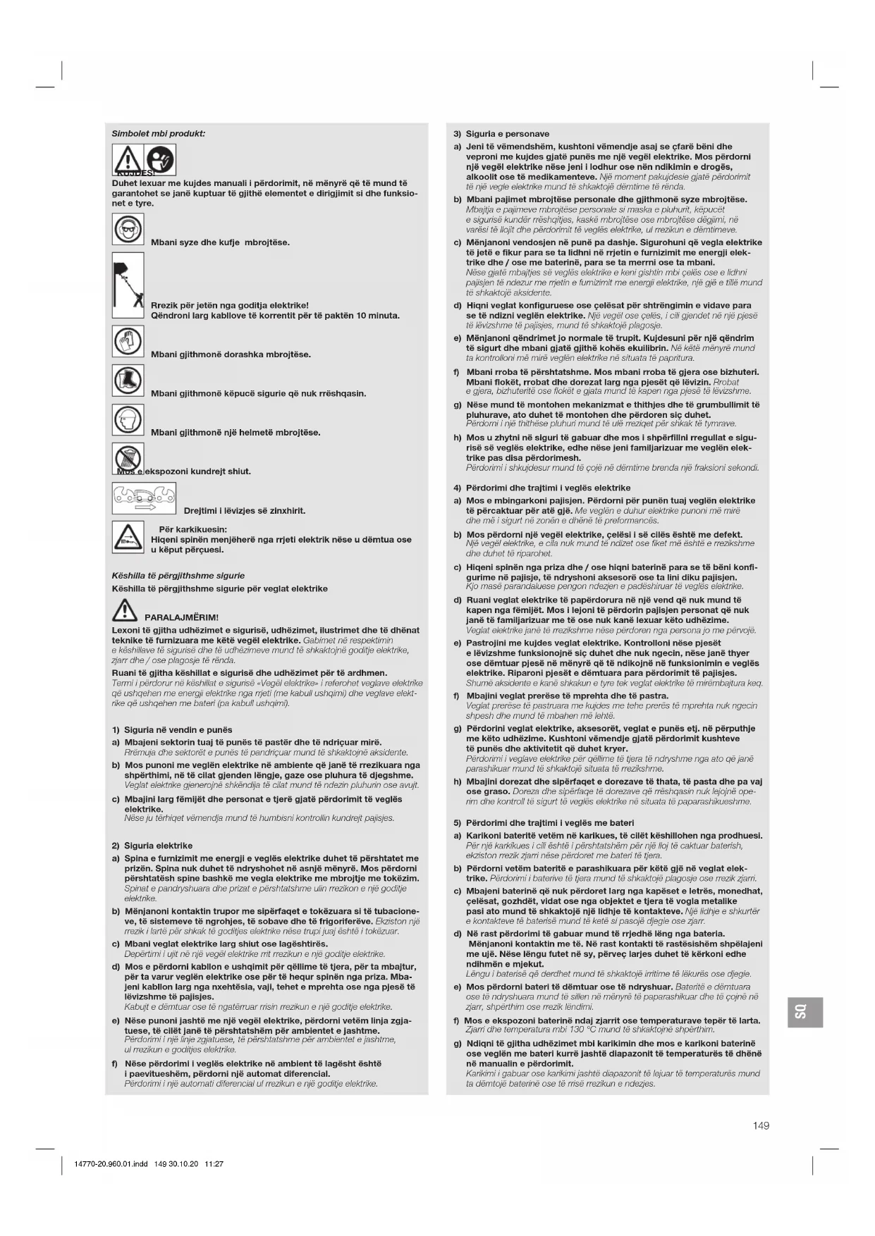 Mbrojeni baterinë nga nxehtësia, p.sh. kundër rrezeve të vazh- dueshme të diellit, nga zjarri, ndotja, uji dhe lagështira. Ekziston rreziku i shpërthimit dhe qarkut të shkurtër. v Operojeni dhe ruajeni baterinë vetëm në një temperaturë ambienti midis – 20 °C dhe + 50 °C. Në verë mos e lini baterinë në makinë. Në temperatura < 0 °C disa pajisje mund të shfaqin humbje të fuqisë. v Karikojeni baterinë vetëm në mjedise ku temperatura e ambientit është midis 0 °C dhe + 45 °C. Karikimi jashtë këtij diapazoni temperature mund ta dëmtojë baterinë ose të rrisë rrezikun e ndezjes. Siguria elektrike RREZIK! Pushim zemre! Gjatë punës, ky produkt gjeneron një fushë elektromagnetike. Në kushte të caktuara, kjo fushë mund të ndikojë mbi mënyrën e funksionimit të implantateve mjekësore aktive ose pasive. Për të përjashtuar rrezikun e situatave që mund të shkaktojnë plagosje të rënda ose vdekjeprurëse, personat me një implantat mjekësor duhet që para përdorimit të këtij produkti të konsultohen me mjekun e tyre dhe prodhuesin e implantatit. Karikuesin lidheni vetëm në një tension alternativ siç jepet në tabelën e tipit. Në asnjë mënyrë nuk bën të lidhet ndonjë përçim i tokëzuar diku në produkt. Mos e përdorni produktin kur ka rrezik stuhie. Mbrojini kontaktet e baterisë nga lagështia. Siguria personale RREZIK! Rreziku i mbytjes! Pjesët e vogla mund të gëlltitet me lehtësi. Për shkak të qeseve plastike ekziston rreziku i mbytjes për fëmijë të vegjël. Mbajini larg fëmijët e veg- jël gjatë montimit. Sharra e degëve duhet të përdoret vetëm në mënyrën e parashikuar posaçërisht. Gërshërët e gardhishteve të përdoren vetëm në mënyrën e parashikuar për për- dorim. Personit përdorues i takon përgjegjësia për aksidentimet e personave të tjerë, dhe për rrezikun, i cili ju kanoset atyre gjegjsisht pronës së tyre. Kini kujdes veçanërisht ndaj rrezikut që mund t’u shkaktohet personave të tretë brenda rrezes së punës, kur tubi teleskopik është i mbyllur. 14770-20.960.01.indd 150 30.10.20 11:27SQ