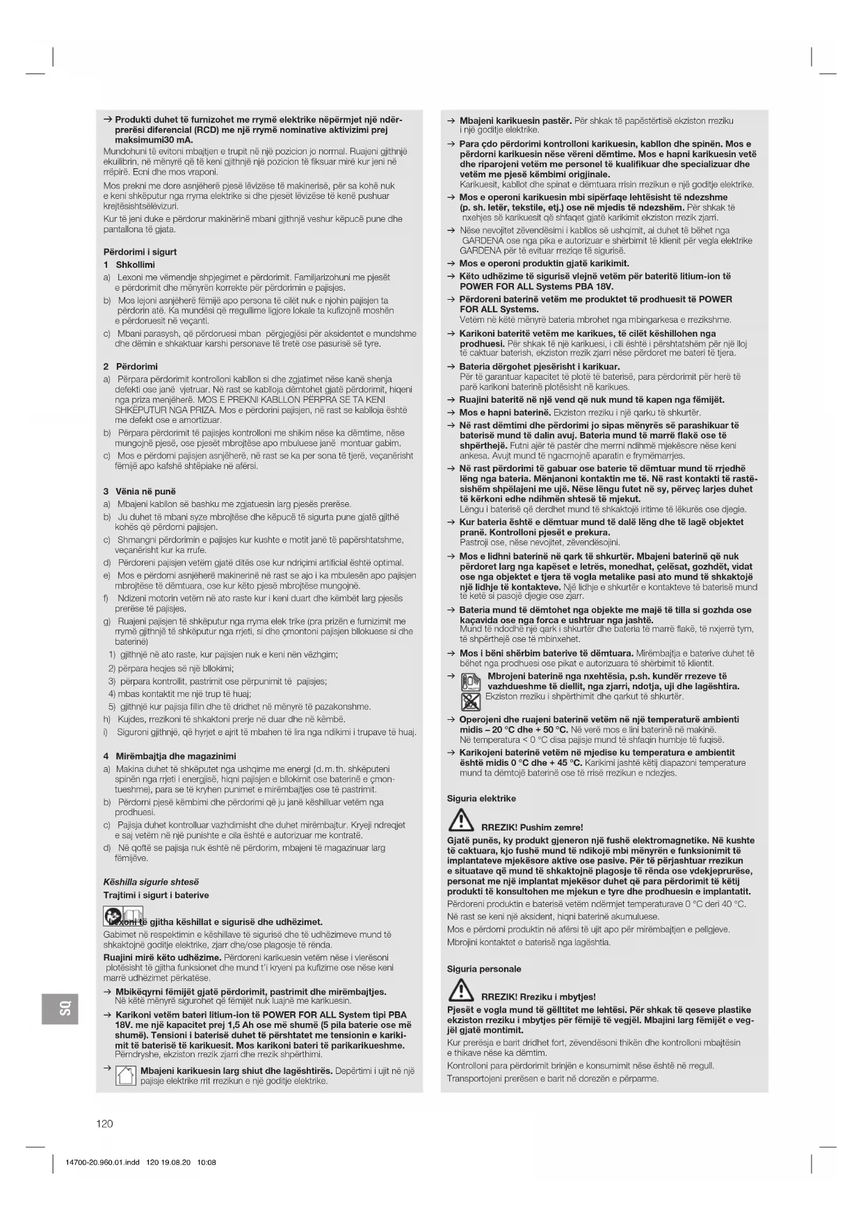 Mbajeni karikuesin larg shiut dhe lagështirës. Depërtimi i ujit në një pajisje elektrike rrit rrezikun e një goditje elektrike. v Mbajeni karikuesin pastër. Për shkak të papëstërtisë ekziston rreziku i një goditje elektrike. v Para çdo përdorimi kontrolloni karikuesin, kabllon dhe spinën. Mos e përdorni karikuesin nëse vëreni dëmtime. Mos e hapni karikuesin vetë dhe riparojeni vetëm me personel të kualifikuar dhe specializuar dhe vetëm me pjesë këmbimi origjinale. Karikuesit, kabllot dhe spinat e dëmtuara rrisin rrezikun e një goditje elektrike. v Mos e operoni karikuesin mbi sipërfaqe lehtësisht të ndezshme (p. sh. letër, tekstile, etj.) ose në mjedis të ndezshëm. Për shkak të nxehjes së karikuesit që shfaqet gjatë karikimit ekziston rrezik zjarri. v Nëse nevojitet zëvendësimi i kabllos së ushqimit, ai duhet të bëhet nga GARDENA ose nga pika e autorizuar e shërbimit të klienit për vegla elektrike GARDENA për të evituar rreziqe të sigurisë. v Mos e operoni produktin gjatë karikimit. v Këto udhëzime të sigurisë vlejnë vetëm për bateritë litium-ion të POWER FOR ALL Systems PBA 18V. v Përdoreni baterinë vetëm me produktet të prodhuesit të POWER FOR ALL Systems. Vetëm në këtë mënyrë bateria mbrohet nga mbingarkesa e rrezikshme. v Karikoni bateritë vetëm me karikues, të cilët këshillohen nga prodhuesi. Për shkak të një karikuesi, i cili është i përshtatshëm për një lloj të caktuar baterish, ekziston rrezik zjarri nëse përdoret me bateri të tjera. v Bateria dërgohet pjesërisht i karikuar. Për të garantuar kapacitet të plotë të baterisë, para përdorimit për herë të parë karikoni baterinë plotësisht në karikues. v Ruajini bateritë në një vend që nuk mund të kapen nga fëmijët. v Mos e hapni baterinë. Ekziston rreziku i një qarku të shkurtër. v Në rast dëmtimi dhe përdorimi jo sipas mënyrës së parashikuar të baterisë mund të dalin avuj. Bateria mund të marrë flakë ose të shpërthejë. Futni ajër të pastër dhe merrni ndihmë mjekësore nëse keni ankesa. Avujt mund të ngacmojnë aparatin e frymëmarrjes. v Në rast përdorimi të gabuar ose baterie të dëmtuar mund të rrjedhë lëng nga bateria. Mënjanoni kontaktin me të. Në rast kontakti të rastë- sishëm shpëlajeni me ujë. Nëse lëngu futet në sy, përveç larjes duhet të kërkoni edhe ndihmën shtesë të mjekut. Lëngu i baterisë që derdhet mund të shkaktojë iritime të lëkurës ose djegie. v Kur bateria është e dëmtuar mund të dalë lëng dhe të lagë objektet pranë. Kontrolloni pjesët e prekura. Pastroji ose, nëse nevojitet, zëvendësojini. v Mos e lidhni baterinë në qark të shkurtër. Mbajeni baterinë që nuk përdoret larg nga kapëset e letrës, monedhat, çelësat, gozhdët, vidat ose nga objektet e tjera të vogla metalike pasi ato mund të shkaktojë një lidhje të kontakteve. Një lidhje e shkurtër e kontakteve të baterisë mund të ketë si pasojë djegie ose zjarr. v Bateria mund të dëmtohet nga objekte me majë të tilla si gozhda ose kaçavida ose nga forca e ushtruar nga jashtë. Mund të ndodhë një qark i shkurtër dhe bateria të marrë flakë, të nxjerrë tym, të shpërthejë ose të mbinxehet. v Mos i bëni shërbim baterive të dëmtuara. Mirëmbajtja e baterive duhet të bëhet nga prodhuesi ose pikat e autorizuara të shërbimit të klientit.