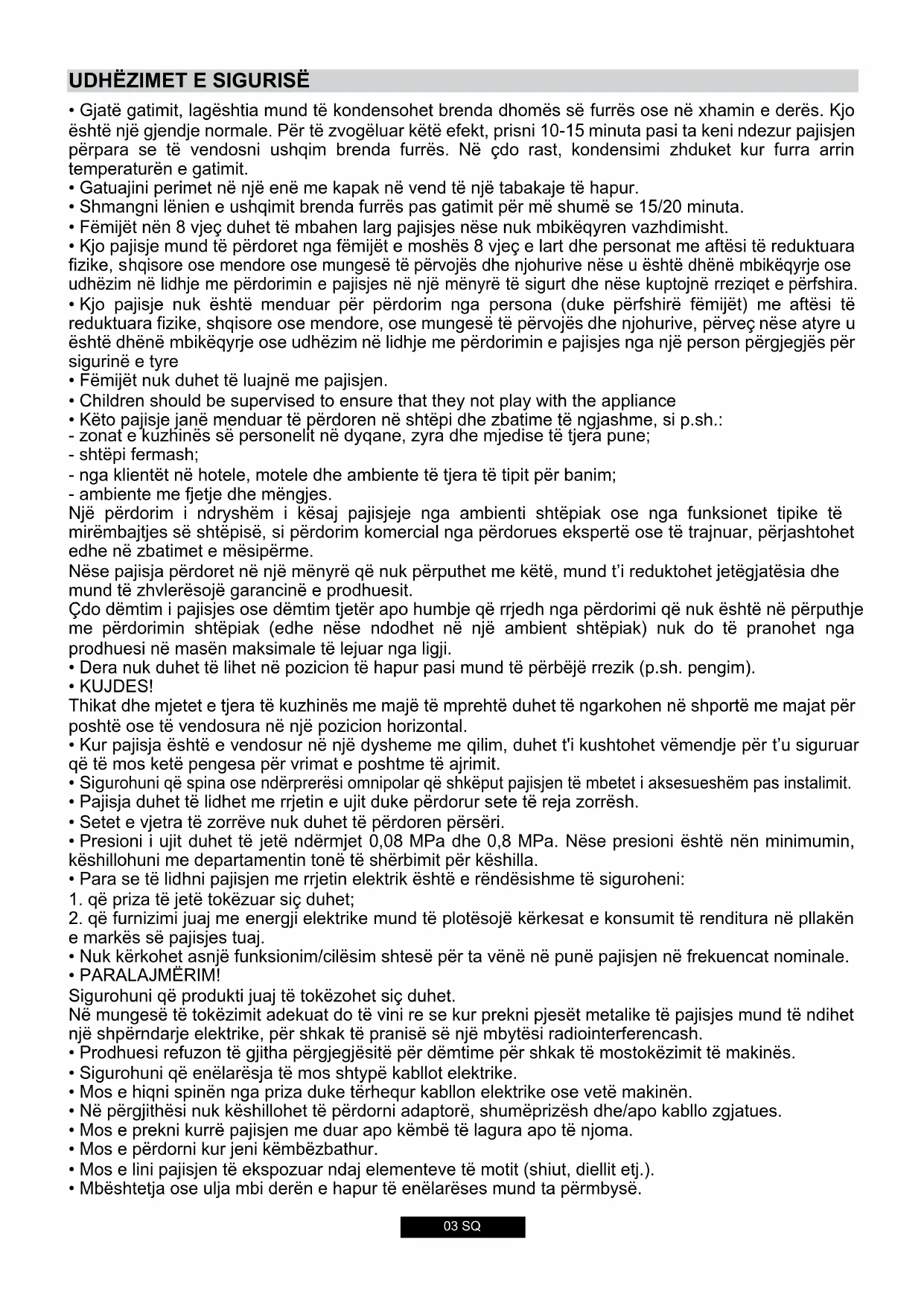 - PARALAJMËRIM: Pajisja dhe pjesët e saj të arritshme nxehen gjatë përdorimit. Duhet bërë kujdes të mos prekni elementet ngrohëse.