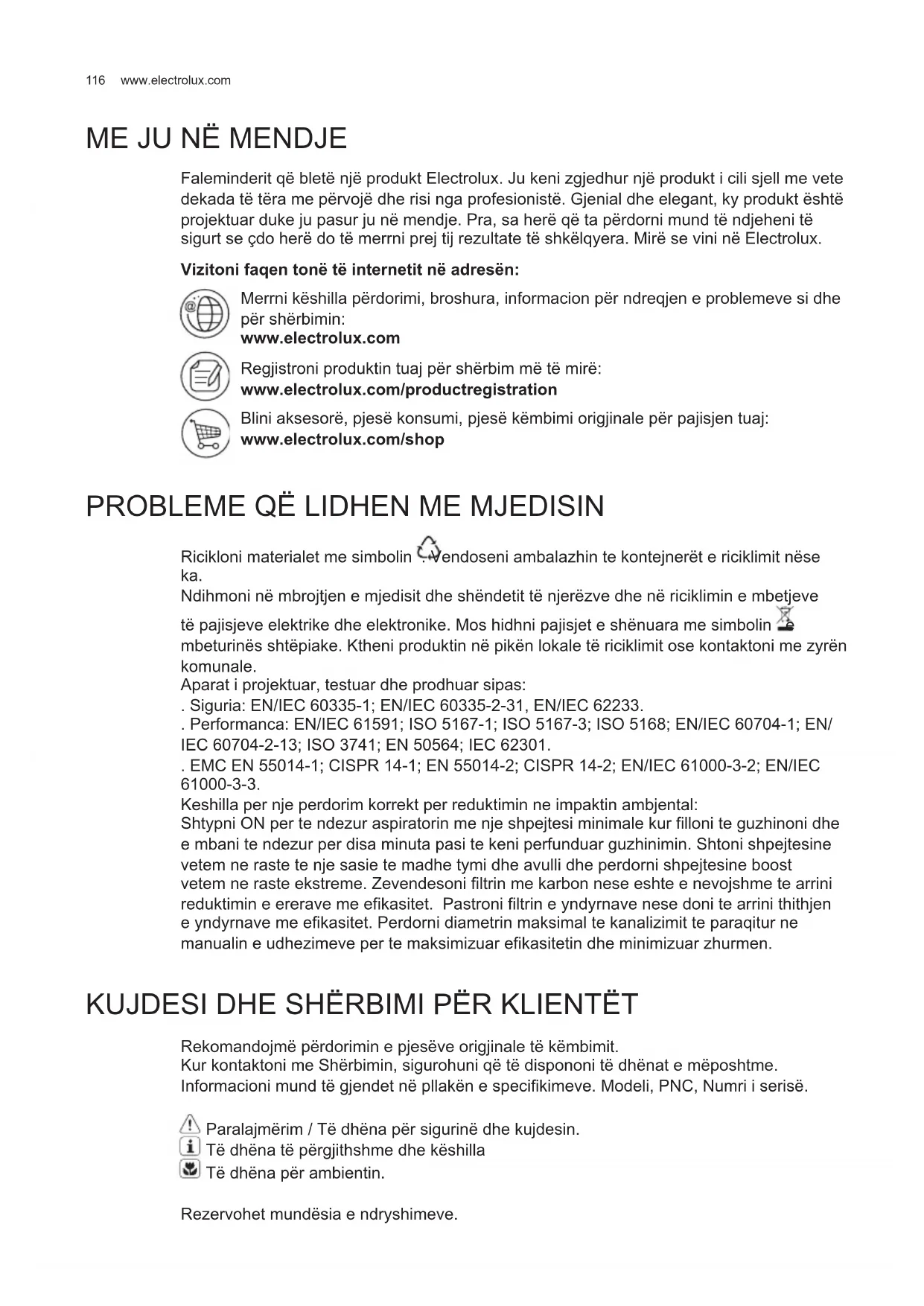 Faleminderit që bletë një produkt Electrolux. Ju keni zgjedhur një produkt i cili sjell me vete dekada të tëra me përvojë dhe risi nga profesionistë. Gjenial dhe elegant, ky produkt është projektuar duke ju pasur ju në mendje. Pra, sa herë që ta përdorni mund të ndjeheni të sigurt se çdo herë do të merrni prej tij rezultate të shkëlqyera. Mirë se vini në Electrolux. Vizitoni faqen tonë të internetit në adresën: Merrni këshilla përdorimi, broshura, informacion për ndreqjen e problemeve si dhe për shërbimin: www.electrolux.com Regjistroni produktin tuaj për shërbim më të mirë: www.electrolux.com/productregistration Blini aksesorë, pjesë konsumi, pjesë këmbimi origjinale për pajisjen tuaj: www.electrolux.com/shop