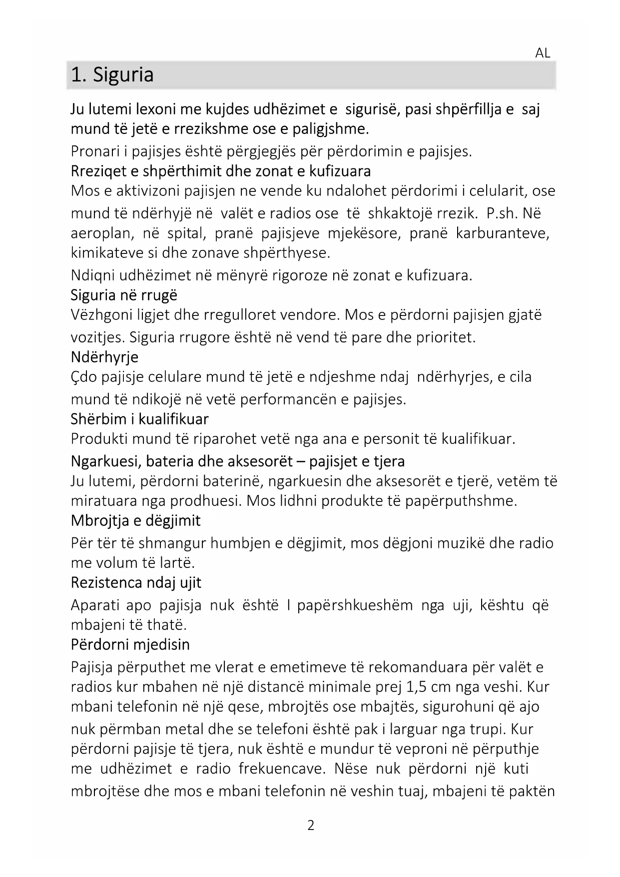 Ju lutemi lexoni me kujdes udhëzimet e sigurisë, pasi shpërfillja e saj mund të jetë e rrezikshme ose e paligjshme. Pronari i pajisjes është përgjegjës për përdorimin e pajisjes. Rreziqet e shpërthimit dhe zonat e kufizuara Mos e aktivizoni pajisjen ne vende ku ndalohet përdorimi i celularit, ose mund të ndërhyjë në valët e radios ose të shkaktojë rrezik. P.sh. Në aeroplan, në spital, pranë pajisjeve mjekësore, pranë karburanteve, kimikateve si dhe zonave shpërthyese. Ndiqni udhëzimet në mënyrë rigoroze në zonat e kufizuara. Siguria në rrugë Vëzhgoni ligjet dhe rregulloret vendore. Mos e përdorni pajisjen gjatë vozitjes. Siguria rrugore është në vend të pare dhe prioritet. Ndërhyrje Çdo pajisje celulare mund të jetë e ndjeshme ndaj ndërhyrjes, e cila mund të ndikojë në vetë performancën e pajisjes. Shërbim i kualifikuar Produkti mund të riparohet vetë nga ana e personit të kualifikuar. Ngarkuesi, bateria dhe aksesorët – pajisjet e tjera Ju lutemi, përdorni baterinë, ngarkuesin dhe aksesorët e tjerë, vetëm të miratuara nga prodhuesi. Mos lidhni produkte të papërputhshme. Mbrojtja e dëgjimit Për tër të shmangur humbjen e dëgjimit, mos dëgjoni muzikë dhe radio me volum të lartë. Rezistenca ndaj ujit Aparati apo pajisja nuk është I papërshkueshëm nga uji, kështu që mbajeni të thatë. Përdorni mjedisin Pajisja përputhet me vlerat e emetimeve të rekomanduara për valët e radios kur mbahen në një distancë minimale prej 1,5 cm nga veshi. Kur mbani telefonin në një qese, mbrojtës ose mbajtës, sigurohuni që ajo nuk përmban metal dhe se telefoni është pak i larguar nga trupi. Kur përdorni pajisje të tjera, nuk është e mundur të veproni në përputhje me udhëzimet e radio frekuencave. Nëse nuk përdorni një kuti mbrojtëse dhe mos e mbani telefonin në veshin tuaj, mbajeni të paktënAL