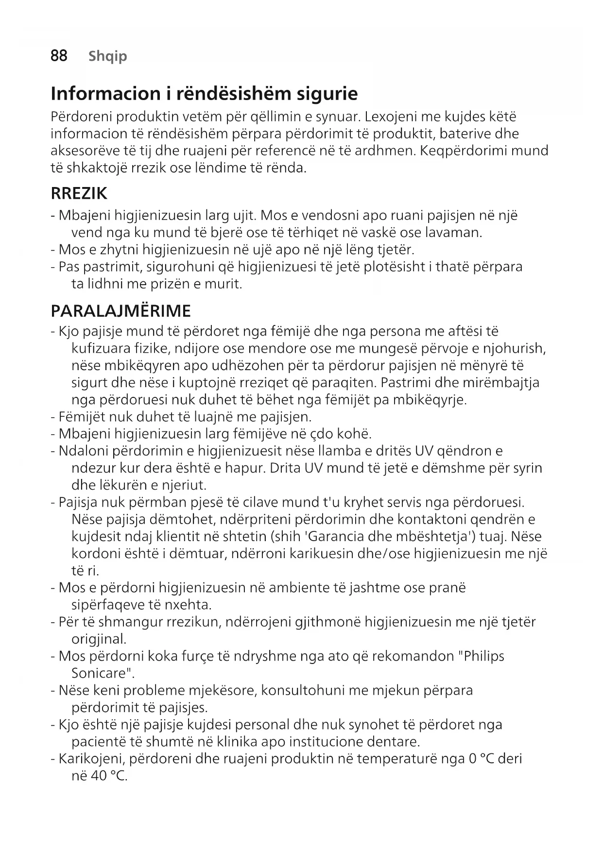 Shqip Informacion i rëndësishëm sigurie Përdoreni produktin vetëm për qëllimin e synuar. Lexojeni me kujdes këtë informacion të rëndësishëm përpara përdorimit të produktit, baterive dhe aksesorëve të tij dhe ruajeni për referencë në të ardhmen. Keqpërdorimi mund të shkaktojë rrezik ose lëndime të rënda. RREZIK - Mbajeni higjienizuesin larg ujit. Mos e vendosni apo ruani pajisjen në një vend nga ku mund të bjerë ose të tërhiqet në vaskë ose lavaman. - Mos e zhytni higjienizuesin në ujë apo në një lëng tjetër. - Pas pastrimit, sigurohuni që higjienizuesi të jetë plotësisht i thatë përpara ta lidhni me prizën e murit. PARALAJMËRIME - Kjo pajisje mund të përdoret nga fëmijë dhe nga persona me aftësi të kufizuara fizike, ndijore ose mendore ose me mungesë përvoje e njohurish, nëse mbikëqyren apo udhëzohen për ta përdorur pajisjen në mënyrë të sigurt dhe nëse i kuptojnë rreziqet që paraqiten. Pastrimi dhe mirëmbajtja nga përdoruesi nuk duhet të bëhet nga fëmijët pa mbikëqyrje. - Fëmijët nuk duhet të luajnë me pajisjen. - Mbajeni higjienizuesin larg fëmijëve në çdo kohë. - Ndaloni përdorimin e higjienizuesit nëse llamba e dritës UV qëndron e ndezur kur dera është e hapur. Drita UV mund të jetë e dëmshme për syrin dhe lëkurën e njeriut. - Pajisja nuk përmban pjesë të cilave mund t'u kryhet servis nga përdoruesi. Nëse pajisja dëmtohet, ndërpriteni përdorimin dhe kontaktoni qendrën e kujdesit ndaj klientit në shtetin (shih 'Garancia dhe mbështetja') tuaj. Nëse kordoni është i dëmtuar, ndërroni karikuesin dhe/ose higjienizuesin me një të ri. - Mos e përdorni higjienizuesin në ambiente të jashtme ose pranë sipërfaqeve të nxehta. - Për të shmangur rrezikun, ndërrojeni gjithmonë higjienizuesin me një tjetër origjinal. - Mos përdorni koka furçe të ndryshme nga ato që rekomandon "Philips Sonicare". - Nëse keni probleme mjekësore, konsultohuni me mjekun përpara përdorimit të pajisjes. - Kjo është një pajisje kujdesi personal dhe nuk synohet të përdoret nga pacientë të shumtë në klinika apo institucione dentare. - Karikojeni, përdoreni dhe ruajeni produktin në temperaturë nga 0°C deri në 40°C.89 Shqip KUJDES - Përdoreni higjienizuesin vetëm me ekranin mbrojtës në vend. - Llamba e dritës UV e higjienizuesit është e nxehtë gjatë ciklit të higjienizimit dhe menjëherë pas tij. Mos e prekni llambën e dritës UV kur është e nxehtë. - Nëse higjienizuesi është përdorur për 3 cikle pastrimi UV radhazi, fikeni për të paktën 30 minuta përpara se të filloni një cikël tjetër pastrimi UV. - Mos pastroni asnjë pjesë të produktit në enëlarëse. Fushat elektromagnetike (EMF) Pajisja Philips është në përputhje me të gjitha standardet dhe rregulloret në fuqi për ekspozimin ndaj fushave elektromagnetike. Hyrje Ju përgëzojmë për blerjen tuaj dhe mirë se vini në "Philips"! Për të përfituar plotësisht nga mbështetja që ofron "Philips", regjistrojeni produktin në www.philips.com/welcome. Përshkrim i përgjithshëm (fig. 1) 1 Tasti ndezje/fikje 2 Hapja e derës 3 Dritarja 4 Karikuesi i furçës elektrike "Sonicare" 5 Kordoni Higjienizimi i kokave të furçës Me higjienizuesin UV ju mund ta pastroni kokën e furçës pas çdo përdorimi. Shënim: Drita UV mund të jetë e dëmshme për syrin dhe lëkurën e njeriut.
