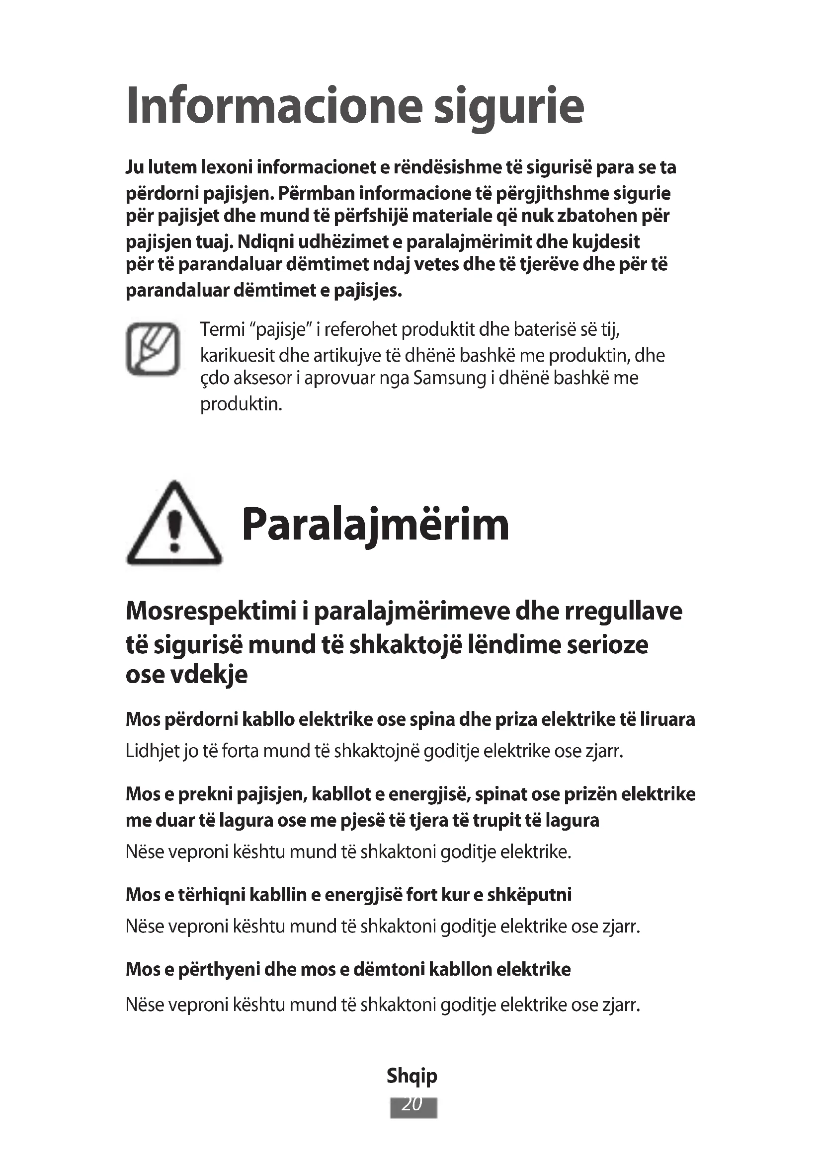 Informacione sigurie Ju lutem lexoni informacionet e rëndësishme të sigurisë para se ta përdorni pajisjen. Përmban informacione të përgjithshme sigurie për pajisjet dhe mund të përfshijë materiale që nuk zbatohen për pajisjen tuaj. Ndiqni udhëzimet e paralajmërimit dhe kujdesit për të parandaluar dëmtimet ndaj vetes dhe të tjerëve dhe për të parandaluar dëmtimet e pajisjes. Termi “pajisje” i referohet produktit dhe baterisë së tij, karikuesit dhe artikujve të dhënë bashkë me produktin, dhe çdo aksesor i aprovuar nga Samsung i dhënë bashkë me produktin. Paralajmërim Mosrespektimi i paralajmërimeve dhe rregullave të sigurisë mund të shkaktojë lëndime serioze ose vdekje Mos përdorni kabllo elektrike ose spina dhe priza elektrike të liruara Lidhjet jo të forta mund të shkaktojnë goditje elektrike ose zjarr. Mos e prekni pajisjen, kabllot e energjisë, spinat ose prizën elektrike me duar të lagura ose me pjesë të tjera të trupit të lagura Nëse veproni kështu mund të shkaktoni goditje elektrike. Mos e tërhiqni kabllin e energjisë fort kur e shkëputni Nëse veproni kështu mund të shkaktoni goditje elektrike ose zjarr. Mos e përthyeni dhe mos e dëmtoni kabllon elektrike Nëse veproni kështu mund të shkaktoni goditje elektrike ose zjarr.Shqip