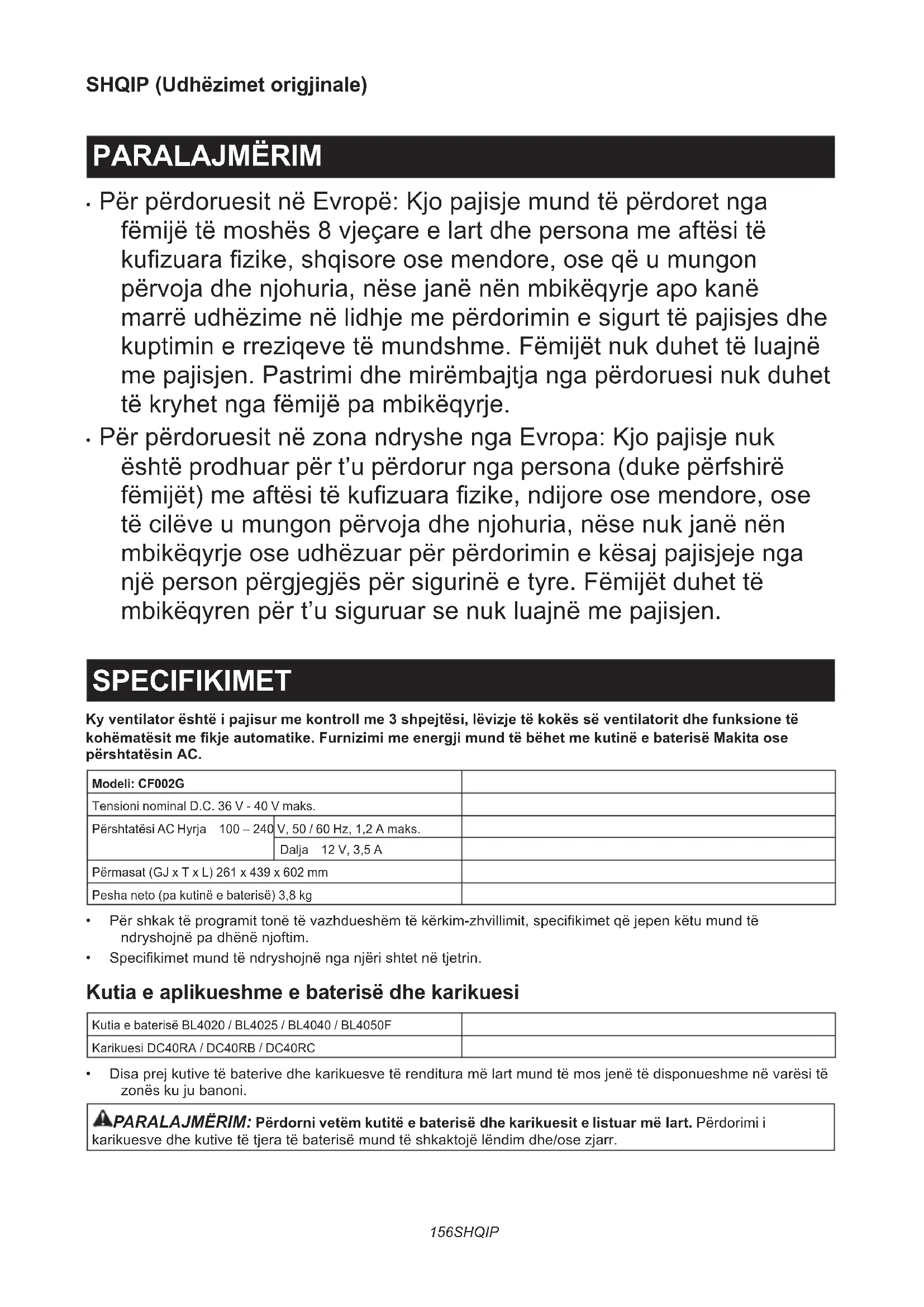 - PërpërdoruesitnëzonandryshengaEvropa:Kjopajisjenuk është prodhuar për t’u përdorur nga persona (duke përfshirë fëmijët)meaftësitëkuzuarazike,ndijoreosemendore,ose tëcilëveumungonpërvojadhenjohuria,nësenukjanënën mbikëqyrjeoseudhëzuarpërpërdoriminekësajpajisjejenga njëpersonpërgjegjëspërsigurinëetyre.Fëmijëtduhettë mbikëqyrenpërt’usiguruarsenukluajnëmepajisjen. SPECIFIKIMET Ky ventilator është i pajisur me kontroll me 3 shpejtësi, lëvizje të kokës së ventilatorit dhe funksione të kohëmatësit me kje automatike. Furnizimi me energji mund të bëhet me kutinë e baterisë Makita ose përshtatësin AC. Modeli: CF002GTensioni nominal D.C. 36 V - 40 V maks.Përshtatësi AC Hyrja 100 – 240 V, 50 / 60 Hz, 1,2 A maks.Dalja 12 V, 3,5 APërmasat (GJ x T x L) 261 x 439 x 602 mmPesha neto (pa kutinë e baterisë) 3,8 kg