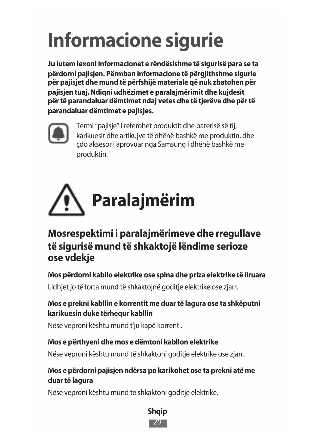 Informacione sigurie Ju lutem lexoni informacionet e rëndësishme të sigurisë para se ta përdorni pajisjen. Përmban informacione të përgjithshme sigurie për pajisjet dhe mund të përfshijë materiale që nuk zbatohen për pajisjen tuaj. Ndiqni udhëzimet e paralajmërimit dhe kujdesit për të parandaluar dëmtimet ndaj vetes dhe të tjerëve dhe për të parandaluar dëmtimet e pajisjes. Termi “pajisje” i referohet produktit dhe baterisë së tij, karikuesit dhe artikujve të dhënë bashkë me produktin, dhe çdo aksesor i aprovuar nga Samsung i dhënë bashkë me produktin. Paralajmërim Mosrespektimi i paralajmërimeve dhe rregullave të sigurisë mund të shkaktojë lëndime serioze ose vdekje Mos përdorni kabllo elektrike ose spina dhe priza elektrike të liruara Lidhjet jo të forta mund të shkaktojnë goditje elektrike ose zjarr. Mos e prekni kabllin e korrentit me duar të lagura ose ta shkëputni karikuesin duke tërhequr kabllin Nëse veproni kështu mund t'ju kapë korrenti. Mos e përthyeni dhe mos e dëmtoni kabllon elektrike Nëse veproni kështu mund të shkaktoni goditje elektrike ose zjarr. Mos e përdorni pajisjen ndërsa po karikohet ose ta prekni atë me duar të lagura Nëse veproni kështu mund të shkaktoni goditje elektrike.Shqip
