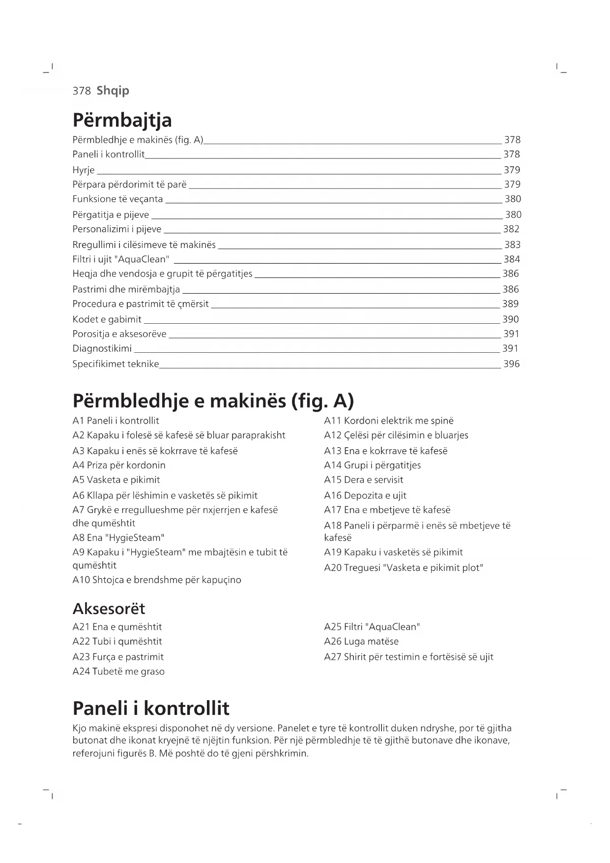 Shqip Përmbajtja Përmbledhje e makinës (fig. A)______________________________________________________________ 378 Paneli i kontrollit__________________________________________________________________________ 378 Hyrje ____________________________________________________________________________________ 379 Përpara përdorimit të parë _________________________________________________________________ 379 Funksione të veçanta ______________________________________________________________________ 380 Përgatitja e pijeve _________________________________________________________________________ 380 Personalizimi i pijeve ______________________________________________________________________ 382 Rregullimi i cilësimeve të makinës ___________________________________________________________ 383 Filtri i ujit "AquaClean" ____________________________________________________________________ 384 Heqja dhe vendosja e grupit të përgatitjes ___________________________________________________ 386 Pastrimi dhe mirëmbajtja __________________________________________________________________ 386 Procedura e pastrimit të çmërsit ____________________________________________________________ 389 Kodet e gabimit __________________________________________________________________________ 390 Porositja e aksesorëve _____________________________________________________________________ 391 Diagnostikimi ____________________________________________________________________________ 391 Specifikimet teknike_______________________________________________________________________ 396 Përmbledhje e makinës (fig. A) A1 Paneli i kontrollit A2 Kapaku i folesë së kafesë së bluar paraprakisht A3 Kapaku i enës së kokrrave të kafesë A4 Priza për kordonin A5 Vasketa e pikimit A6 Kllapa për lëshimin e vasketës së pikimit A7 Grykë e rregullueshme për nxjerrjen e kafesë dhe qumështit A8 Ena "HygieSteam" A9 Kapaku i "HygieSteam" me mbajtësin e tubit të qumështit A10 Shtojca e brendshme për kapuçino A11 Kordoni elektrik me spinë A12 Çelësi për cilësimin e bluarjes A13 Ena e kokrrave të kafesë A14 Grupi i përgatitjes A15 Dera e servisit A16 Depozita e ujit A17 Ena e mbetjeve të kafesë A18 Paneli i përparmë i enës së mbetjeve të kafesë A19 Kapaku i vasketës së pikimit A20 Treguesi "Vasketa e pikimit plot" Aksesorët A21 Ena e qumështit A22 Tubi i qumështit A23 Furça e pastrimit A24 Tubetë me graso A25 Filtri "AquaClean" A26 Luga matëse A27 Shirit për testimin e fortësisë së ujit Paneli i kontrollit Kjo makinë ekspresi disponohet në dy versione. Panelet e tyre të kontrollit duken ndryshe, por të gjitha butonat dhe ikonat kryejnë të njëjtin funksion. Për një përmbledhje të të gjithë butonave dhe ikonave, referojuni figurës B. Më poshtë do të gjeni përshkrimin.379 Shqip Përdorni shigjetat lart dhe poshtë për të lëvizur në ekran dhe prekni ikonën "OK" për të përzgjedhur ose konfirmuar zgjedhjen tuaj. B1 Butoni i ndezjes/fikjes B2 Ikonat e pijeve me një prekje B3 Ikona "CoffeeMaestro" B4 Menyja me më shumë pije B5 Butoni i ndezjes/fikjes . B6 Ikonat e navigimit (lart, poshtë, pas, ok) B7 Ekrani B8 Cilësimet e makinës B9 Menyja e pastrimit B10 Profilet personale Hyrje Ju përgëzojmë për blerjen e makinës së kafesë plotësisht automatike "Saeco"! Për të përfituar plotësisht nga mbështetja në internet që ofron "Saeco", shkoni te www.saeco.com/MyCoffeeMachine dhe regjistroni produktin tuaj. Shënim: Kjo makineri është testuar me kafe. Ndonëse është pastruar me kujdes, mund të ketë mbetje kafeje. Megjithatë, ju garantojmë se makina është absolutisht e re. Përpara përdorimit të parë