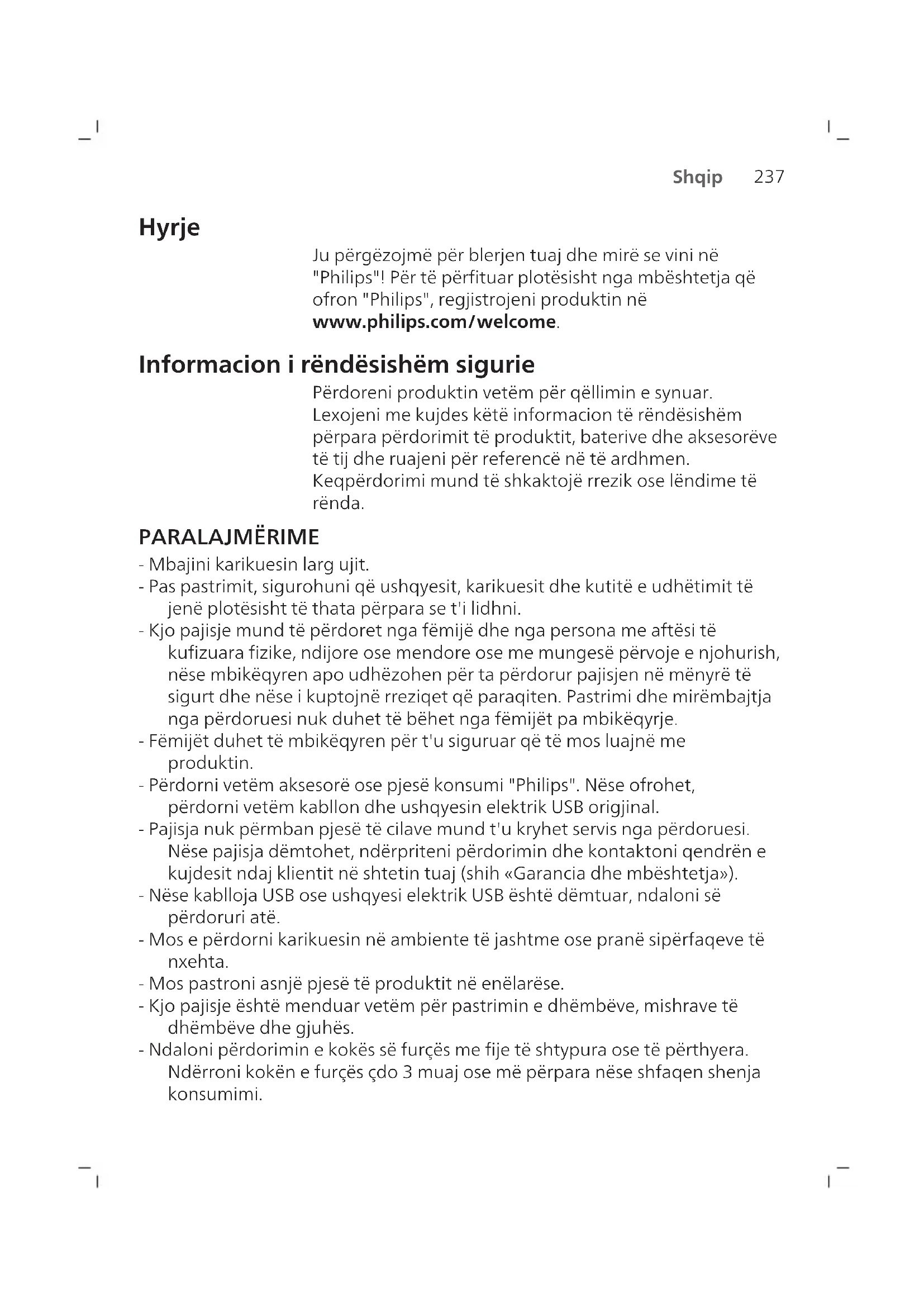 Shqip Hyrje Ju përgëzojmë për blerjen tuaj dhe mirë se vini në "Philips"! Për të përfituar plotësisht nga mbështetja që ofron "Philips", regjistrojeni produktin në www.philips.com/welcome. Informacion i rëndësishëm sigurie Përdoreni produktin vetëm për qëllimin e synuar. Lexojeni me kujdes këtë informacion të rëndësishëm përpara përdorimit të produktit, baterive dhe aksesorëve të tij dhe ruajeni për referencë në të ardhmen. Keqpërdorimi mund të shkaktojë rrezik ose lëndime të rënda. PARALAJMËRIME - Mbajini karikuesin larg ujit. - Pas pastrimit, sigurohuni që ushqyesit, karikuesit dhe kutitë e udhëtimit të jenë plotësisht të thata përpara se t'i lidhni. - Kjo pajisje mund të përdoret nga fëmijë dhe nga persona me aftësi të kufizuara fizike, ndijore ose mendore ose me mungesë përvoje e njohurish, nëse mbikëqyren apo udhëzohen për ta përdorur pajisjen në mënyrë të sigurt dhe nëse i kuptojnë rreziqet që paraqiten. Pastrimi dhe mirëmbajtja nga përdoruesi nuk duhet të bëhet nga fëmijët pa mbikëqyrje. - Fëmijët duhet të mbikëqyren për t'u siguruar që të mos luajnë me produktin. - Përdorni vetëm aksesorë ose pjesë konsumi "Philips". Nëse ofrohet, përdorni vetëm kabllon dhe ushqyesin elektrik USB origjinal. - Pajisja nuk përmban pjesë të cilave mund t'u kryhet servis nga përdoruesi. Nëse pajisja dëmtohet, ndërpriteni përdorimin dhe kontaktoni qendrën e kujdesit ndaj klientit në shtetin tuaj (shih «Garancia dhe mbështetja»). - Nëse kablloja USB ose ushqyesi elektrik USB është dëmtuar, ndaloni së përdoruri atë. - Mos e përdorni karikuesin në ambiente të jashtme ose pranë sipërfaqeve të nxehta. - Mos pastroni asnjë pjesë të produktit në enëlarëse. - Kjo pajisje është menduar vetëm për pastrimin e dhëmbëve, mishrave të dhëmbëve dhe gjuhës. - Ndaloni përdorimin e kokës së furçës me fije të shtypura ose të përthyera. Ndërroni kokën e furçës çdo 3 muaj ose më përpara nëse shfaqen shenja konsumimi.238 Shqip - Shmangni kontaktin e drejtpërdrejtë me produktet që përmbajnë vajra esenciale ose vaj kokosi. Kontakti mund të çojë në shkuljen e fijeve të furçës.