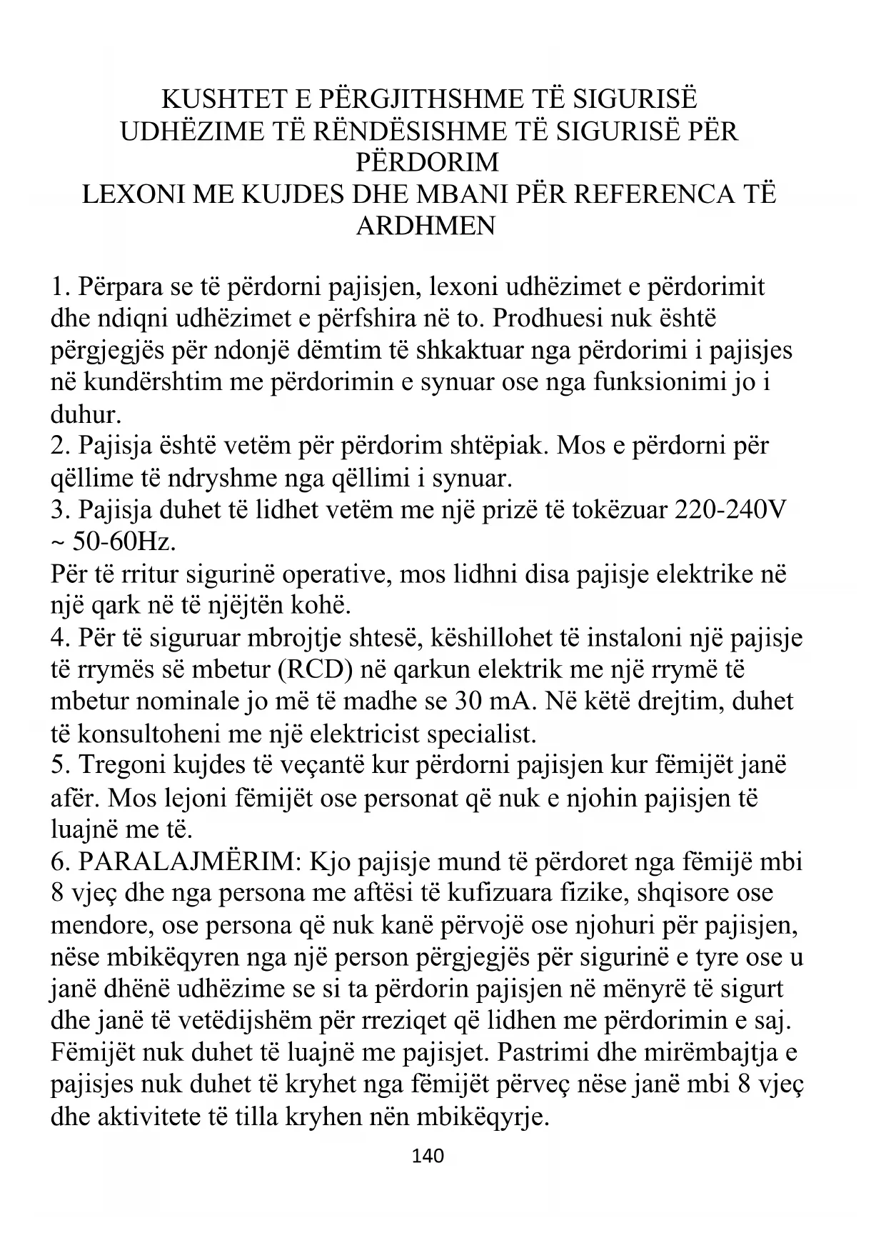 8 vjeç dhe nga persona me aftësi të kufizuara fizike, shqisore ose mendore, ose persona që nuk kanë përvojë ose njohuri për pajisjen, nëse mbikëqyren nga një person përgjegjës për sigurinë e tyre ose u janë dhënë udhëzime se si ta përdorin pajisjen në mënyrë të sigurt dhe janë të vetëdijshëm për rreziqet që lidhen me përdorimin e saj. Fëmijët nuk duhet të luajnë me pajisjet. Pastrimi dhe mirëmbajtja e pajisjes nuk duhet të kryhet nga fëmijët përveç nëse janë mbi 8 vjeç dhe aktivitete të tilla kryhen nën mbikëqyrje.141