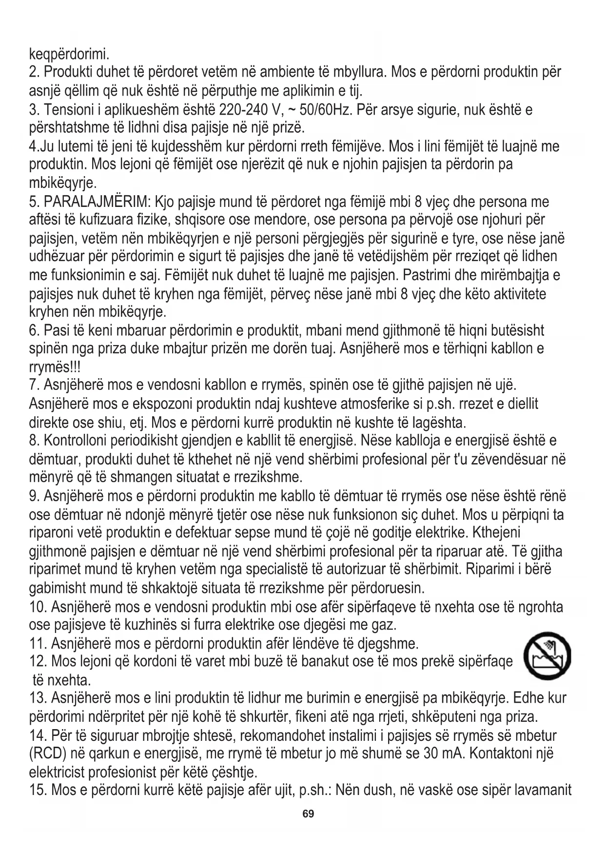 15. Mos e përdorni kurrë këtë pajisje afër ujit, p.sh.: Nën dush, në vaskë ose sipër lavamanit
