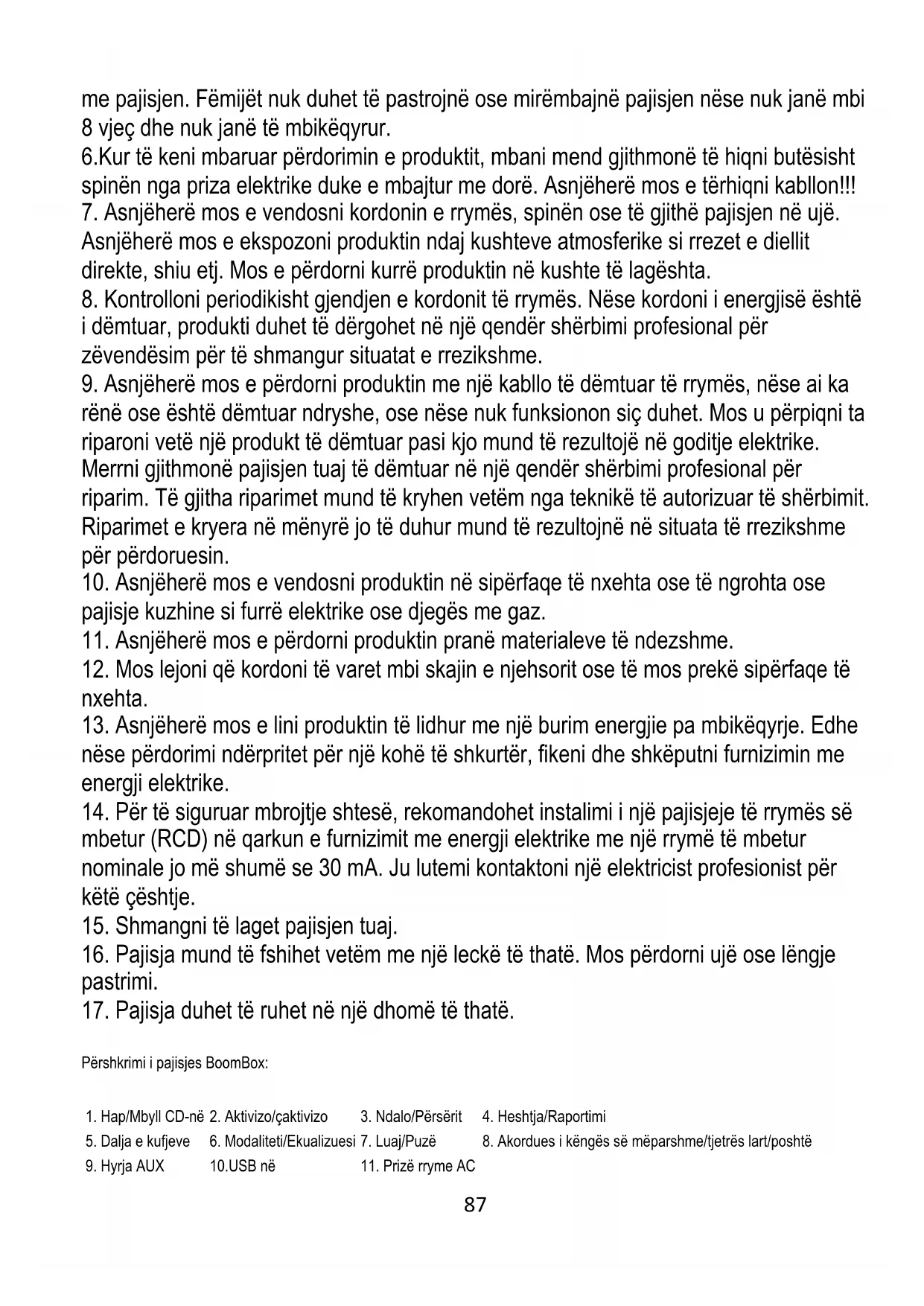 me aftësi të reduktuara fizike, shqisore ose mendore ose mungesë përvoje ose njohurie për pajisjen vetëm nëse ata mbikëqyren nga një person përgjegjës për sigurinë e tyre ose kanë qenë udhëzohen për përdorimin e sigurt të pajisjes dhe janë të vetëdijshëm për rreziqet që lidhen me funksionimin e saj. Fëmijët nuk duhet të luajnë87 me pajisjen. Fëmijët nuk duhet të pastrojnë ose mirëmbajnë pajisjen nëse nuk janë mbi 8 vjeç dhe nuk janë të mbikëqyrur. 6.Kur të keni mbaruar përdorimin e produktit, mbani mend gjithmonë të hiqni butësisht spinën nga priza elektrike duke e mbajtur me dorë. Asnjëherë mos e tërhiqni kabllon!!!