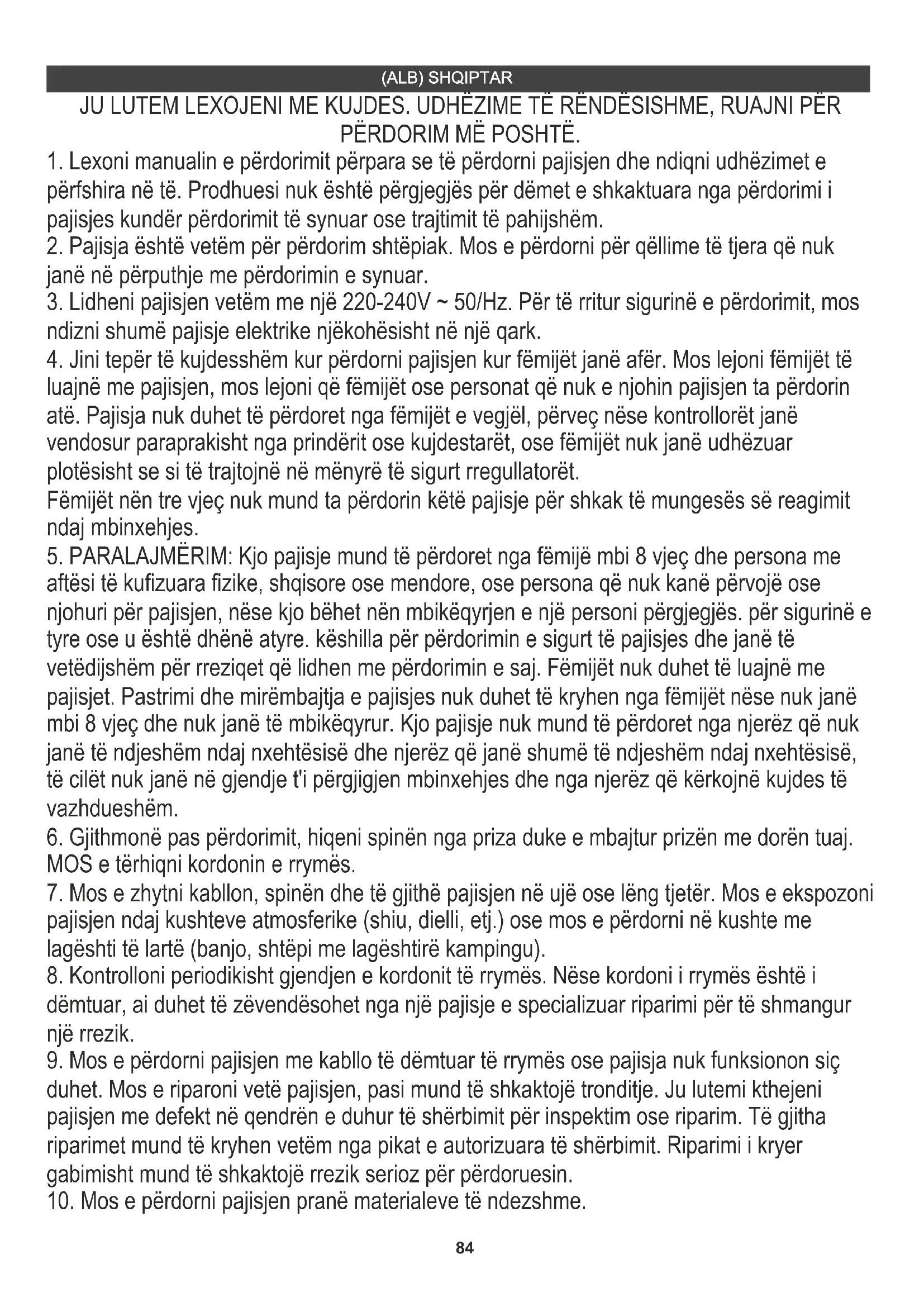 5. PARALAJMËRIM: Kjo pajisje mund të përdoret nga fëmijë mbi 8 vjeç dhe persona me