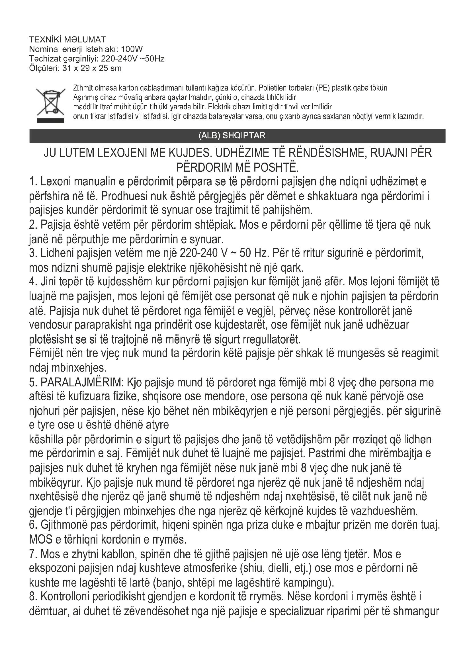 5. PARALAJMËRIM: Kjo pajisje mund të përdoret nga fëmijë mbi 8 vjeç dhe persona me