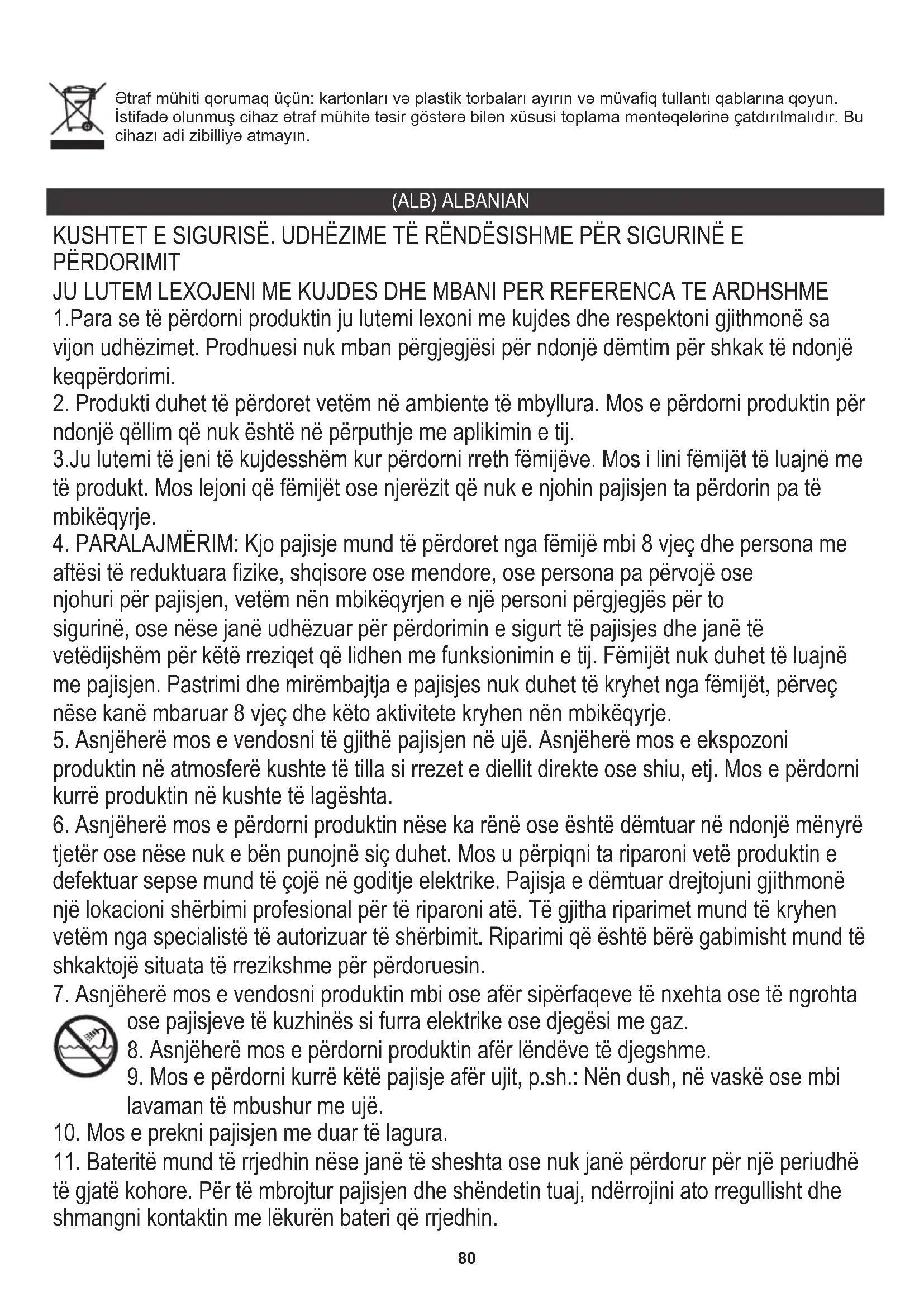 të gjatë kohore. Për të mbrojtur pajisjen dhe shëndetin tuaj, ndërrojini ato rregullisht dhe shmangni kontaktin me lëkurën bateri që rrjedhin. 1.Para se të përdorni produktin ju lutemi lexoni me kujdes dhe respektoni gjithmonë sa vijon udhëzimet. Prodhuesi nuk mban përgjegjësi për ndonjë dëmtim për shkak të ndonjë keqpërdorimi. sigurinë, ose nëse janë udhëzuar për përdorimin e sigurt të pajisjes dhe janë të vetëdijshëm për këtë rreziqet që lidhen me funksionimin e tij. Fëmijët nuk duhet të luajnë me pajisjen. Pastrimi dhe mirëmbajtja e pajisjes nuk duhet të kryhet nga fëmijët, përveç nëse kanë mbaruar 8 vjeç dhe këto aktivitete kryhen nën mbikëqyrje.