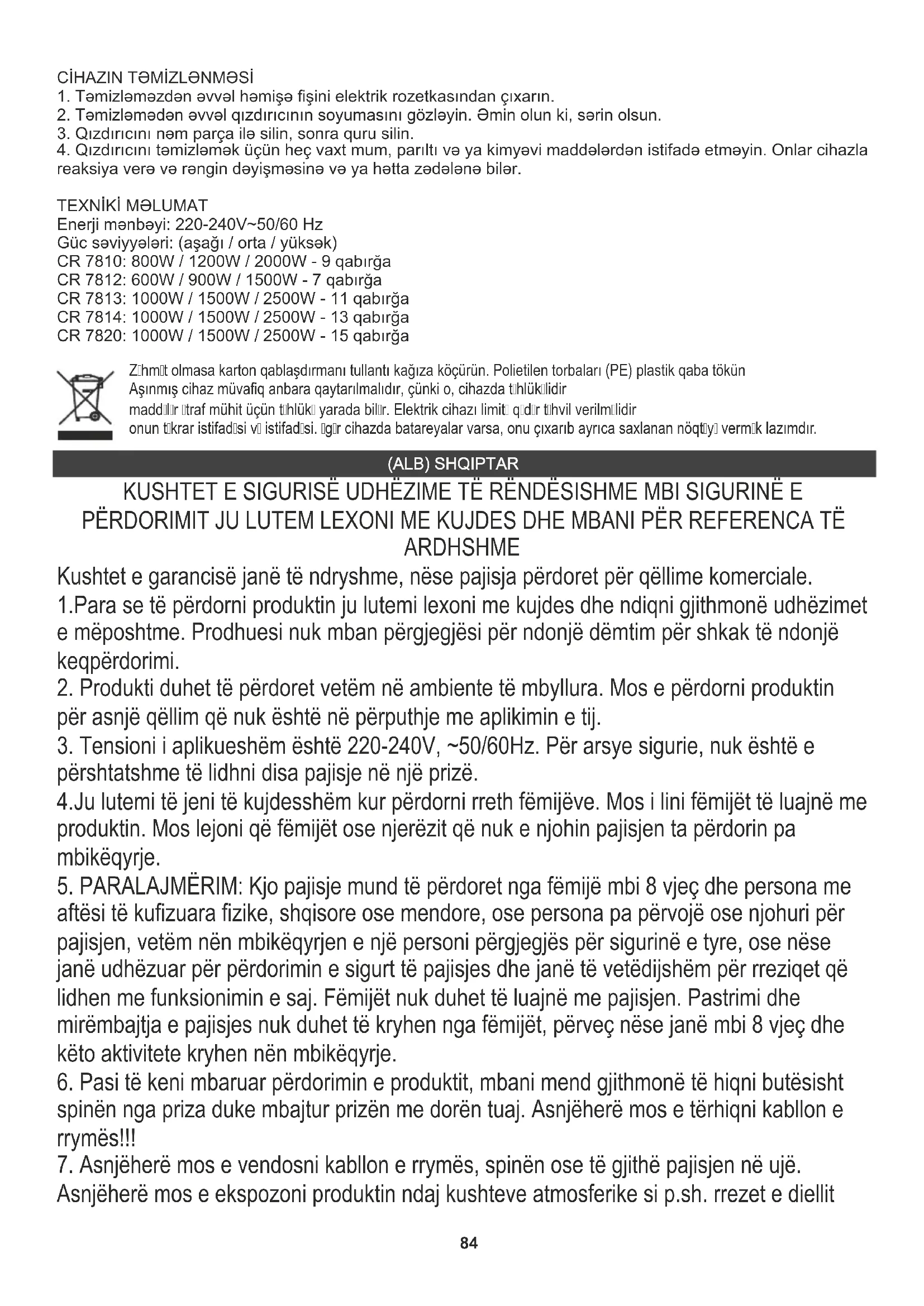 Burimi i energjisë: 220-240V~50/60 Hz Nivelet e fuqisë: (i ulët / mesatar / i lartë) CR 7812: 600W / 900W / 1500W - 7 brinjë CR 7810: 800W / 1200W / 2000W - 9 brinjë CR 7813: 1000 W / 1500 W / 2500 W - 11 brinjë CR 7814: 1000 W / 1500 W / 2500 W - 13 brinjë CR 7820: 1000 W / 1500 W / 2500 W - 15 brinjë Ju lutemi transferoni paketimin e kartonit në letër të mbeturinave. Hidhni qeset e polietilenit (PE) në enë plastike Pajisja e konsumuar duhet të kthehet në vendin e duhur të ruajtjes sepse është e rrezikshme në pajisje përbërësit mund të përbëjnë një kërcënim për mjedisin. Pajisja elektrike duhet të dorëzohet në kufi ripërdorimin dhe përdorimin e tij. Nëse në pajisje ka bateri, duhet të hiqni dhe t'i jepni pikës së ruajtur veçmas.88