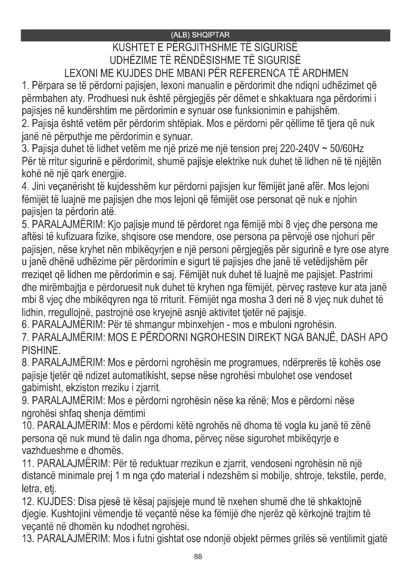 13. PARALAJMËRIM: Mos i futni gishtat ose ndonjë objekt përmes grilës së ventilimit gjatë89