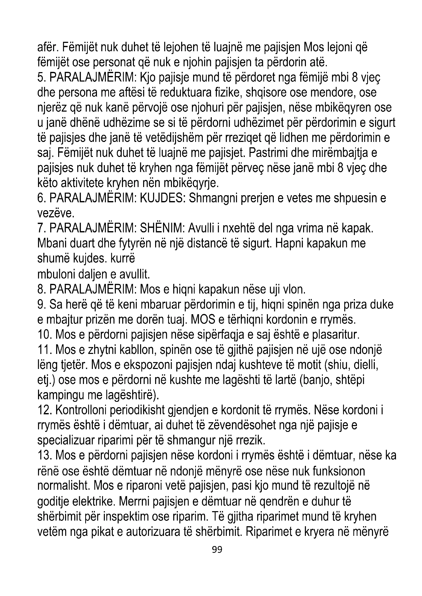 dhe persona me aftësi të reduktuara fizike, shqisore ose mendore, ose njerëz që nuk kanë përvojë ose njohuri për pajisjen, nëse mbikëqyren ose u janë dhënë udhëzime se si të përdorni udhëzimet për përdorimin e sigurt të pajisjes dhe janë të vetëdijshëm për rreziqet që lidhen me përdorimin e saj. Fëmijët nuk duhet të luajnë me pajisjet. Pastrimi dhe mirëmbajtja e pajisjes nuk duhet të kryhen nga fëmijët përveç nëse janë mbi 8 vjeç dhe këto aktivitete kryhen nën mbikëqyrje.