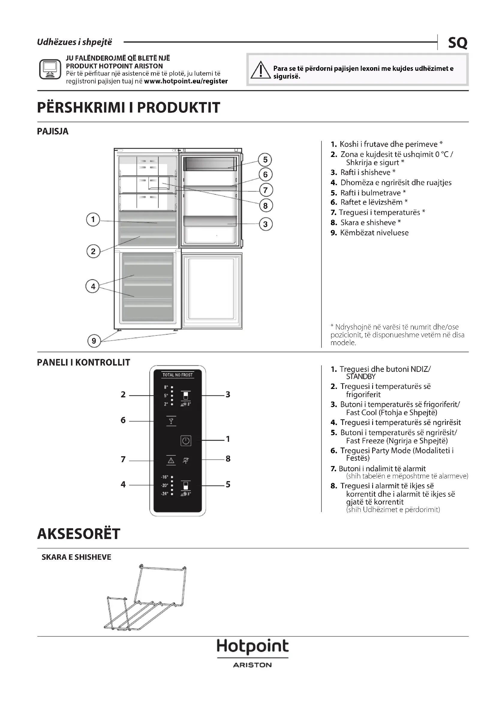 JU FALËNDEROJMË QË BLETË NJË PRODUKT HOTPOINT ARISTONPër të përtuar një asistencë më të plotë, ju lutemi të regjistroni pajisjen tuaj në www . hotpoint .eu/register Para se të përdorni pajisjen lexoni me kujdes udhëzimet e sigurisë. AKSESORËT SKARA E SHISHEVEPËRDORIMI PËR HERË TË PARË