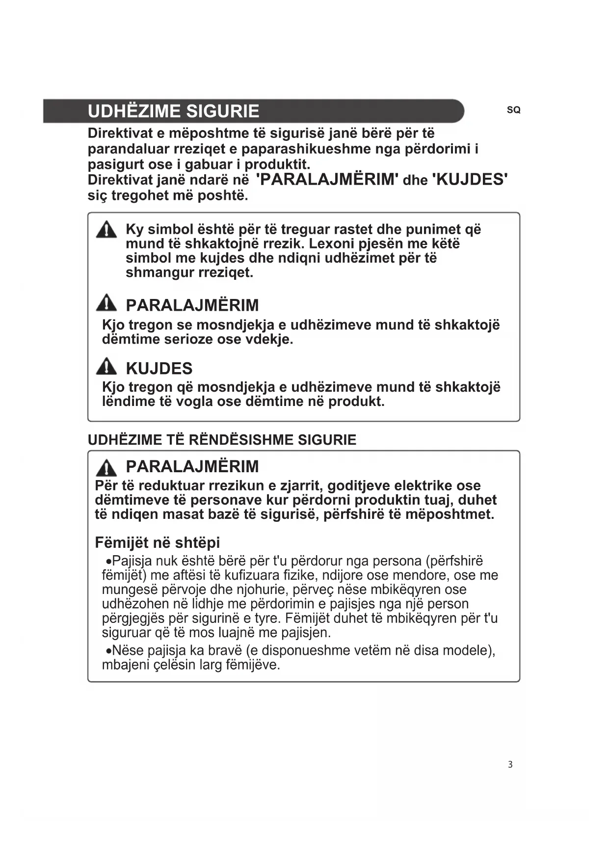 - Nëse pajisja ka bravë (e disponueshme vetëm në disa modele), mbajeni çelësin larg fëmijëve. Ky simbol është për të treguar rastet dhe punimet që mund të shkaktojnë rrezik. Lexoni pjesën me këtë simbol me kujdes dhe ndiqni udhëzimet për të shmangur rreziqet. PARALAJMËRIM Kjo tregon se mosndjekja e udhëzimeve mund të shkaktojë dëmtime serioze ose vdekje. KUJDES Kjo tregon që mosndjekja e udhëzimeve mund të shkaktojë lëndime të vogla ose dëmtime në produkt. 3SQ Për përdorim në Evropë: Kjo pajisje mund të përdoret nga fëmijët e moshës 8 vjeç e sipër dhe nga persona me aftësi të kufizuara fizike, ndijore ose mendore ose me mungesë përvoje dhe njohurie nëse mbikëqyren ose udhëzohen në lidhje me përdorimin e pajisjes në një mënyrë të sigurt dhe i kuptojnë rreziqet që përfshihen. Fëmijët nuk duhet të luajnë me pajisjen. Pastrimi dhe mirëmbajtja nga përdoruesi nuk duhet të bëhet nga fëmijët pa mbikëqyrje. Instalimi