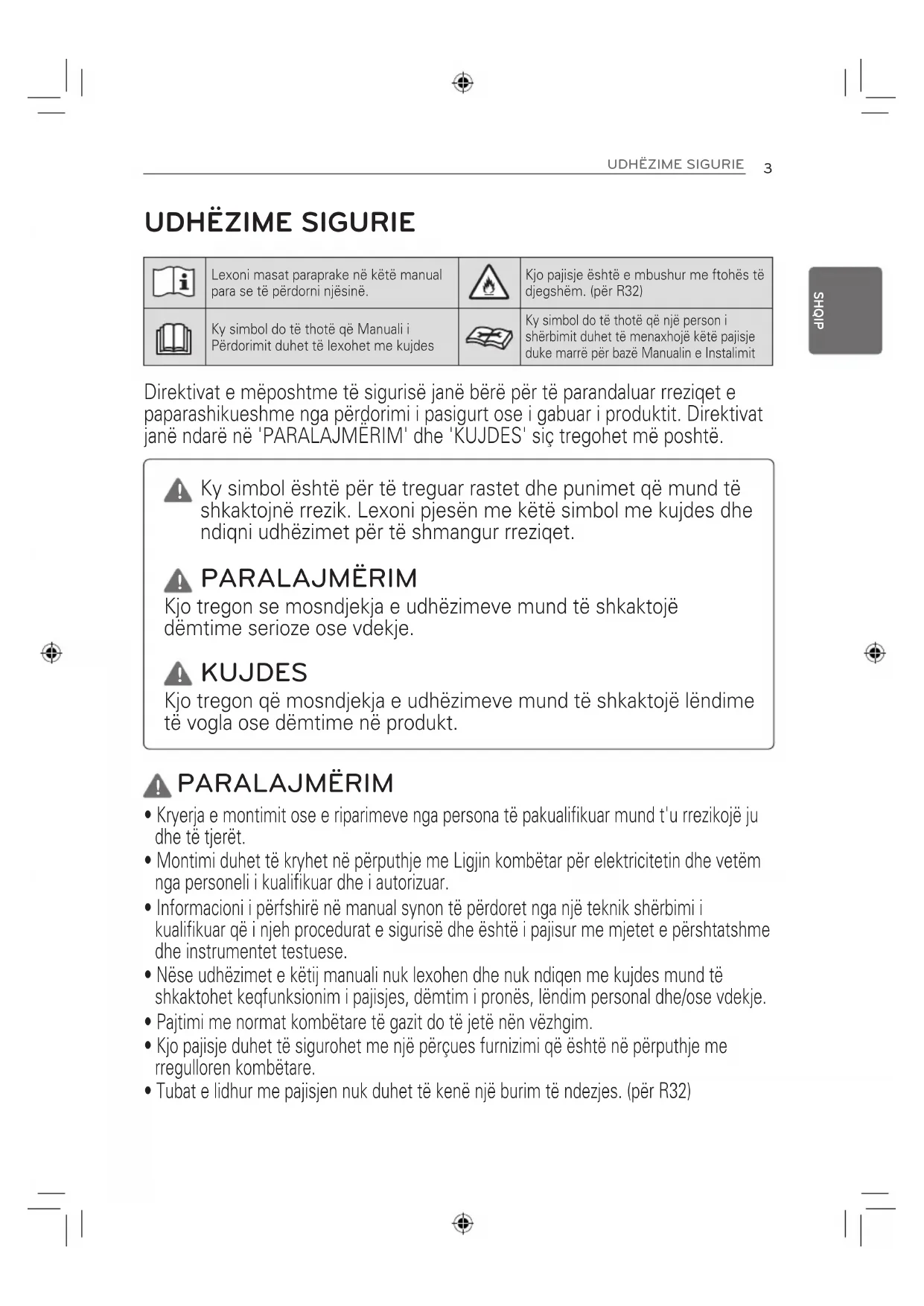 Lexoni masat paraprake në këtë manual para se të përdorni njësinë. Kjo pajisje është e mbushur me ftohës të djegshëm. (për R32) Ky simbol do të thotë që Manuali i Përdorimit duhet të lexohet me kujdes Ky simbol do të thotë që një person i shërbimit duhet të menaxhojë këtë pajisje duke marrë për bazë Manualin e Instalimit PARALAJMËRIM Kjo tregon se mosndjekja e udhëzimeve mund të shkaktojë dëmtime serioze ose vdekje. KUJDES Kjo tregon që mosndjekja e udhëzimeve mund të shkaktojë lëndime të vogla ose dëmtime në produkt. Ky simbol është për të treguar rastet dhe punimet që mund të shkaktojnë rrezik. Lexoni pjesën me këtë simbol me kujdes dhe ndiqni udhëzimet për të shmangur rreziqet.