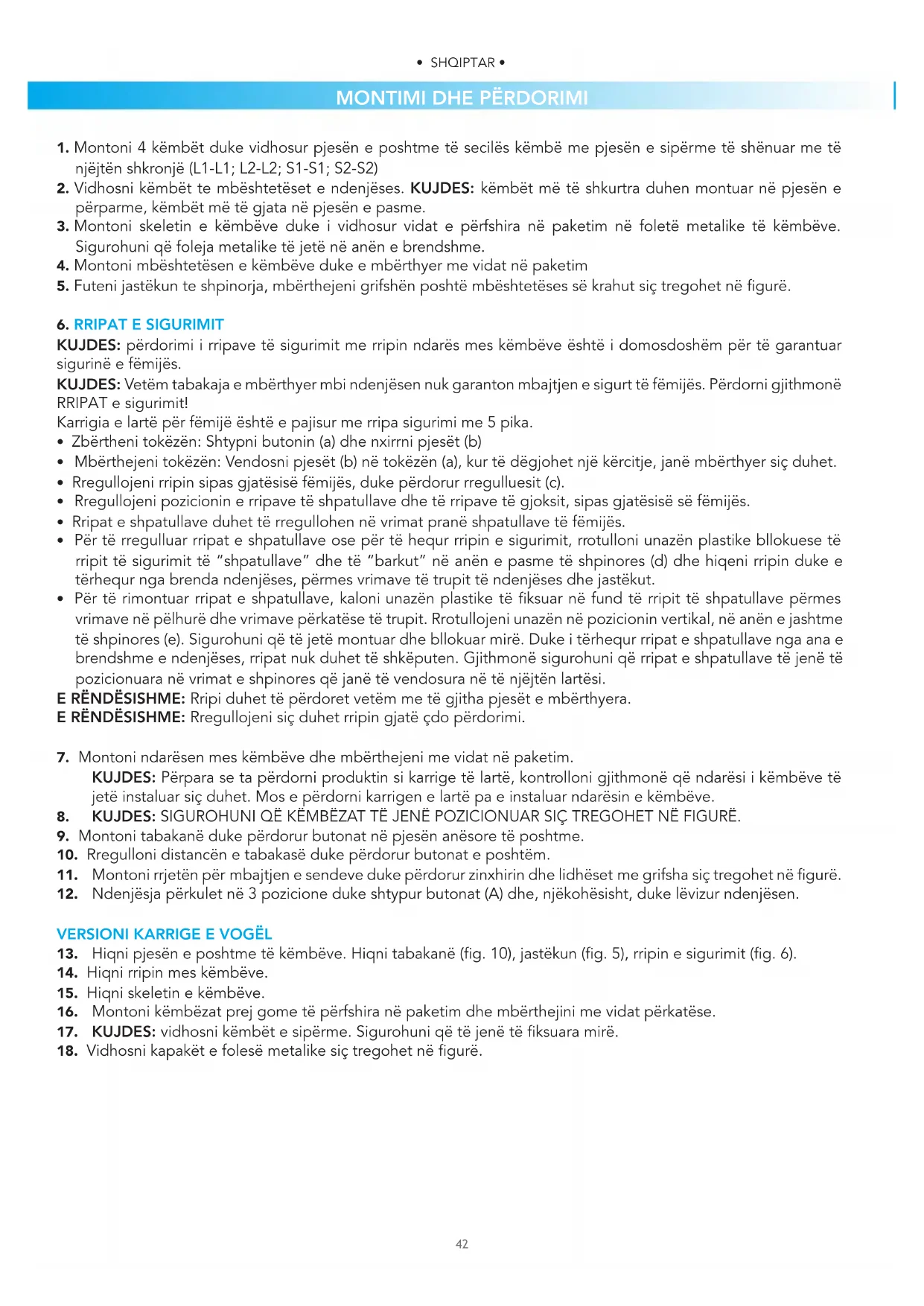 17. KUJDES: vidhosni këmbët e sipërme. Sigurohuni që të jenë të ksuara mirë.
