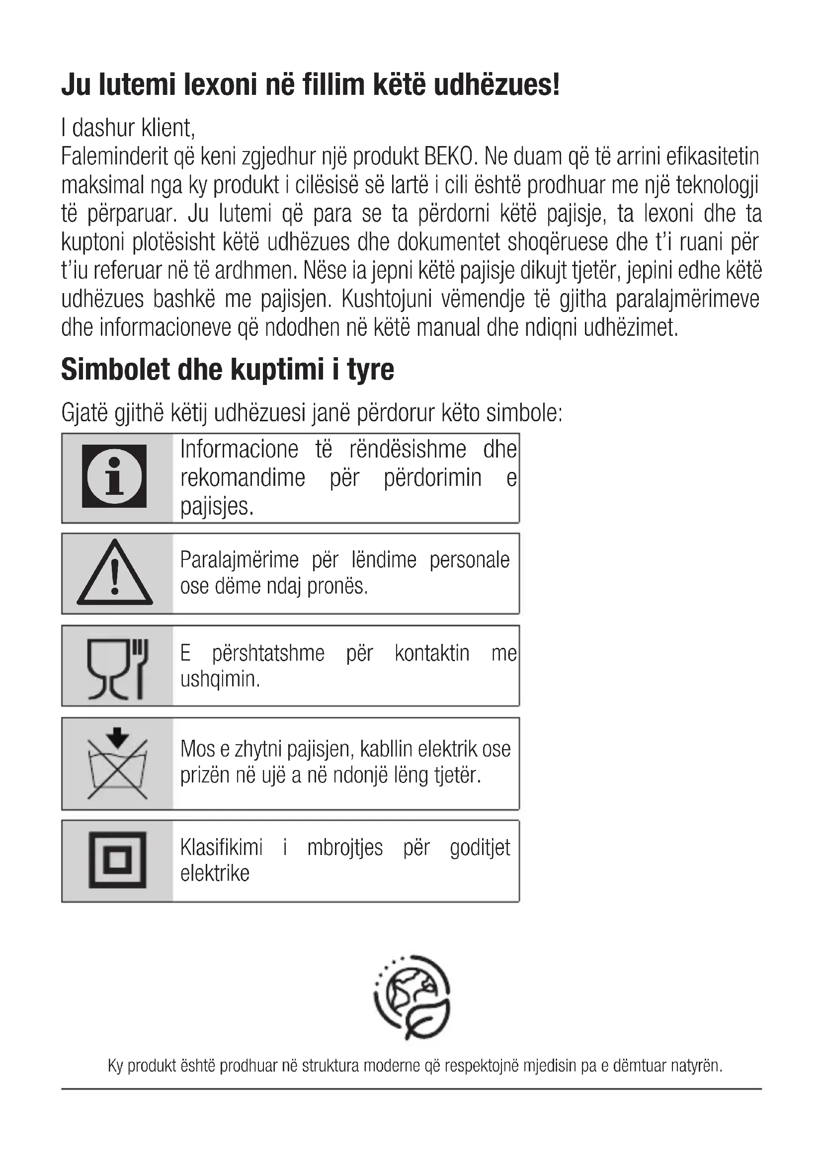 - Ako uređaj padne, uređaj možda neće raditi ili može doći do trajnih oštećenja.Ju lutemi lexoni në fillim këtë udhëzues! I dashur klient, Faleminderit që keni zgjedhur një produkt BEKO. Ne duam që të arrini efikasitetin maksimal nga ky produkt i cilësisë së lartë i cili është prodhuar me një teknologji të përparuar. Ju lutemi që para se ta përdorni këtë pajisje, ta lexoni dhe ta kuptoni plotësisht këtë udhëzues dhe dokumentet shoqëruese dhe t’i ruani për t’iu referuar në të ardhmen. Nëse ia jepni këtë pajisje dikujt tjetër, jepini edhe këtë udhëzues bashkë me pajisjen. Kushtojuni vëmendje të gjitha paralajmërimeve dhe informacioneve që ndodhen në këtë manual dhe ndiqni udhëzimet. Simbolet dhe kuptimi i tyre Gjatë gjithë këtij udhëzuesi janë përdorur këto simbole: