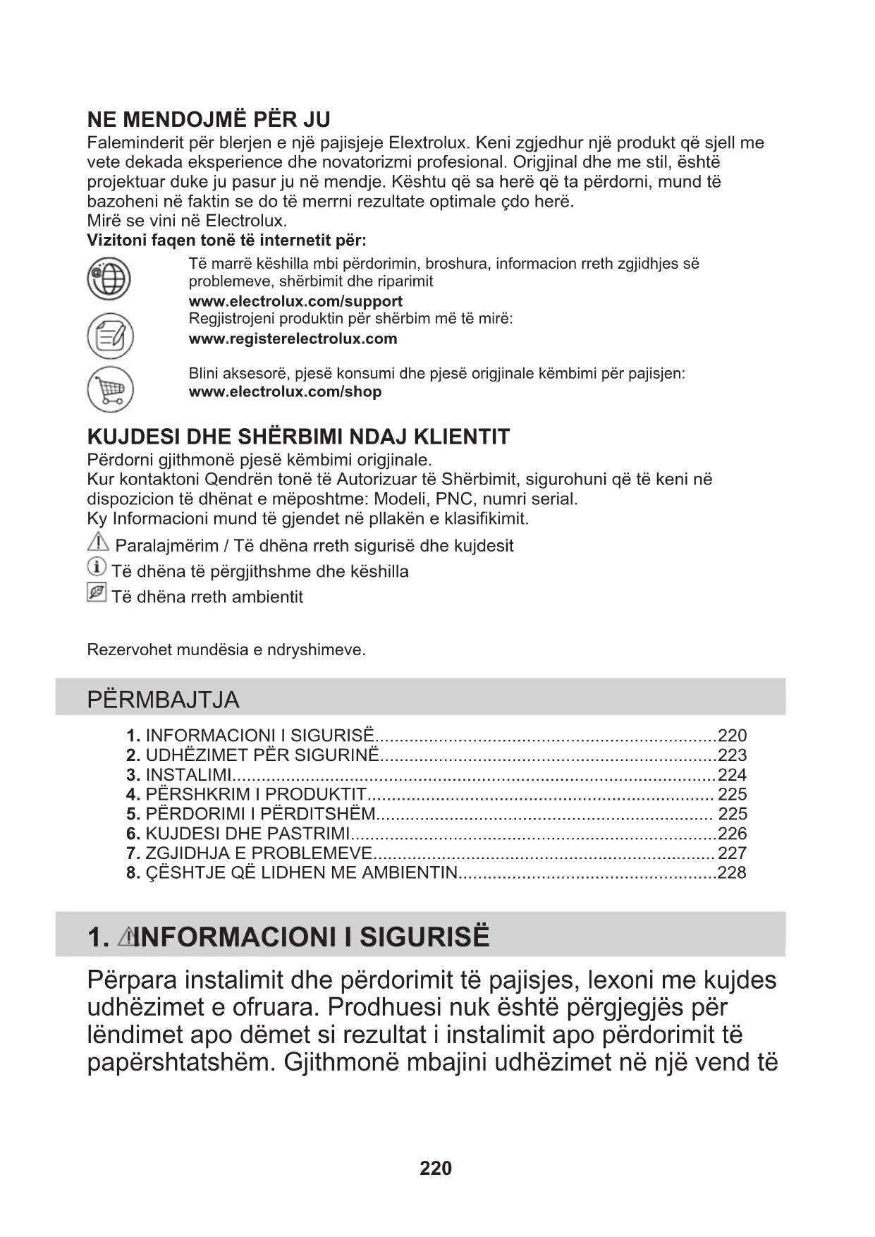 Faleminderit për blerjen e një pajisjeje Elextrolux. Keni zgjedhur një produkt që sjell mevete dekada eksperience dhe novatorizmi profesional. Origjinal dhe me stil, ështëprojektuar duke ju pasur ju në mendje. Kështu që sa herë që ta përdorni, mund tëbazoheni në faktin se do të merrni rezultate optimale çdo herë.Mirë se vini në Electrolux.Vizitoni faqen tonë të internetit për:Të marrë këshilla mbi përdorimin, broshura, informacion rreth zgjidhjes sëproblemeve, shërbimit dhe riparimitwww.electrolux.com/supportRegjistrojeni produktin për shërbim më të mirë:www.registerelectrolux.comBlini aksesorë, pjesë konsumi dhe pjesë origjinale këmbimi për pajisjen:www.electrolux.com/shop