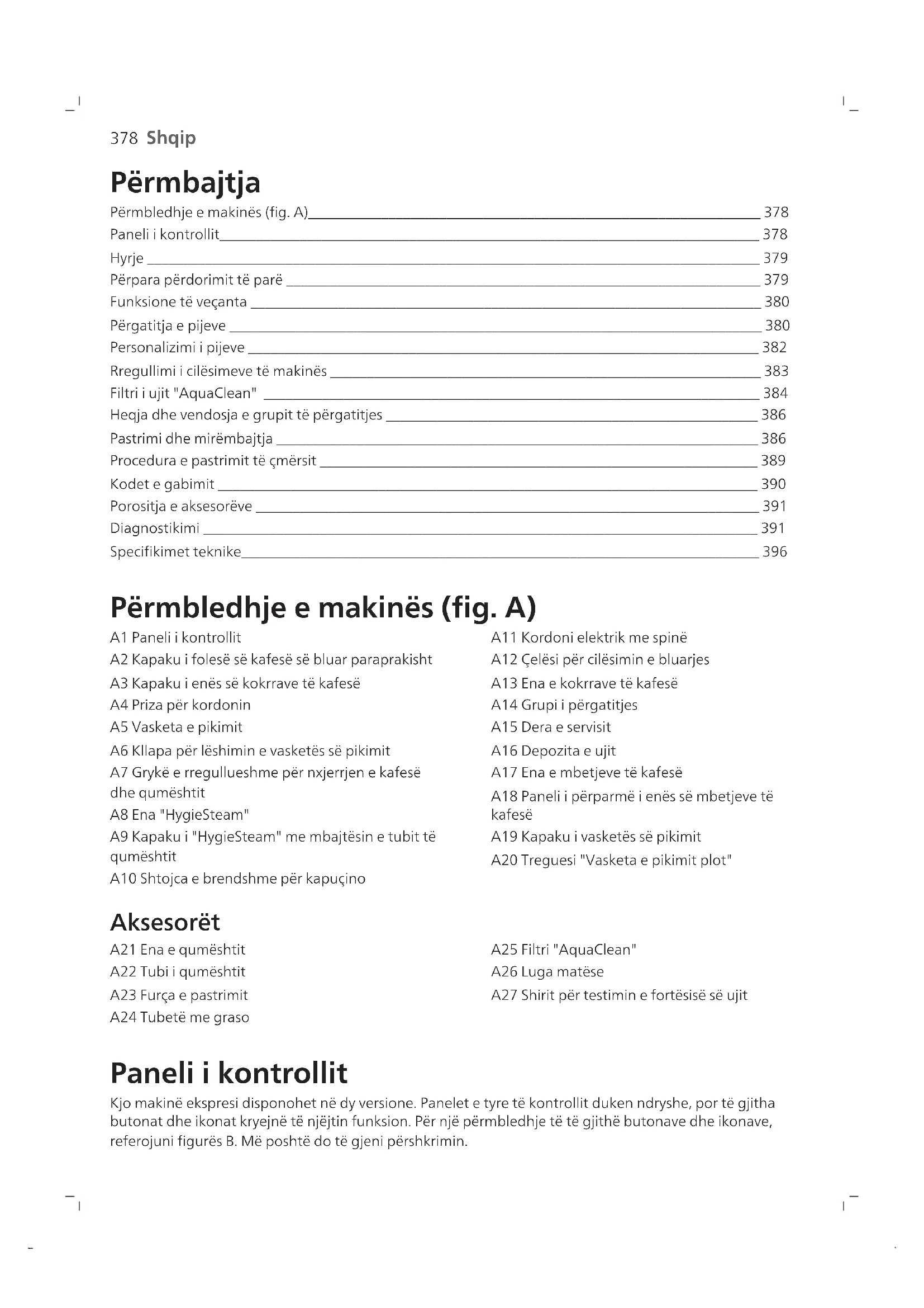 Shqip Përmbajtja Përmbledhje e makinës (fig. A)______________________________________________________________ 378 Paneli i kontrollit__________________________________________________________________________ 378 Hyrje ____________________________________________________________________________________ 379 Përpara përdorimit të parë _________________________________________________________________ 379 Funksione të veçanta ______________________________________________________________________ 380 Përgatitja e pijeve _________________________________________________________________________ 380 Personalizimi i pijeve ______________________________________________________________________ 382 Rregullimi i cilësimeve të makinës ___________________________________________________________ 383 Filtri i ujit "AquaClean" ____________________________________________________________________ 384 Heqja dhe vendosja e grupit të përgatitjes ___________________________________________________ 386 Pastrimi dhe mirëmbajtja __________________________________________________________________ 386 Procedura e pastrimit të çmërsit ____________________________________________________________ 389 Kodet e gabimit __________________________________________________________________________ 390 Porositja e aksesorëve _____________________________________________________________________ 391 Diagnostikimi ____________________________________________________________________________ 391 Specifikimet teknike_______________________________________________________________________ 396 Përmbledhje e makinës (fig. A) A1 Paneli i kontrollit A2 Kapaku i folesë së kafesë së bluar paraprakisht A3 Kapaku i enës së kokrrave të kafesë A4 Priza për kordonin A5 Vasketa e pikimit A6 Kllapa për lëshimin e vasketës së pikimit A7 Grykë e rregullueshme për nxjerrjen e kafesë dhe qumështit A8 Ena "HygieSteam" A9 Kapaku i "HygieSteam" me mbajtësin e tubit të qumështit A10 Shtojca e brendshme për kapuçino A11 Kordoni elektrik me spinë A12 Çelësi për cilësimin e bluarjes A13 Ena e kokrrave të kafesë A14 Grupi i përgatitjes A15 Dera e servisit A16 Depozita e ujit A17 Ena e mbetjeve të kafesë A18 Paneli i përparmë i enës së mbetjeve të kafesë A19 Kapaku i vasketës së pikimit A20 Treguesi "Vasketa e pikimit plot" Aksesorët A21 Ena e qumështit A22 Tubi i qumështit A23 Furça e pastrimit A24 Tubetë me graso A25 Filtri "AquaClean" A26 Luga matëse A27 Shirit për testimin e fortësisë së ujit Paneli i kontrollit Kjo makinë ekspresi disponohet në dy versione. Panelet e tyre të kontrollit duken ndryshe, por të gjitha butonat dhe ikonat kryejnë të njëjtin funksion. Për një përmbledhje të të gjithë butonave dhe ikonave, referojuni figurës B. Më poshtë do të gjeni përshkrimin.379 Shqip Përdorni shigjetat lart dhe poshtë për të lëvizur në ekran dhe prekni ikonën "OK" për të përzgjedhur ose konfirmuar zgjedhjen tuaj. B1 Butoni i ndezjes/fikjes B2 Ikonat e pijeve me një prekje B3 Ikona "CoffeeMaestro" B4 Menyja me më shumë pije B5 Butoni i ndezjes/fikjes . B6 Ikonat e navigimit (lart, poshtë, pas, ok) B7 Ekrani B8 Cilësimet e makinës B9 Menyja e pastrimit B10 Profilet personale Hyrje Ju përgëzojmë për blerjen e makinës së kafesë plotësisht automatike "Saeco"! Për të përfituar plotësisht nga mbështetja në internet që ofron "Saeco", shkoni te www.saeco.com/MyCoffeeMachine dhe regjistroni produktin tuaj. Shënim: Kjo makineri është testuar me kafe. Ndonëse është pastruar me kujdes, mund të ketë mbetje kafeje. Megjithatë, ju garantojmë se makina është absolutisht e re. Përpara përdorimit të parë