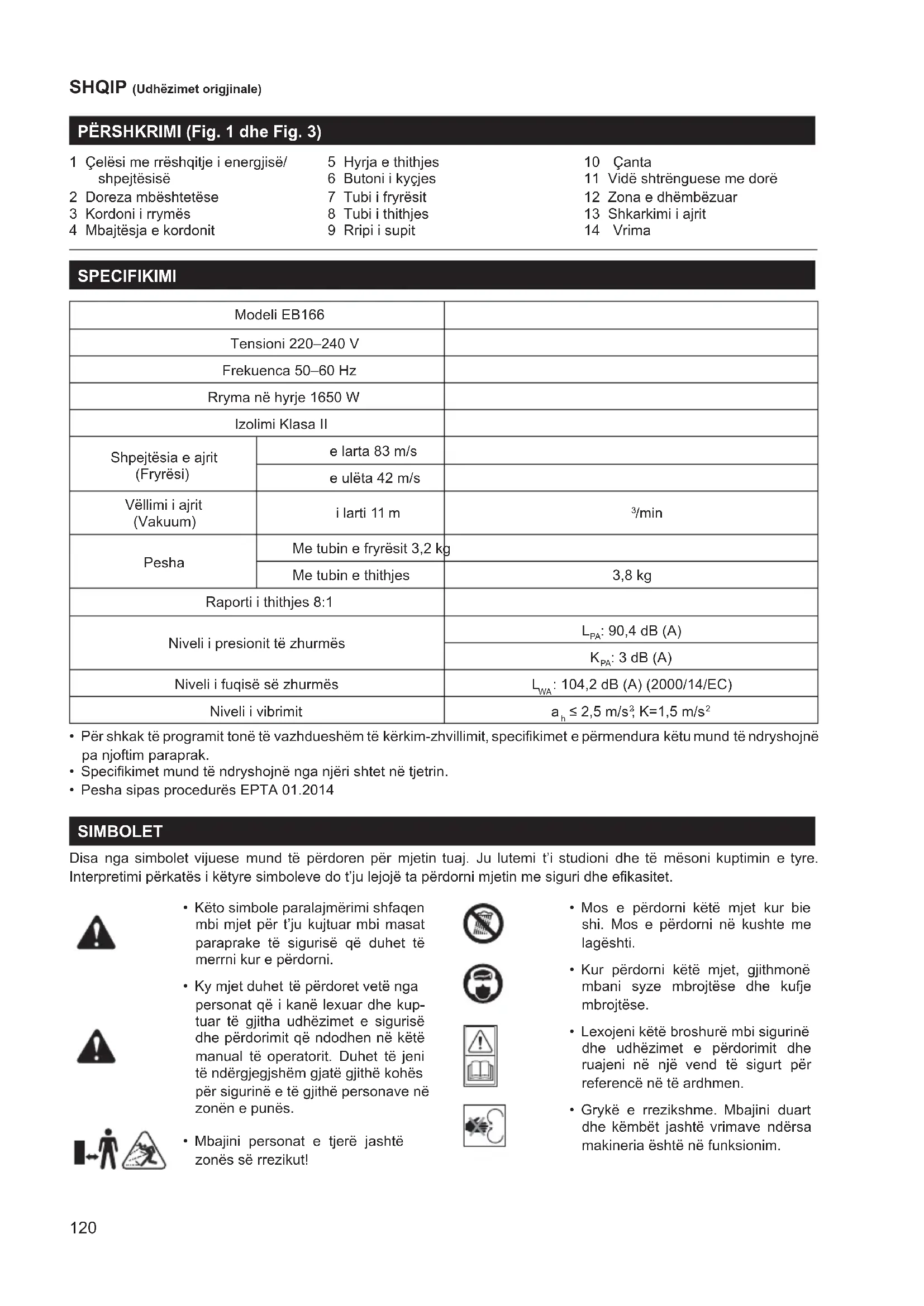 - Pastrojeni çantën mbledhëse sipas nevojës. Duke mbajtur mbrojtje për sytë, kthejeni mbrapsht çantën pas boshatisjes së parë dhe shkundeni fort për të nxjerrë pluhurin dhe copëzat. FLAKJA Produktet elektrike nuk duhet të aken poshtë bashkë me mbeturinat shtëpiake. Ju lutemi t’i ricikloni aty ku duhet. Konsultohuni me autoritetin vendor ose shitësin tuaj për këshilla mbi riciklimin.