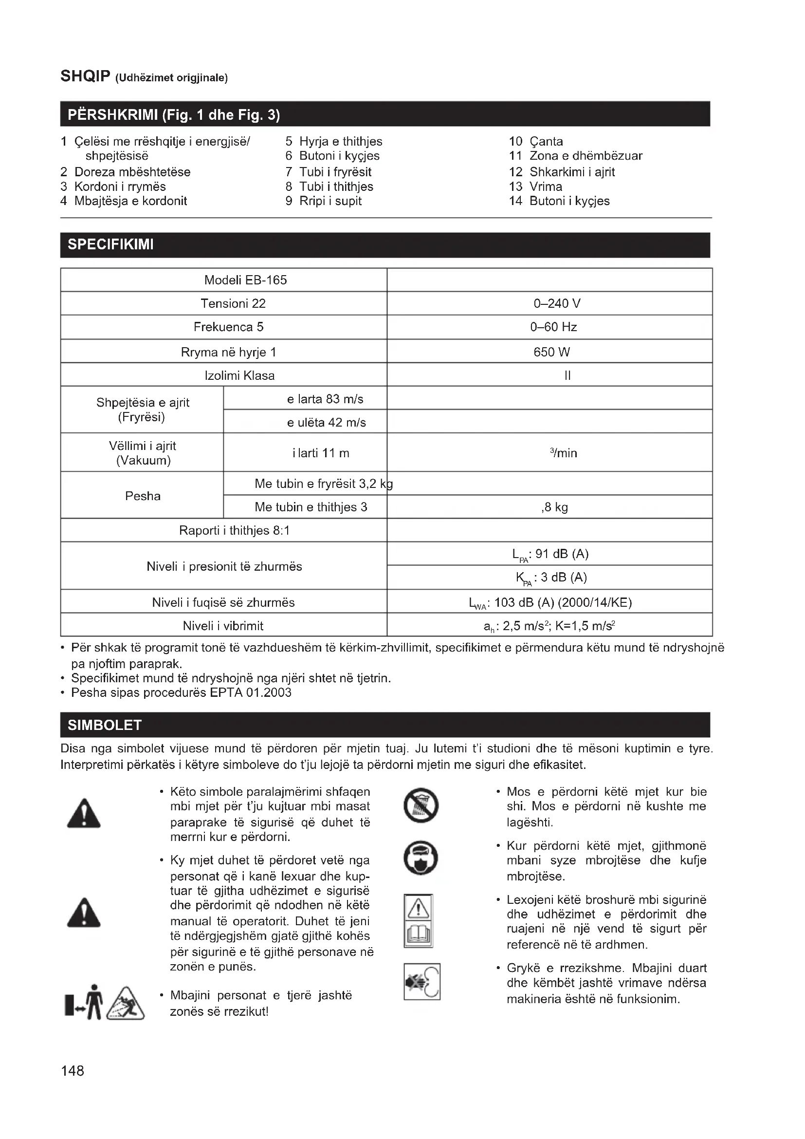 1 Zona e dhëmbëzuar 12 Shkarkimi i ajrit 13 Vrima 14 Butoni i kyçjes SPECIFIKIMI Modeli EB-165 Tensioni 22 0–240 V Frekuenca 5 0–60 Hz Rryma në hyrje 1 650 W Izolimi Klasa