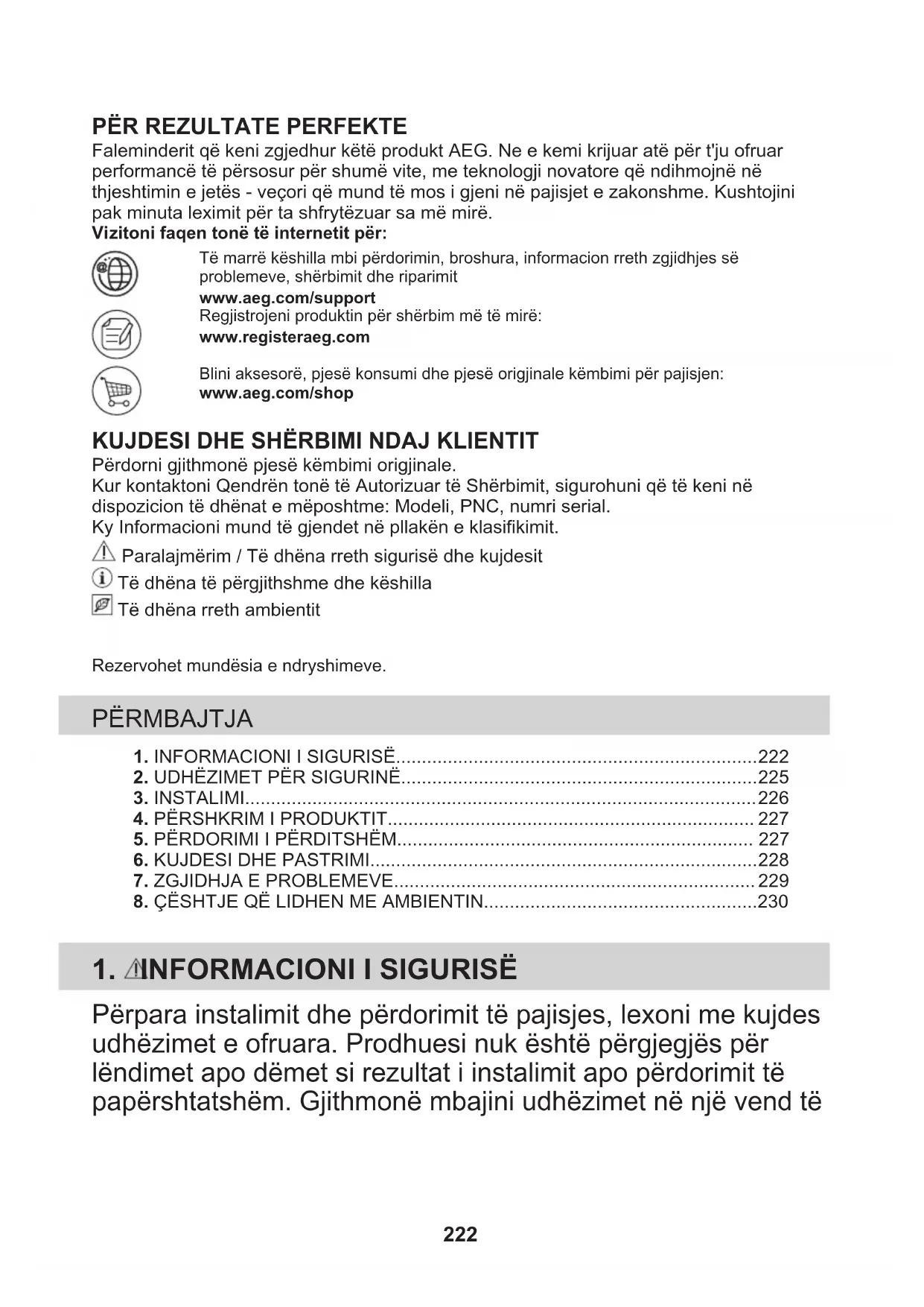 Faleminderit që keni zgjedhur këtë produkt AEG. Ne e kemi krijuar atë për t'ju ofruarperformancë të përsosur për shumë vite, me teknologji novatore që ndihmojnë nëthjeshtimin e jetës - veçori që mund të mos i gjeni në pajisjet e zakonshme. Kushtojinipak minuta leximit për ta shfrytëzuar sa më mirë.Vizitoni faqen tonë të internetit për:Të marrë këshilla mbi përdorimin, broshura, informacion rreth zgjidhjes sëproblemeve, shërbimit dhe riparimitwww.aeg.com/supportRegjistrojeni produktin për shërbim më të mirë:www.registeraeg.comBlini aksesorë, pjesë konsumi dhe pjesë origjinale këmbimi për pajisjen:www.aeg.com/shop