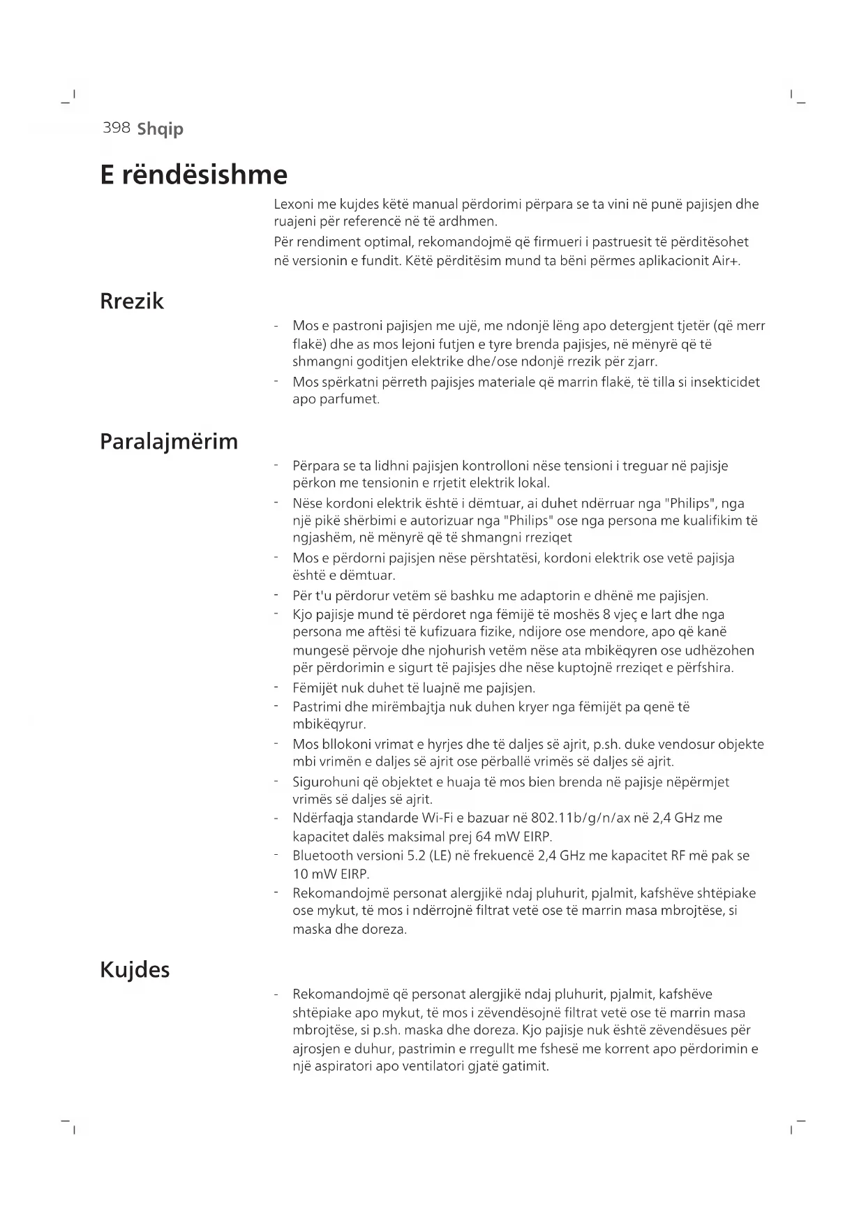 Bluetooth versioni 5.2 (LE) nè frekuencé 2,4 GHz me kapacitet RF mè pak se 10 mW EIRP. - Rekomandojmä personat allergjäk ñndaj pluhurit, pjalmit, kafshëve shtëpiake ose mykut, të mos inderrojne filtrat vetë ose të marrin masa mbrojëse, si maska dhe doreza.