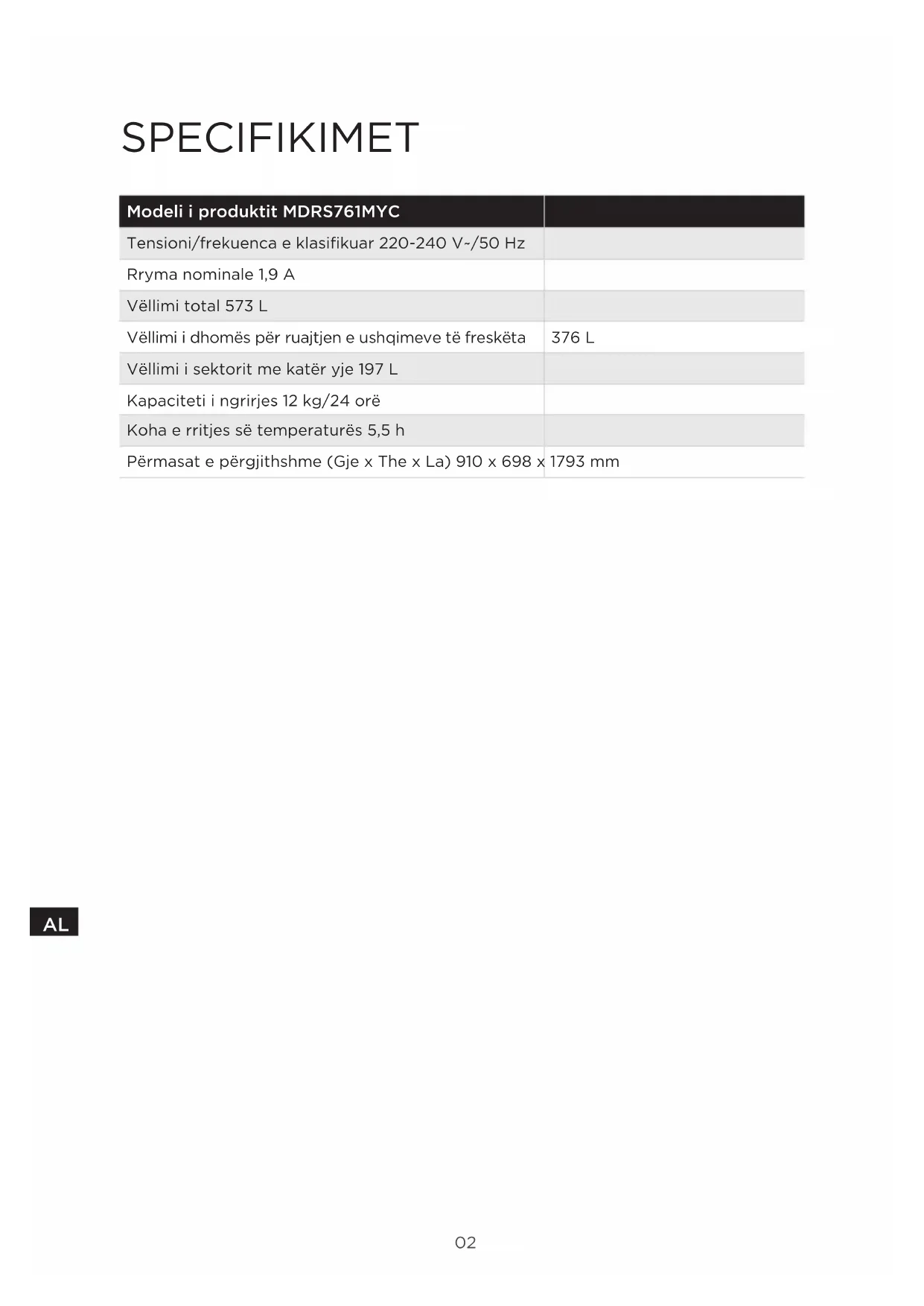 SPECIFIKIMET Modeli i produktit MDRS761MYC Tensioni/frekuenca e klasifikuar 220-240 V~/50 Hz Rryma nominale 1,9 A Vëllimi total 573 L Vëllimi i dhomës për ruajtjen e ushqimeve të freskëta 376 L Vëllimi i sektorit me katër yje 197 L Kapaciteti i ngrirjes 12 kg/24 orë Koha e rritjes së temperaturës 5,5 h Përmasat e përgjithshme (Gje x The x La) 910 x 698 x 1793 mm03