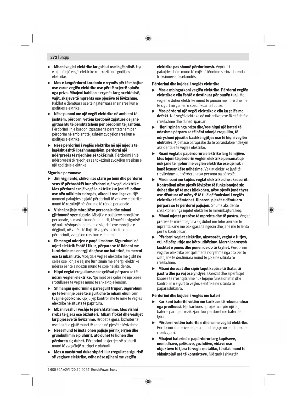 Литиум-јонски: Ве молиме внимавајте на напомените во делот Транспорт (види „Транспорт“, Страница271). Shqip Udhëzime sigurie Udhëzime të përgjithshme sigurie për veglat elektrike PARALAJMËRIM Lexoni të gjitha paralajmërimet e sigurisë, udhëzimet, ilustrimet dhe specifikimet e dhëna me këtë vegël elektrike. Mosrespektimi i informacionit të sigurisë dhe udhëzimeve të mëposhtme mund të shkaktojë goditje elektrike, zjarr dhe/ose lëndime serioze. Mbani të gjitha paralajmërimet dhe udhëzimet e sigurisë për referencë në të ardhmen. Termi «vegël elektrike» i përdorur në udhëzimet e sigurisë i referohet si veglave elektrike që funksionojnë me energji nga rrjeti (me kabllo) ashtu edhe veglave elektrike që funksionojnë me bateri (pa kabllo). Siguria në vendin e punës u Mbajeni zonën tuaj të punës të pastër dhe të ndriçuar mirë. Rrëmuja ose zonat e pandriçuara të punës mund të çojnë në aksidente. u Mos punoni me veglën elektrike në ambiente potencialisht shpërthyese që përmbajnë lëngje, gazra ose pluhur të ndezshëm. Mjetet elektrike krijojnë shkëndija që mund të ndezin pluhurin ose tymrat. u Mbani larg fëmijët dhe njerëzit e tjerë gjatë përdorimit të veglës elektrike. Ju mund të humbni kontrollin e veglës elektrike nëse jeni të pavëmendshëm. Siguria elektrike u Spina e veglës elektrike duhet të futet në prizë. Spina nuk duhet të modifikohet në asnjë mënyrë. Mos përdorni prizë përshtatëse së bashku me veglat elektrike me tokëzim mbrojtës. Prizat e pamodifikuara dhe prizat përkatëse do të zvogëlojnë rrezikun e goditjes elektrike. u Shmangni kontaktin trupor me sipërfaqet e tokëzuara si tubacionet, radiatorët, rrezet dhe frigoriferët. Ekziston një rrezik i shtuar i goditjes elektrike nëse trupi juaj është i tokëzuar. Bosch Power Tools 1 609 92A A2V | (20.12.2024)272 | Shqip u Mbani veglat elektrike larg shiut ose lagështisë. Hyrja e ujit në një vegël elektrike rrit rrezikun e goditjes elektrike. u Mos e keqpërdorni kordonin e rrymës për të mbajtur ose varur veglën elektrike ose për të nxjerrë spinën nga priza. Mbajeni kabllon e rrymës larg nxehtësisë, vajit, skajeve të mprehta ose pjesëve të lëvizshme. Kabllot e dëmtuara ose të ngatërruara rrisin rrezikun e goditjes elektrike. u Nëse punoni me një vegël elektrike në ambient të jashtëm, përdorni vetëm kordonët zgjatues që janë gjithashtu të përshtatshëm për përdorim të jashtëm. Përdorimi i një kordoni zgjatues të përshtatshëm për përdorim në ambient të jashtëm zvogëlon rrezikun e goditjes elektrike. u Nëse përdorimi i veglës elektrike në një mjedis të lagësht është i pashmangshëm, përdorni një ndërprerës të rrjedhjes së tokëzimit. Përdorimi i një ndërprerësi të rrjedhjes së tokëzimit zvogëlon rrezikun e një goditjeje elektrike. Siguria e personave u Jini vigjilentë, shikoni se çfarë po bëni dhe përdorni sens të përbashkët kur përdorni një vegël elektrike. Mos përdorni asnjë vegël elektrike kur jeni të lodhur ose nën ndikimin e drogës, alkoolit ose ilaçeve. Një moment pakujdesie gjatë përdorimit të veglave elektrike mund të rezultojë në lëndime të rënda personale. u Vishni pajisje mbrojtëse personale dhe mbani gjithmonë syze sigurie. Mbajtja e pajisjeve mbrojtëse personale, si maska kundër pluhurit, këpucët e sigurisë që nuk rrëshqasin, helmeta e sigurisë ose mbrojtja e dëgjimit, në varësi të llojit të veglës elektrike dhe përdorimit, zvogëlon rrezikun e lëndimit. u Shmangni ndezjen e paqëllimshme. Sigurohuni që mjeti elektrik është i fikur, përpara se të lidheni me furnizimin me energji dhe/ose me baterinë, ta merrni ose ta mbani atë. Mbajtja e veglës elektrike me gisht në çelës ose lidhja e saj me furnizimin me energji elektrike ndërsa është e ndezur mund të çojë në aksidente. u Hiqni veglat rregulluese ose çelësat përpara se të ndizni veglën elektrike. Një mjet ose çelës në një pjesë rrotulluese të veglës mund të shkaktojë lëndim. u Shmangni qëndrimin e parregullt trupor. Sigurohuni që të keni një bazë të sigurt dhe të mbani ekuilibrin tuaj në çdo kohë. Kjo ju jep kontroll më të mirë të veglës elektrike në situata të papritura. u Mbani veshur veshje të përshtatshme. Mos vishni rroba të gjera ose bizhuteri. Mbani flokët dhe veshjet larg pjesëve të lëvizshme. Rrobat e gjera, bizhuteritë ose flokët e gjatë mund të kapen në pjesët e lëvizshme. u Nëse mund të instalohen pajisje për nxjerrjen dhe grumbullimin e pluhurit, ato duhet të lidhen dhe përdoren siç duhet. Përdorimi i nxjerrjes së pluhurit mund të zvogëlojë rreziqet e pluhurit. u Mos u mashtroni duke shpërfillur rregullat e sigurisë së veglave elektrike, edhe nëse njiheni me veglën elektrike pas shumë përdorimesh. Veprimi i pakujdesshëm mund të çojë në lëndime serioze brenda fraksioneve të sekondës. Përdorimi dhe kujdesi i veglës elektrike u Mos e mbingarkoni veglën elektrike. Përdorni veglën elektrike e cila është e destinuar për punën tuaj. Me veglën e duhur elektrike mund të punoni më mirë dhe më të sigurt në gamën e specifikuar të fuqisë. u Mos përdorni një vegël elektrike e cila ka çelës me defekt. Një vegël elektrike që nuk ndizet ose fiket është e rrezikshme dhe duhet riparuar. u Hiqni spinën nga priza dhe/ose hiqni një bateri të ndashme përpara se të bëni ndonjë rregullim, të ndryshoni pjesët e bashkëngjitjes ose të hiqni veglën elektrike. Kjo masë paraprake do të parandalojë ndezjen aksidentale të veglës elektrike. u Ruani veglat e papërdorura elektrike larg fëmijëve. Mos lejoni të përdorin veglën elektrike personat që nuk janë të njohur me veglën elektrike ose që nuk i kanë lexuar këto udhëzime. Veglat elektrike janë të