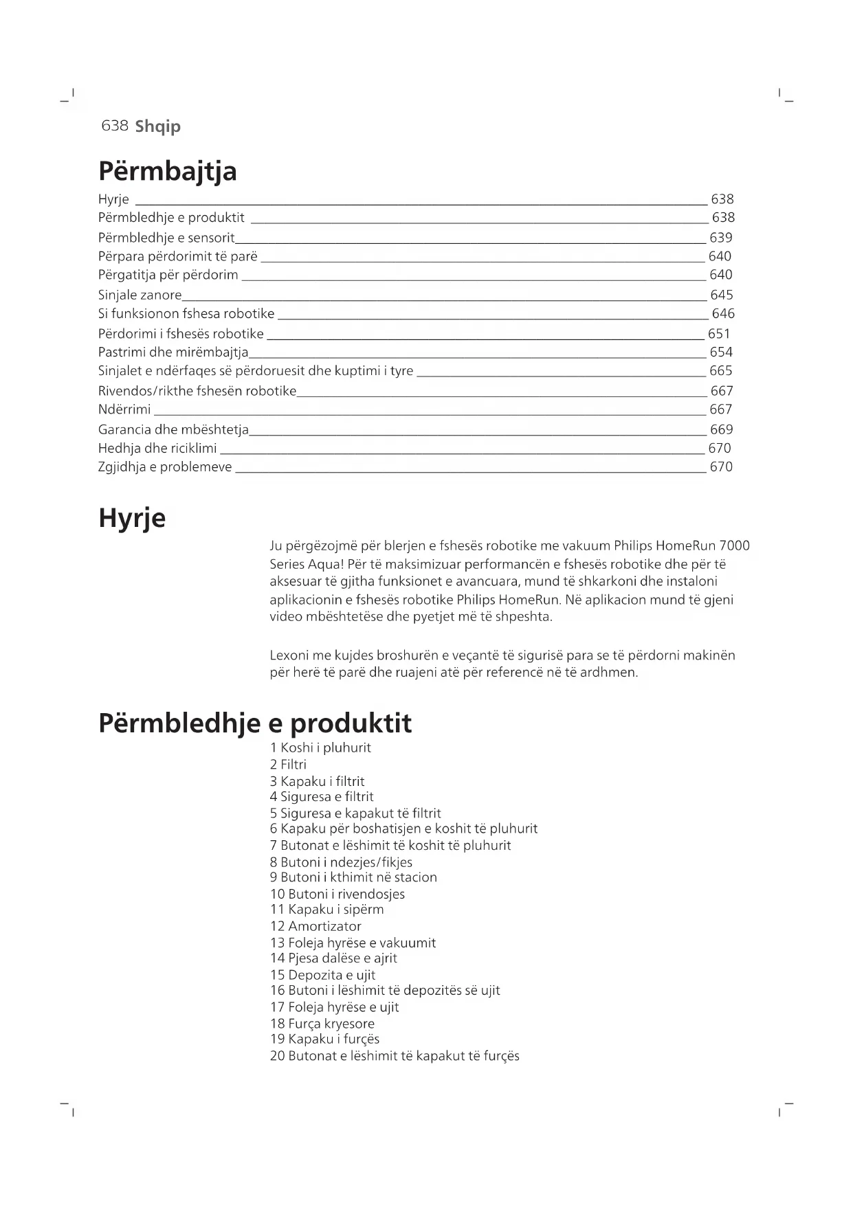 Shqip Përmbajtja Hyrje _____________________________________________________________________________________ 638 Përmbledhje e produktit ____________________________________________________________________ 638 Përmbledhje e sensorit______________________________________________________________________ 639 Përpara përdorimit të parë __________________________________________________________________ 640 Përgatitja për përdorim _____________________________________________________________________ 640 Sinjale zanore______________________________________________________________________________ 645 Si funksionon fshesa robotike ________________________________________________________________ 646 Përdorimi i fshesës robotike _________________________________________________________________ 651 Pastrimi dhe mirëmbajtja____________________________________________________________________ 654 Sinjalet e ndërfaqes së përdoruesit dhe kuptimi i tyre ___________________________________________ 665 Rivendos/rikthe fshesën robotike_____________________________________________________________ 667 Ndërrimi __________________________________________________________________________________ 667 Garancia dhe mbështetja____________________________________________________________________ 669 Hedhja dhe riciklimi ________________________________________________________________________ 670 Zgjidhja e problemeve ______________________________________________________________________ 670 Hyrje Ju përgëzojmë për blerjen e fshesës robotike me vakuum Philips HomeRun 7000 Series Aqua! Për të maksimizuar performancën e fshesës robotike dhe për të aksesuar të gjitha funksionet e avancuara, mund të shkarkoni dhe instaloni aplikacionin e fshesës robotike Philips HomeRun. Në aplikacion mund të gjeni video mbështetëse dhe pyetjet më të shpeshta. Lexoni me kujdes broshurën e veçantë të sigurisë para se të përdorni makinën për herë të parë dhe ruajeni atë për referencë në të ardhmen. Përmbledhje e produktit 1 Koshi i pluhurit 2 Filtri 3 Kapaku i filtrit 4 Siguresa e filtrit 5 Siguresa e kapakut të filtrit 6 Kapaku për boshatisjen e koshit të pluhurit 7 Butonat e lëshimit të koshit të pluhurit 8 Butoni i ndezjes/fikjes 9 Butoni i kthimit në stacion 10 Butoni i rivendosjes 11 Kapaku i sipërm 12 Amortizator 13 Foleja hyrëse e vakuumit 14 Pjesa dalëse e ajrit 15 Depozita e ujit 16 Butoni i lëshimit të depozitës së ujit 17 Foleja hyrëse e ujit 18 Furça kryesore 19 Kapaku i furçës 20 Butonat e lëshimit të kapakut të furçës639 Shqip 21 Rrotullat kryesore 22 Rrotulla e përparme 23 Pikat e kontaktit të karikimit (fshesa robotike) 24 Furça anësore 25 Mbajtësi i sfungjerit të larjes 26 Sfungjer për larje (2x) 27 Kordon elektrik (XU7000) 28 Stacioni (i karikimit) (XU7000) 29 Dritarja e sinjalit IR (XU7000) 30 Pikat e kontaktit të karikimit (stacioni) 31 Foleja e kordonit elektrik 32 Shtrojë (XU7000) 33 Qesja e pluhurit (2x) (XU7100) 34 Kapaku i kontejnerit 35 Ndarja e qeses së pluhurit 36 Stacioni i boshatisjes automatike (XU7100) 37 Drita treguese 38 Dritarja e sinjalit IR 39 Platforma 40 Foleja e boshatisjes automatike 41 Pjesa dalëse e ajrit të boshatisjes automatike 42 Pikat e kontaktit të karikimit (stacioni) 43 Dalja e shkarkimit 44 Mjet për pastrimin e furçës 45 Foleja e kordonit elektrik 46 Kordon elektrik (XU7100) Përmbledhje e sensorit
