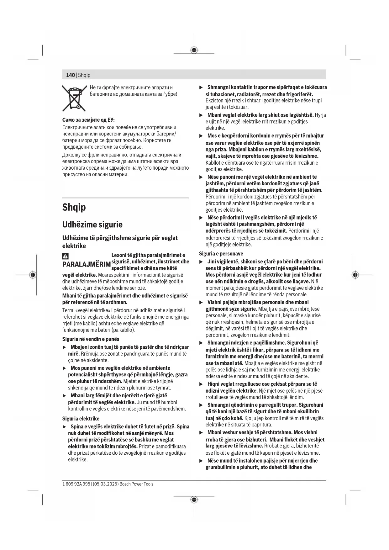 Niveli i dridhjeve dhe vlera e emetimit të zhurmës të dhëna në këto udhëzime janë matur sipas një metode matëse të standardizuar dhe mund të përdoren për të krahasuar veglat elektrike me njëra-tjetrën. Ato janë gjithashtu të përshtatshme për një vlerësim paraprak të emetimeve të dridhjeve dhe zhurmës. Niveli i dhënëi dridhjeve dhe vlera e emetimit të zhurmës përfaqësojnë aplikimet kryesore të veglës elektrike. Megjithatë, nëse vegla elektrik përdoret për përdorime të tjera, me mjete të ndryshme ose me mirëmbajtje të pamjaftueshme, niveli i dridhjeve dhe vlera e emetimit të zhurmës mund të ndryshojnë. Kjo mund të rrisë ndjeshëm emetimet e dridhjeve dhe zhurmës gjatë gjithë periudhës së punës. Për një vlerësim të saktë të emetimeve të dridhjeve dhe zhurmës, duhet të merren parasysh edhe kohët kur pajisja është e fikur ose është në punë, por nuk është në përdorim. Kjo mund të reduktojë ndjeshëm emetimet e dridhjeve dhe zhurmës gjatë gjithë periudhës së punës. Vendosni masa shtesë sigurie për të mbrojtur operatorin nga efektet e dridhjeve, të tilla si: mirëmbajtja e veglave dhe aksesorëve elektrikë, mbajtja e duarve të ngrohta, organizimi i proceseve të punës. Bateria Bosch shet vegla elektrike me bbateri dhe pa bateri.Nga paketimi mund të mësoni nëse me veglën tuaj elektrike është e përfshirë një bateri. Karikoni baterinë u Përdorni vetëm karikuesit e listuar në të dhënat teknike. Vetëm këta karikues janë përshtatur për baterinë Li-jon të përdorur në veglën tuaj elektrike. Shënim: Bateritë Li-jon dorëzohen pjesërisht të karikuara për shkak të rregulloreve ndërkombëtare të transportit.Për të siguruar funksionimin e plotë të baterisë, karikoni plotësisht baterinë përpara përdorimit të parë. Vendosni baterinë Rrëshqisni baterinë e karikuar në mbajtësen e baterisë derisa të klikojë në vend. Hiqni baterinë Për të hequr baterinë, shtypni butonat e lirimit të baterisë dhe tërhiqeni baterinë.Mos përdorni forcë. Treguesi i nivelit të karikimit të baterisë 3 LED jeshile të treguesit të nivelit të karikimit të baterisë tregojnë statusin e karikimit të baterisë. LED Kapaciteti Dritë e vazhdueshme 3× jeshile 68–100% Dritë e vazhdueshme 2× jeshile 22–68% Dritë e vazhdueshme 1× jeshile 2–22% Dritë pulsuese 1× jeshile 0–2% Udhëzime për trajtimin optimal të baterisë Mbroni baterinë nga lagështia dhe uji. Ruani baterinë vetëm në një interval temperaturash nga −20°C deri në 50°C. Për shembull, mos e lini baterinë në makinë gjatë verës. Një kohë tepër e reduktuar pune pas karikimit tregon që bateria është konsumuar dhe ajo duhet të zëvendësohet. Ndiqni udhëzimet e asgjësimit. Montim u Para se të kryeni ndonjë punë në veglën elektrike (p.sh. mirëmbajtje, ndryshim i veglave, etj.) hiqeni baterinë nga vegla elektrike. Ekziston rreziku i lëndimit nëse çelësi i ndezjes/fikjes shtypet pa dashje. Ndërrimi i veglës (shihfigurën A) Hapni çykun e shpimit pa çelës (2) duke e rrotulluar në drejtim ➊, derisa vegla të mund të futet. Fusni mjetin. Shtrëngoni fort grykën e çykut të shpimit pa çelës (2) me dorë në drejtim ➋. Kjo bllokon automatikisht çakun e shpimit pa çelës. Kyçja lirohet përsëri nëse rrotulloni grykën në drejtim të kundërt për të hequr veglën. Nxjerrja e pluhurit/ashklave Pluhuri nga materiale të tilla si boja me bazë plumbi, disa lloje druri, minerale dhe metali mund të jenë të dëmshëm për shëndetin. Prekja ose thithja e pluhurave mund të shkaktojë reaksione alergjike dhe/ose sëmundje të frymëmarrjes tek përdoruesi ose tek njerëzit pranë. Disa pluhura si pluhuri i lisit ose i ahut konsiderohen kancerogjene, veçanërisht në kombinim me aditivë për trajtimin e drurit (kromat, konservues druri). Materiali që përmban asbest mund të përpunohet vetëm nga specialistë. Bosch Power Tools 1 609 92A 995 | (05.03.2025)144 | Shqip – Sigurohuni që vendi i punës të jetë i ajrosur mirë. – Rekomandohet të vishni një maskë respiratore me filtër të klasës P2. Ju lutemi, vini re rregulloret e zbatueshme në vendin tuaj për materialet që do të përpunohen. u Shmangni grumbullimin e pluhurit në vendin e punës. Pluhuri mund të ndizet lehtësisht. Funksionimi Instalimi Caktoni drejtimin e rrotullimit (shih figurën B) Ju mund të përdorni drejtimin e çelësit të rrotullimit (5) për të ndryshuar drejtimin e rrotullimit të veglës elektrike. Megjithatë, kjo nuk është e mundur kur shtypet çelësi i ndezjes/fikjes (8). Rrotullimi në të djathtë: Për të shpuar dhe vidhosur vidhat, shtypni çelësin e drejtimit të rrotullimit (5) në të majtë aq sa mund të shkojë. Rrotullimi majtas: Për të liruar ose hequr vidhat, shtypni çelësin e drejtimit të rrotullimit (5) në të djathtë aq sa mund të shkojë. Përzgjidhni paraprakisht çift rrotullimin Me unazën e përcaktimit të parazgjedhjes së çift rrotullimit (3) mund të zgjidhni paraprakisht çift rrotullimin e kërkuar në 20 nivele. Nëse vendosja e veglës së përdorur është e saktë, mjeti ndalon sapo vidhoset në material ose arrihet çift rrotullimi i caktuar. Në pozicionin , çiftimi i mbingarkesave çaktivizohet p.sh. për shpim. Kur hiqni vidhat, mund të dëshironi të zgjidhni një cilësim më të lartë ose të përdorni simbolin . Në pozicionin arrihet çift rrotullimi maksimal për shpim dhe vidhosje. Zgjedhja e marsheve mekanike u Përdorni çelësin e zgjedhjes së marsheve (4) vetëm kur vegla elektrike është e ndaluar. u Gjithmonë shtyni levën e zgjedhjes së marsheve deri sa të shkojë. Përndryshe, vegla elektrike mund të dëmtohet. Me çelësin e zgjedhjes së marsheve (4) mund të zgjidhen paraprakisht 2 intervale shpejtësie. Pozicioni i levës së zgjedhjes së marsheve (4) Numri i rrotullime
