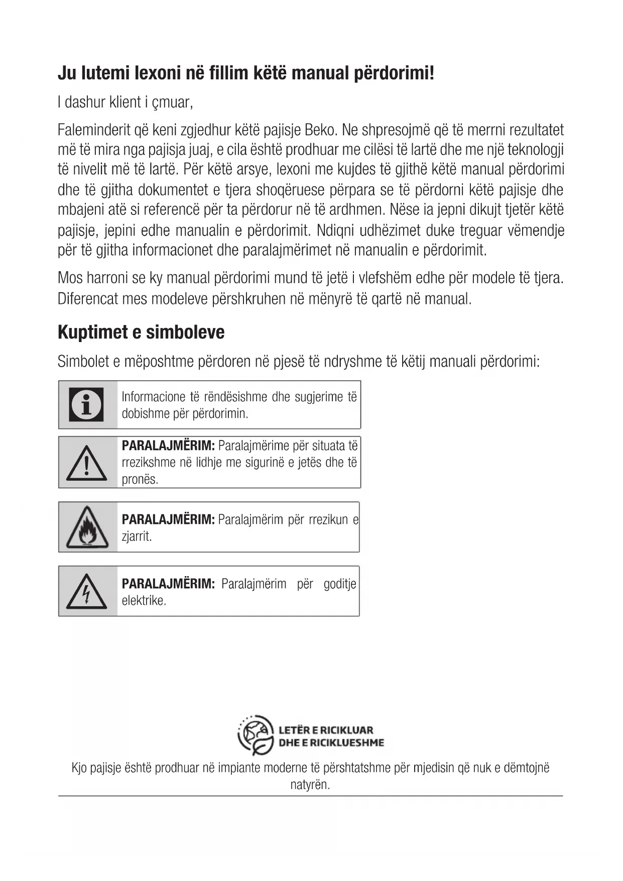 - Produktet Beko janë në për- puthje me standardet përkatëse të sigurisë; për këtë arsye, në rast dëmtimi të pajisjes ose të kabllos elektrike, ajo duhet të riparohet ose të zëvendësohet nga shitësi, qendra e shërbimit ose një specialist dhe shërbim i autorizuar i ngjashëm për të shmangur çdo rrezik. Riparimet e gabuara ose të pakualifikuara mund të jenë të rrezikshme dhe të shkaktojnë rrezik për për- doruesin.