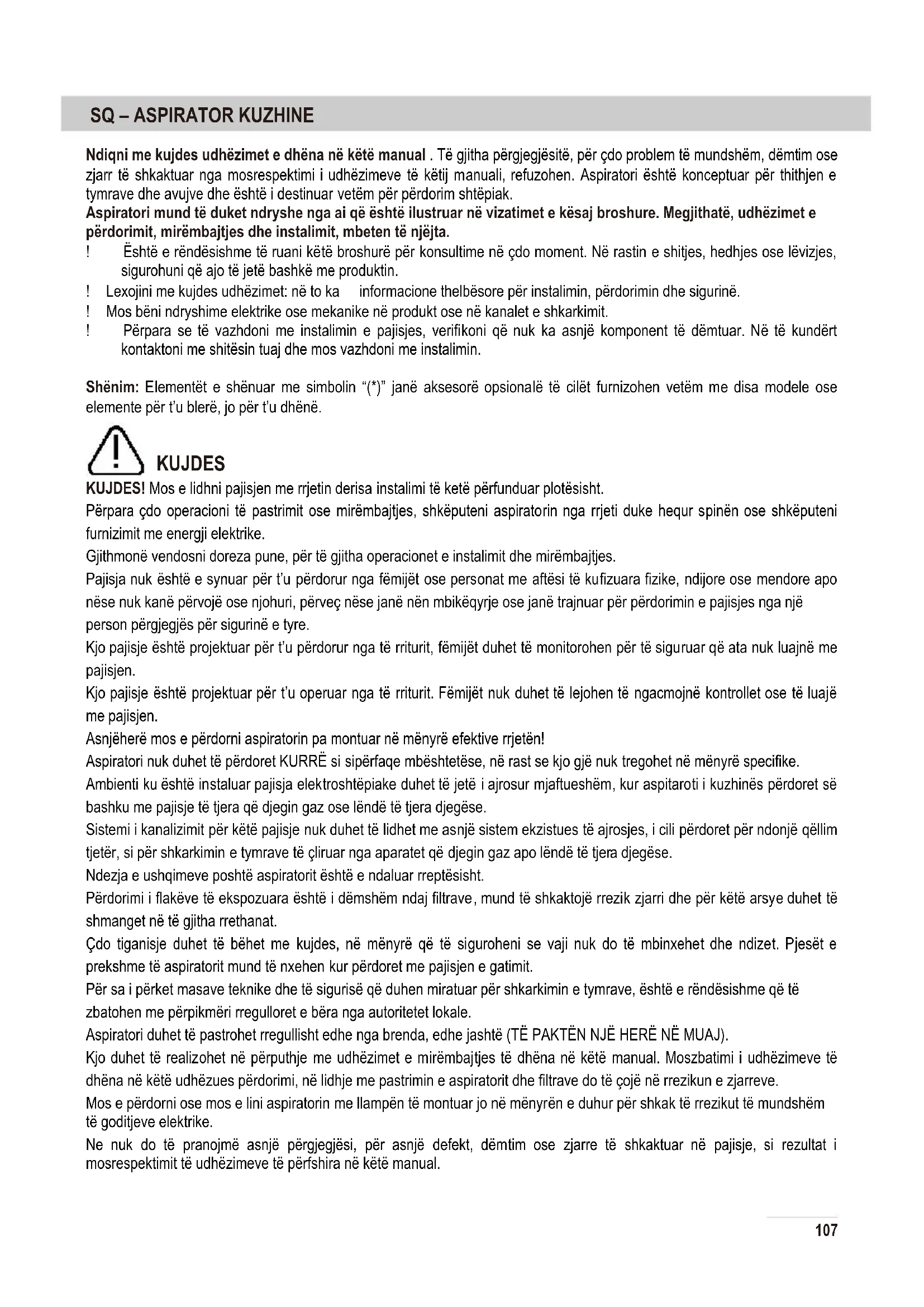 optimera effektiviteten. 106Ndiqni me kujdes udhëzimet e dhëna në këtë manual . Të gjitha përgjegjësitë, për çdo problem të mundshëm, dëmtim ose zjarr të shkaktuar nga mosrespektimi i udhëzimeve të këtij manuali, refuzohen. Aspiratori është konceptuar për thithjen e tymrave dhe avujve dhe është i destinuar vetëm për përdorim shtëpiak. Aspiratori mund të duket ndryshe nga ai që është ilustruar në vizatimet e kësaj broshure. Megjithatë, udhëzimet e përdorimit, mirëmbajtjes dhe instalimit, mbeten të njëjta. ! Është e rëndësishme të ruani këtë broshurë për konsultime në çdo moment. Në rastin e shitjes, hedhjes ose lëvizjes, sigurohuni që ajo të jetë bashkë me produktin. ! Lexojini me kujdes udhëzimet: në to ka informacione thelbësore për instalimin, përdorimin dhe sigurinë. ! Mos bëni ndryshime elektrike ose mekanike në produkt ose në kanalet e shkarkimit. ! Përpara se të vazhdoni me instalimin e pajisjes, verifikoni që nuk ka asnjë komponent të dëmtuar. Në të kundërt kontaktoni me shitësin tuaj dhe mos vazhdoni me instalimin. Shënim: Elementët e shënuar me simbolin “(*)” janë aksesorë opsionalë të cilët furnizohen vetëm me disa modele ose elemente për t’u blerë, jo për t’u dhënë. KUJDES KUJDES! Mos e lidhni pajisjen me rrjetin derisa instalimi të ketë përfunduar plotësisht. Përpara çdo operacioni të pastrimit ose mirëmbajtjes, shkëputeni aspiratorin nga rrjeti duke hequr spinën ose shkëput eni furnizimit me energji elektrike. Gjithmonë vendosni doreza pune, për të gjitha operacionet e instalimit dhe mirëmbajtjes. Pajisja nuk është e synuar për t’u përdorur nga fëmijët ose personat me aftësi të kufizuara fizike, ndijore ose mendore apo nëse nuk kanë përvojë ose njohuri, përveç nëse janë nën mbikëqyrje ose janë trajnuar për përdorimin e pajisjes nga një person përgjegjës për sigurinë e tyre. Kjo pajisje është projektuar për t’u përdorur nga të rriturit, fëmijët duhet të monitorohen për të siguruar që ata nuk luajnë me pajisjen. Kjo pajisje është projektuar për t’u operuar nga të rriturit. Fëmijët nuk duhet të lejohen të ngacmojnë kontrollet ose të luajë
