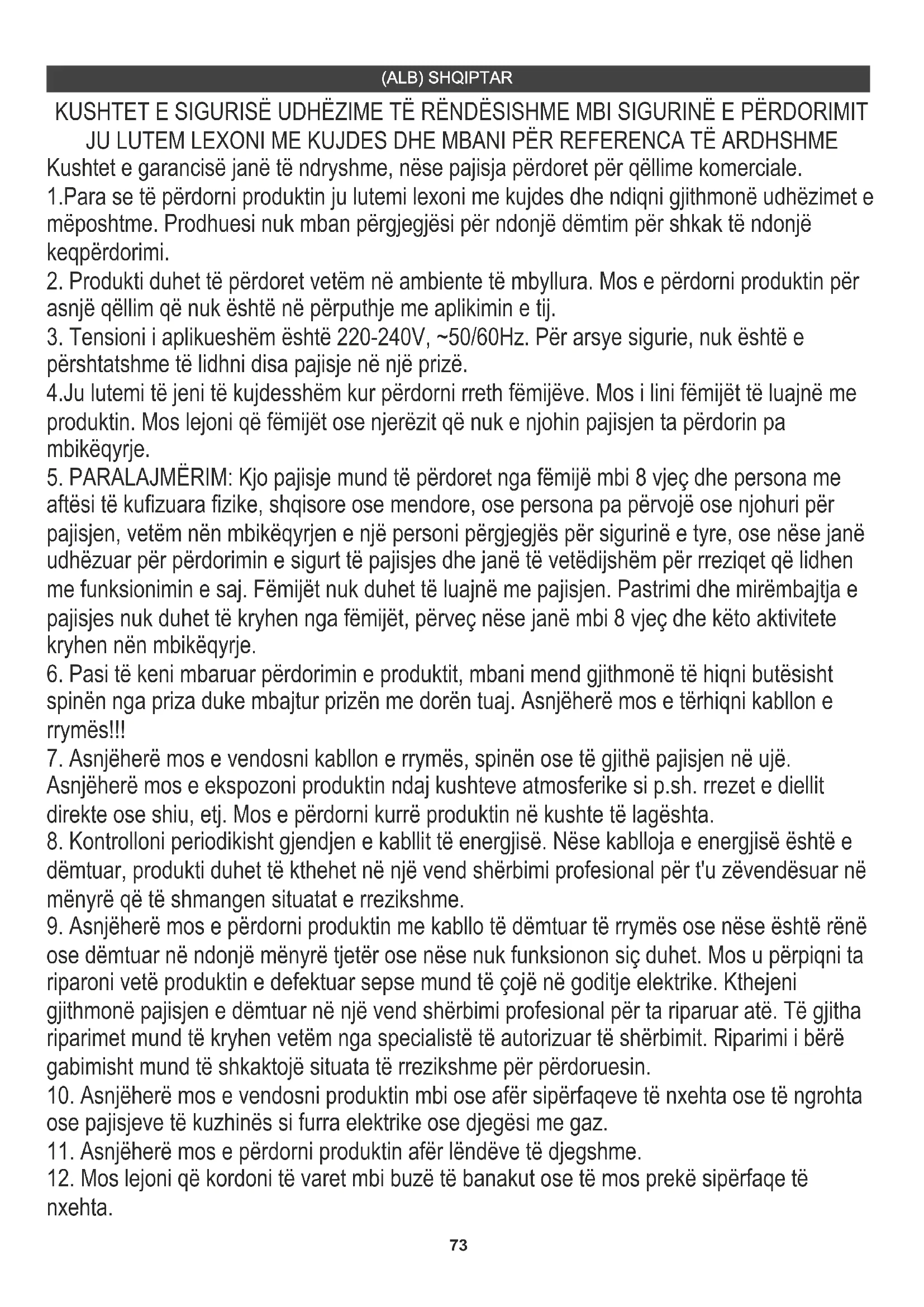aftësi të kufizuara fizike, shqisore ose mendore, ose persona pa përvojë ose njohuri për pajisjen, vetëm nën mbikëqyrjen e një personi përgjegjës për sigurinë e tyre, ose nëse janë udhëzuar për përdorimin e sigurt të pajisjes dhe janë të vetëdijshëm për rreziqet që lidhen me funksionimin e saj. Fëmijët nuk duhet të luajnë me pajisjen. Pastrimi dhe mirëmbajtja e pajisjes nuk duhet të kryhen nga fëmijët, përveç nëse janë mbi 8 vjeç dhe këto aktivitete kryhen nën mbikëqyrje.